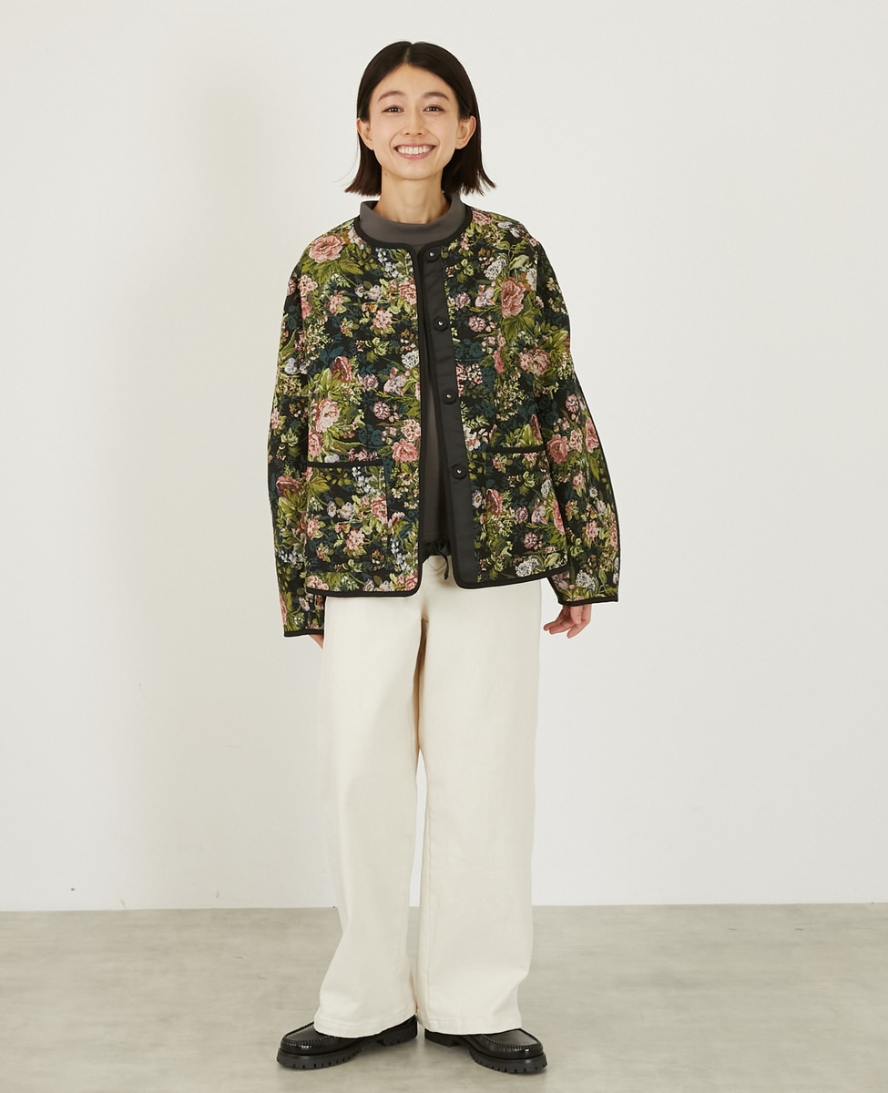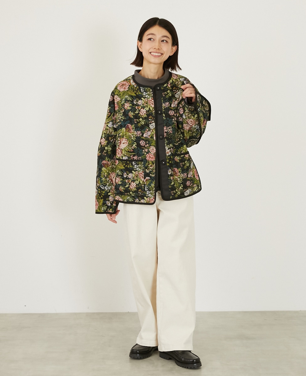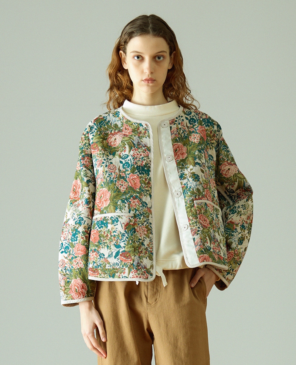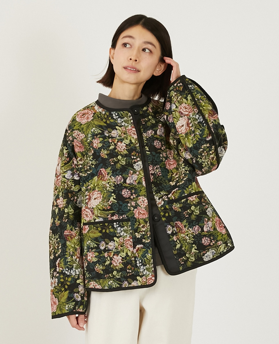 立体的な袖とパイピングデザインがポイントのノーカラージャケット。フロントスナップ開きでカーディガン感覚で着用出来る一枚。コートのしたから柄を覗かせてもオシャレ◎