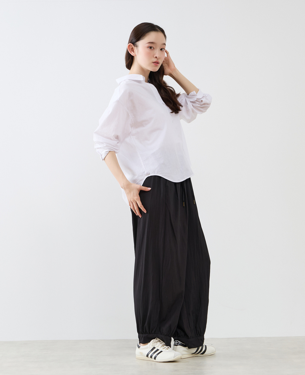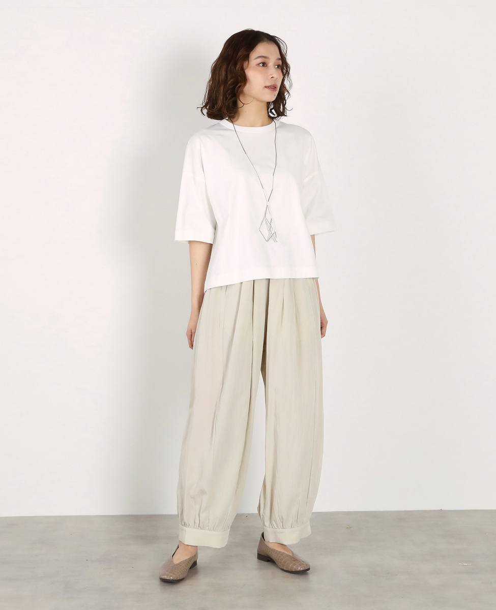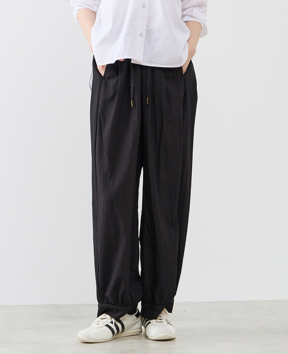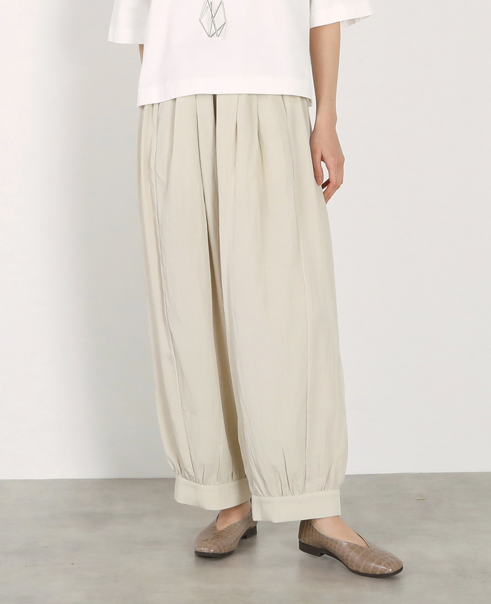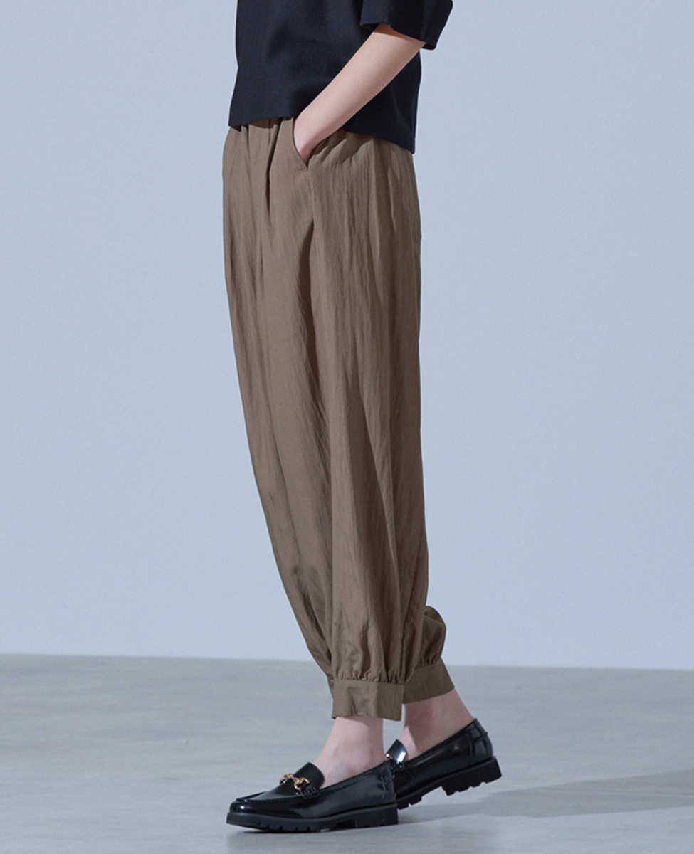 丸みのあるシルエットのコクーンギャザーパンツ。微光沢のあるレーヨンナイロン素材を使用し軽くて涼しい快適な一枚。ウエストはゴム仕様でリラックス感のある穿き心地です。