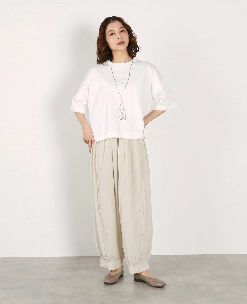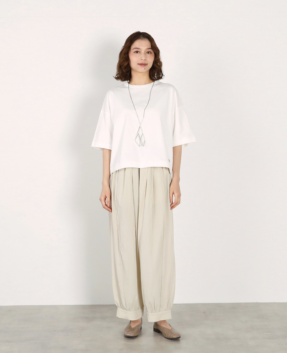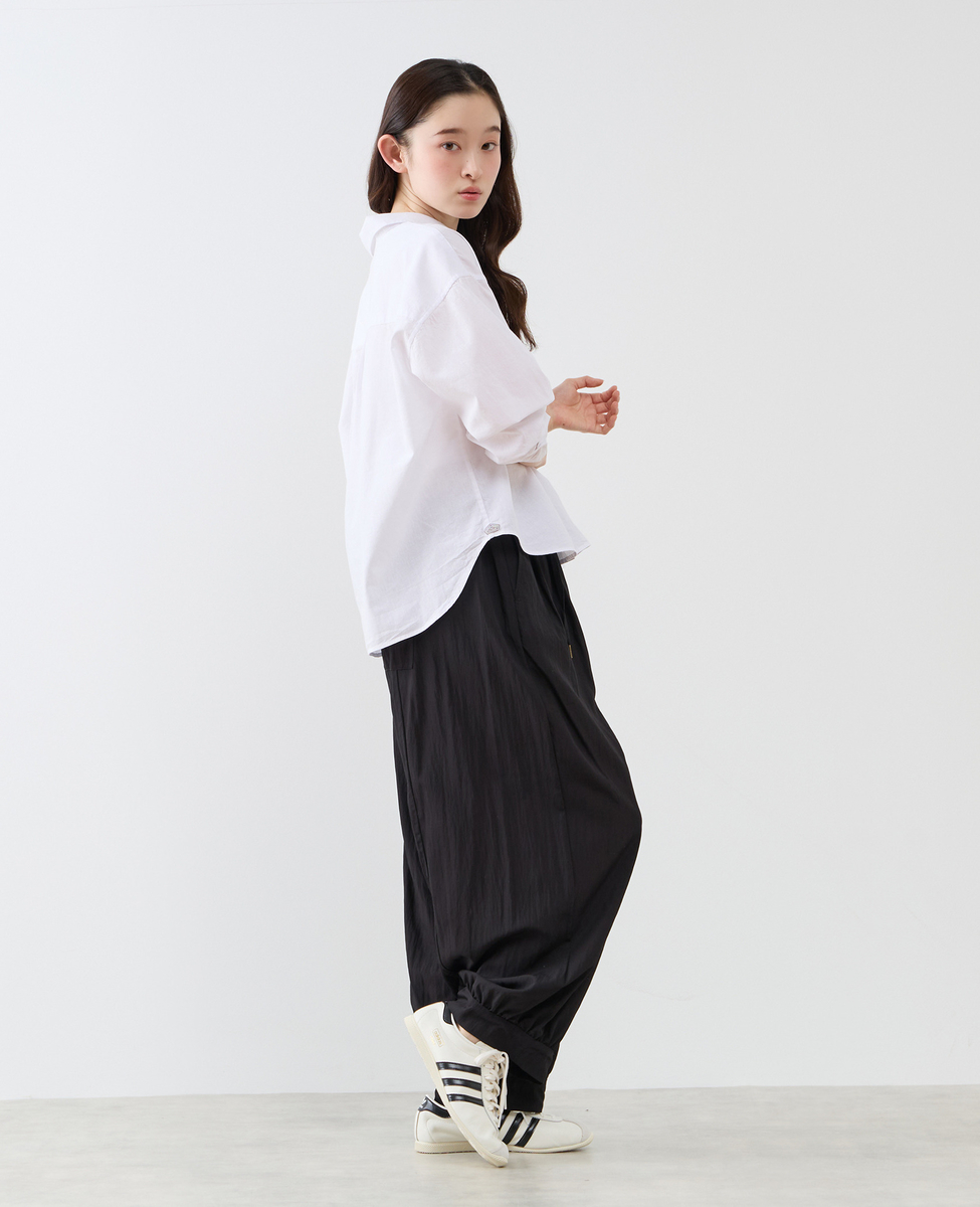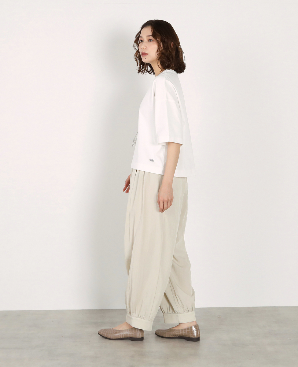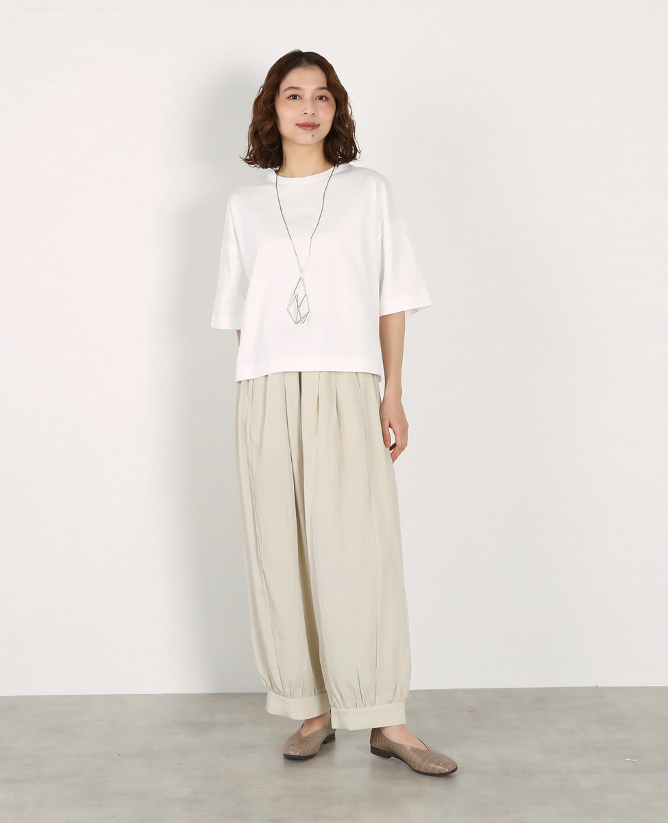 丸みのあるシルエットのコクーンギャザーパンツ。微光沢のあるレーヨンナイロン素材を使用し軽くて涼しい快適な一枚。ウエストはゴム仕様でリラックス感のある穿き心地です。