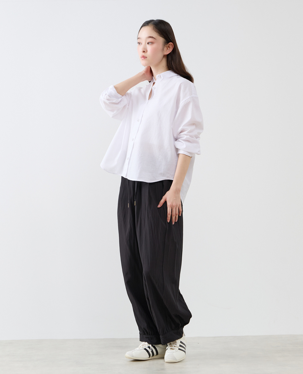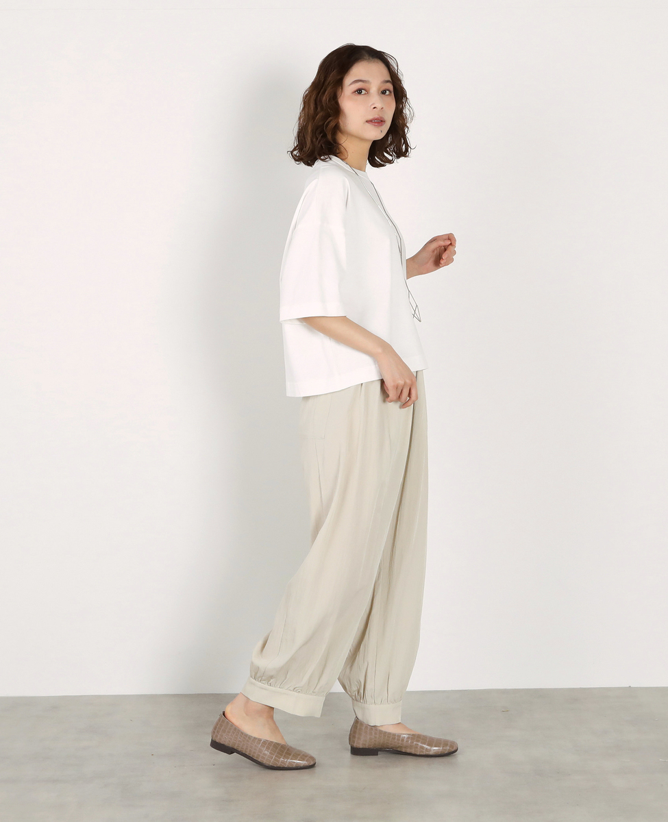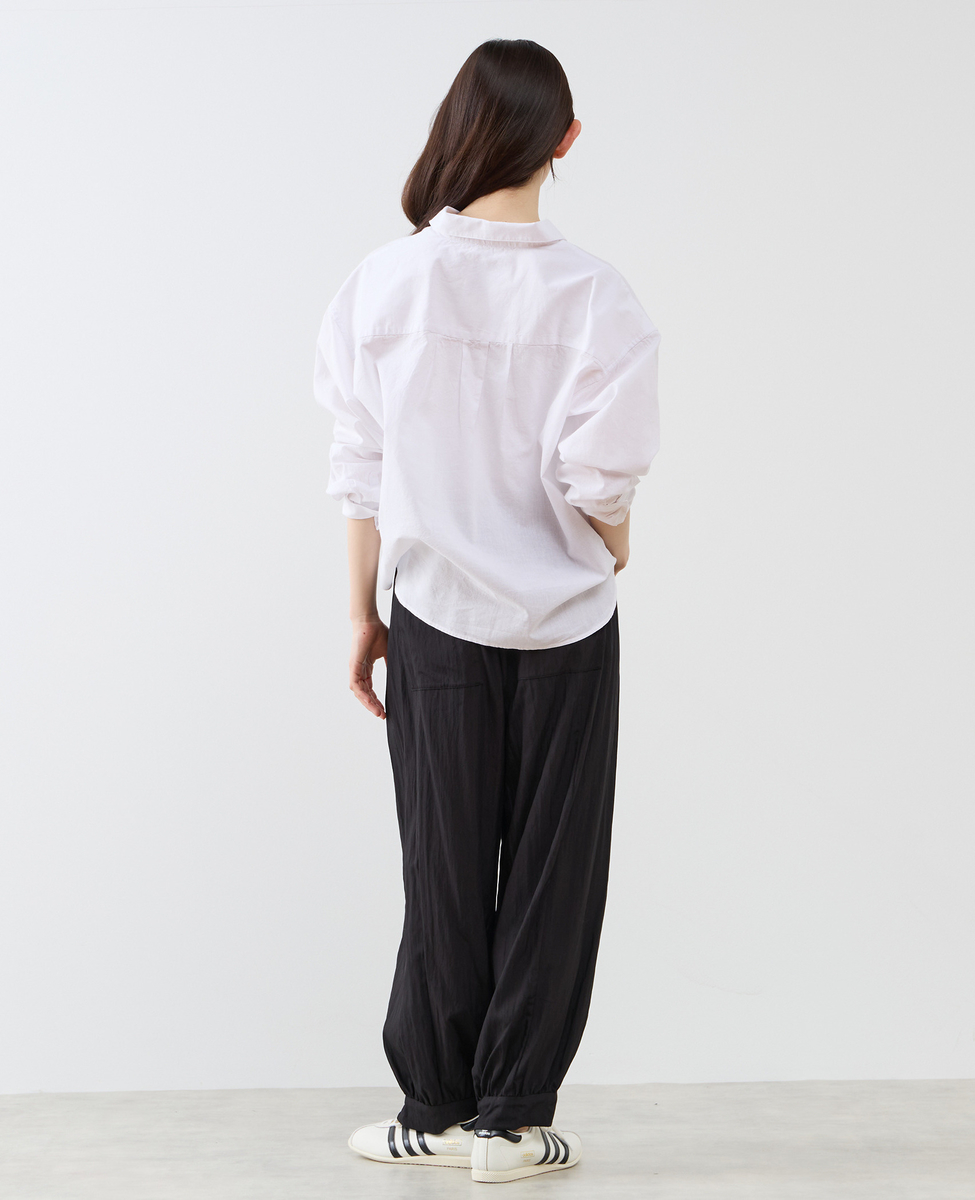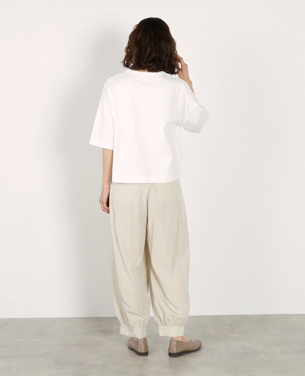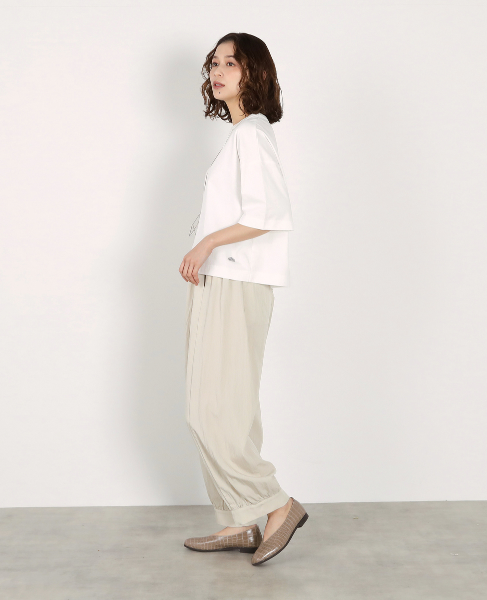 丸みのあるシルエットのコクーンギャザーパンツ。微光沢のあるレーヨンナイロン素材を使用し軽くて涼しい快適な一枚。ウエストはゴム仕様でリラックス感のある穿き心地です。