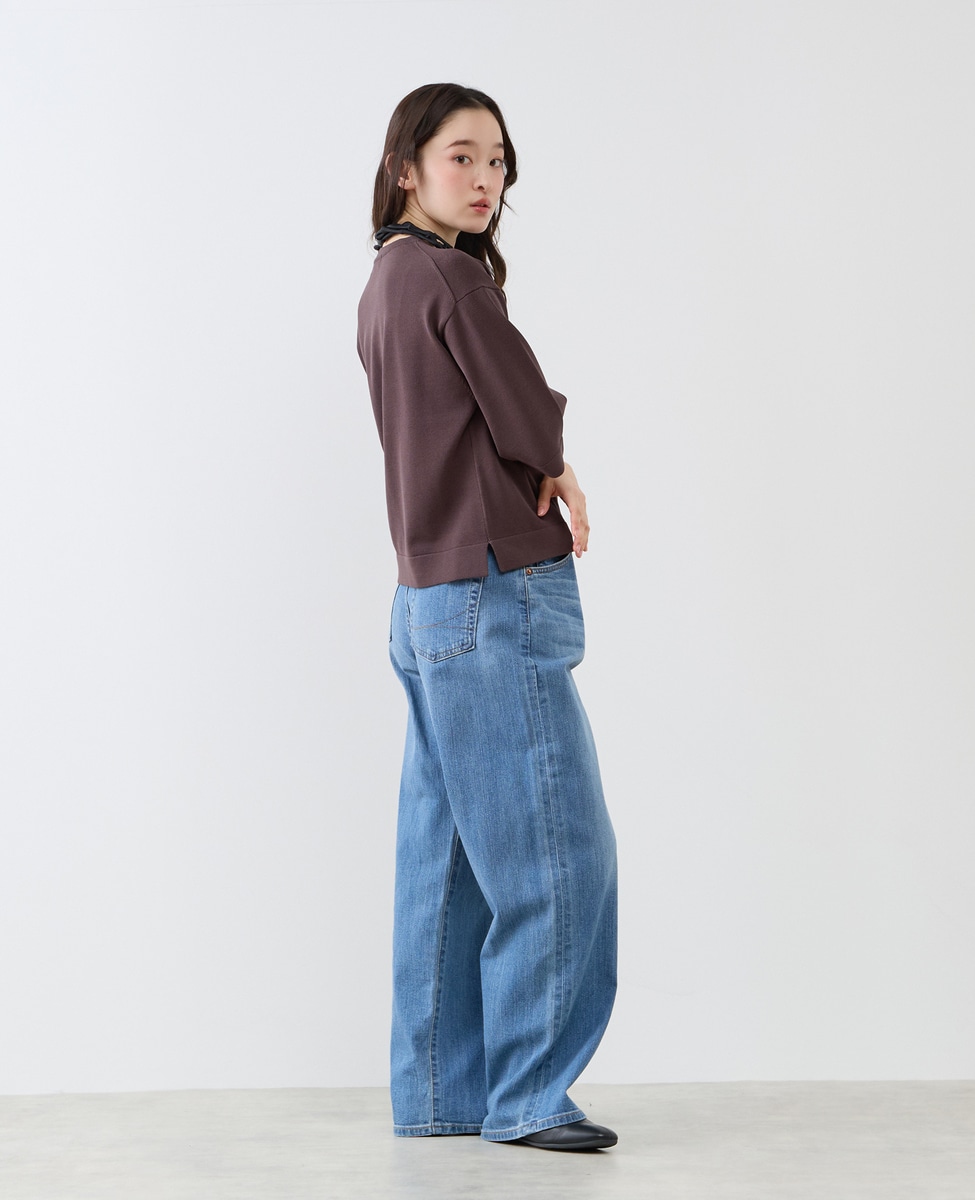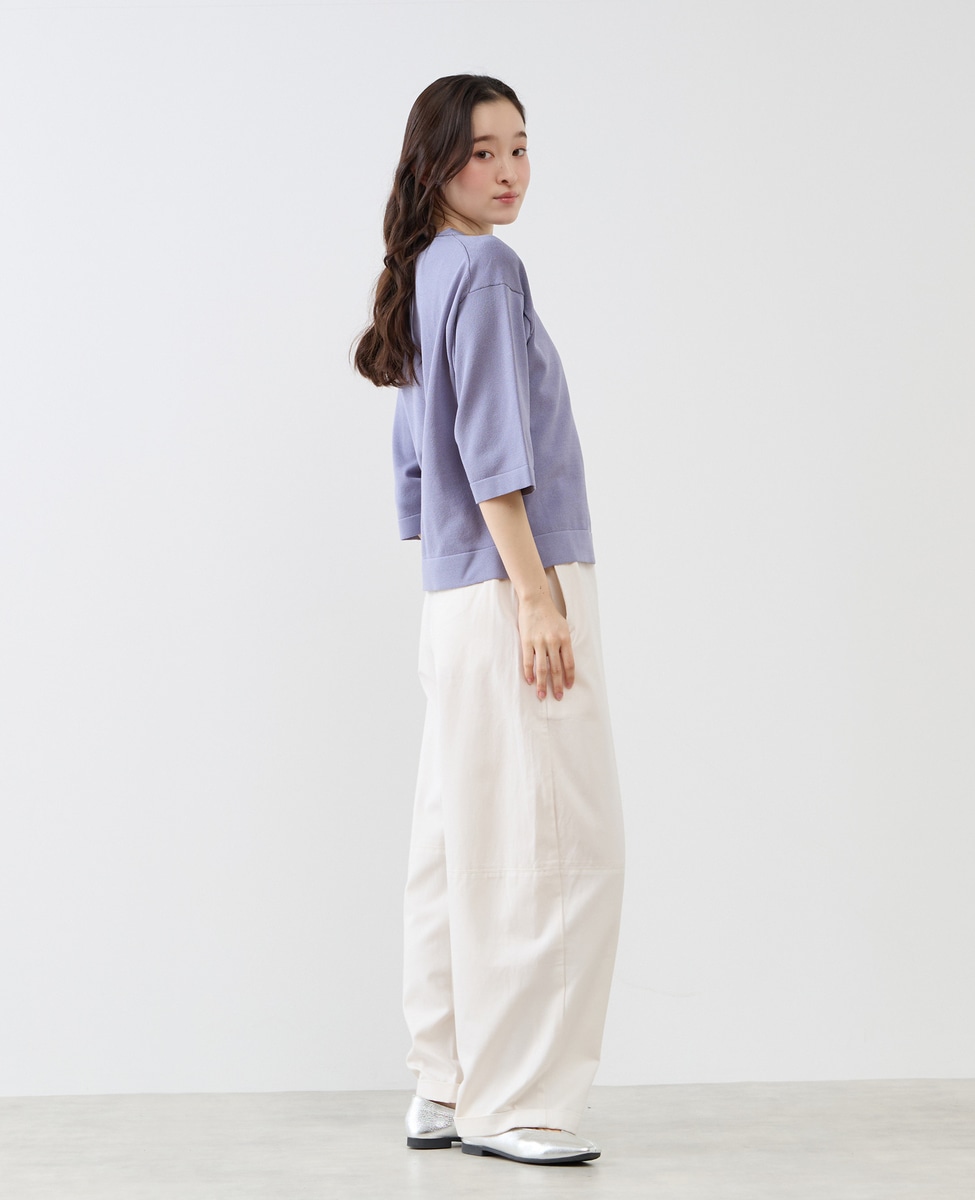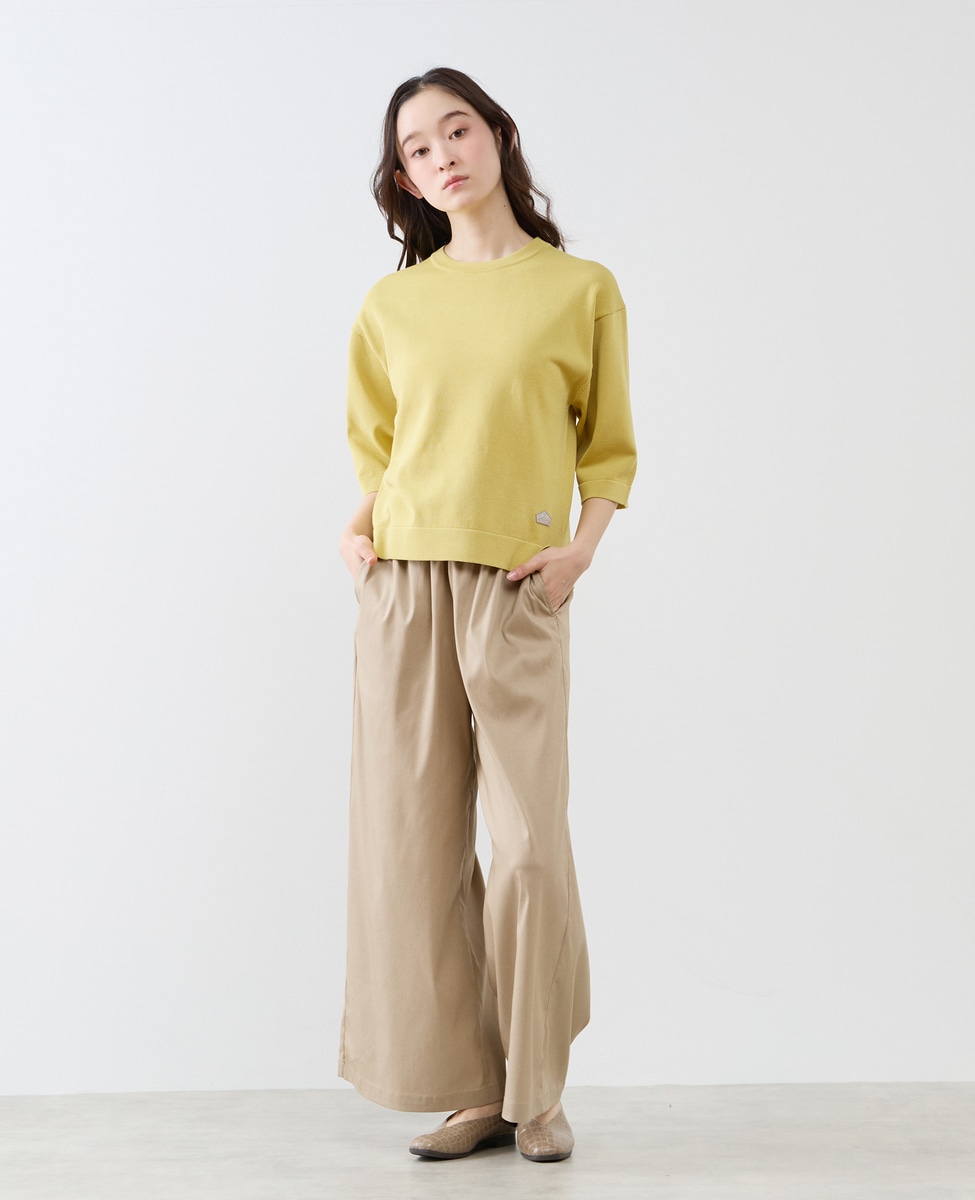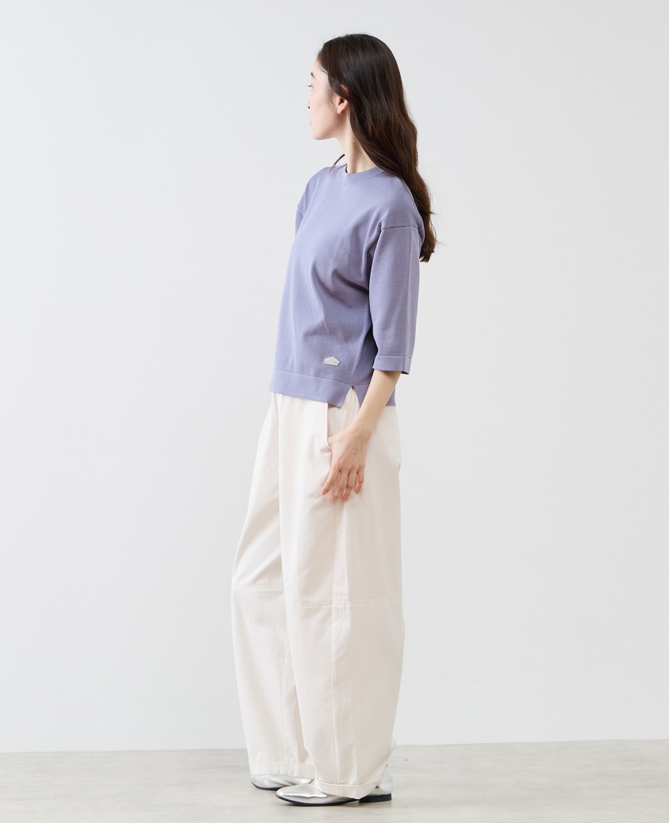 肘の隠れる袖丈のクルーネック、シンプルでインナーとしての活躍も初夏に向けて一枚着で大人っぽく着用もしていただけます。フロント左裾にLOGEMENT DE CLAIRE のフエルトワッペンが付きます。同じ編地のカーディガンと合わせても素敵です。