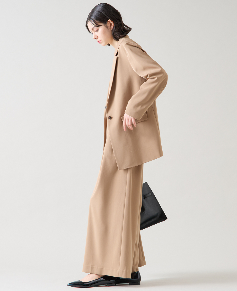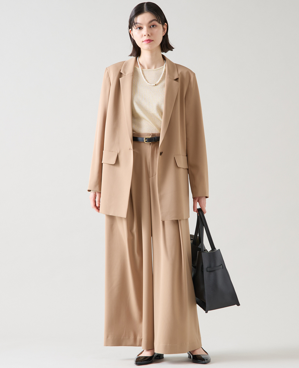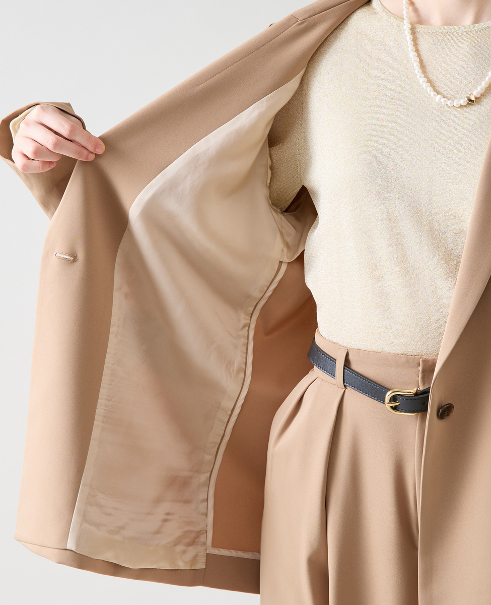 大きすぎない衿がダブルのジャケットでも女性らしい雰囲気に。