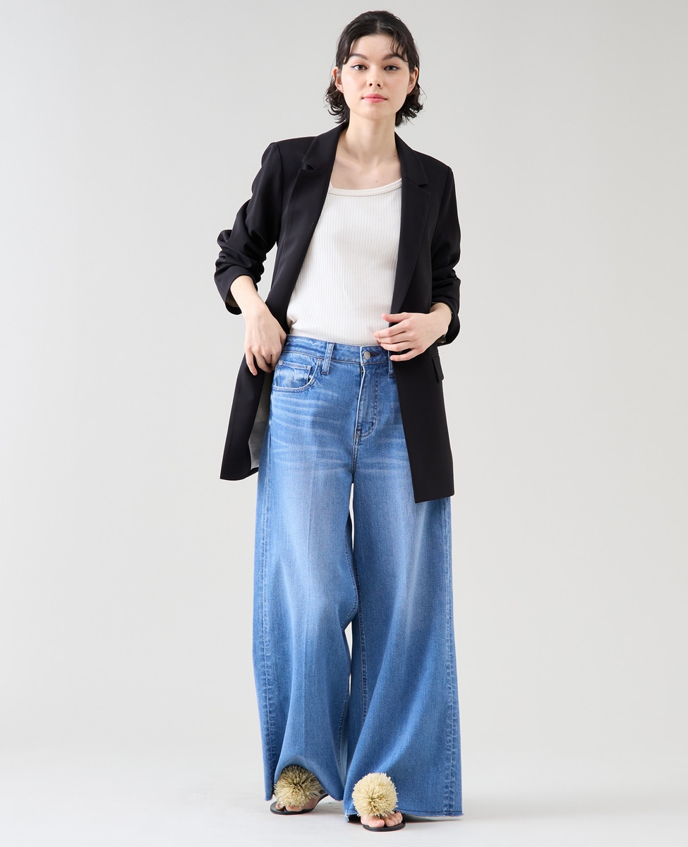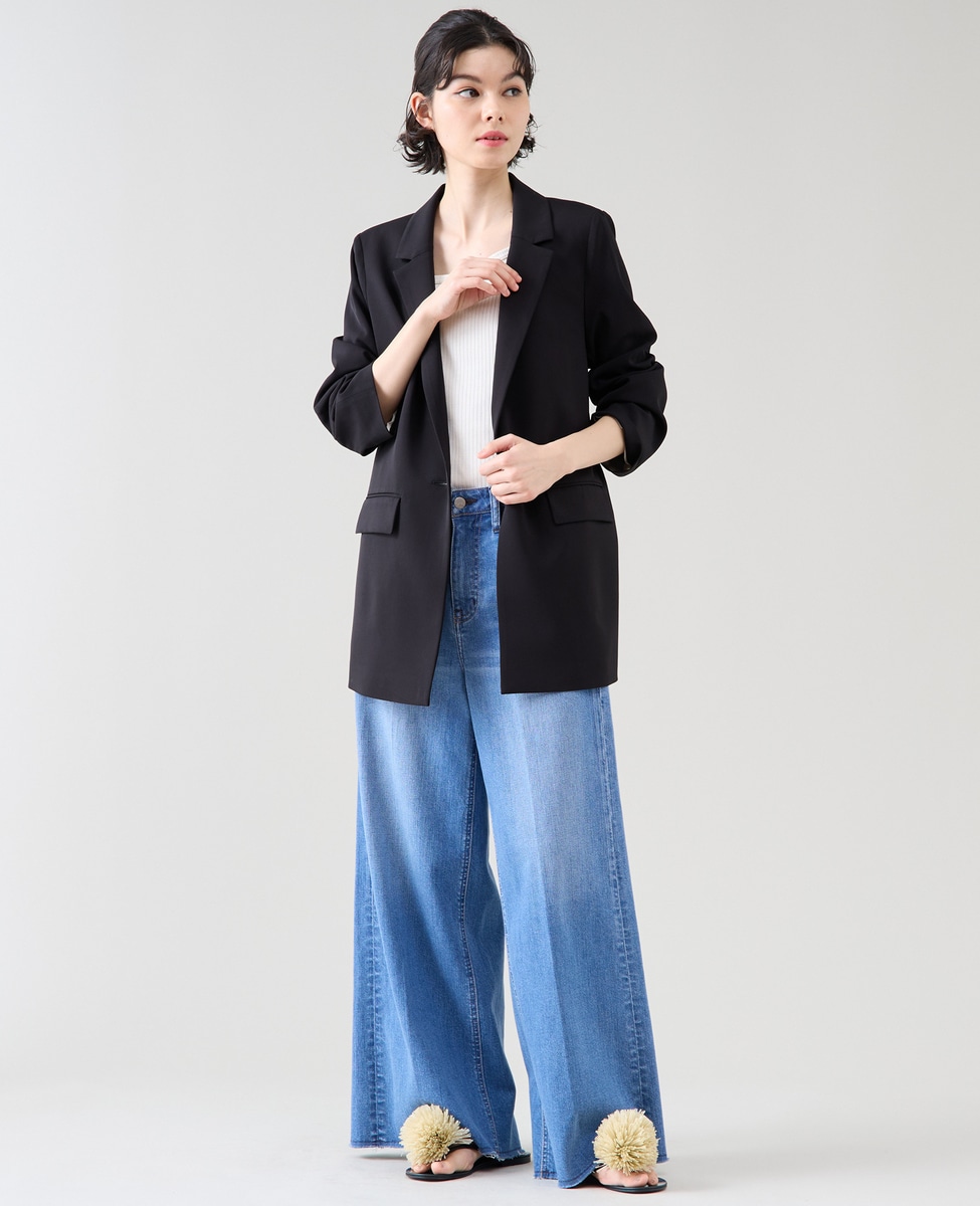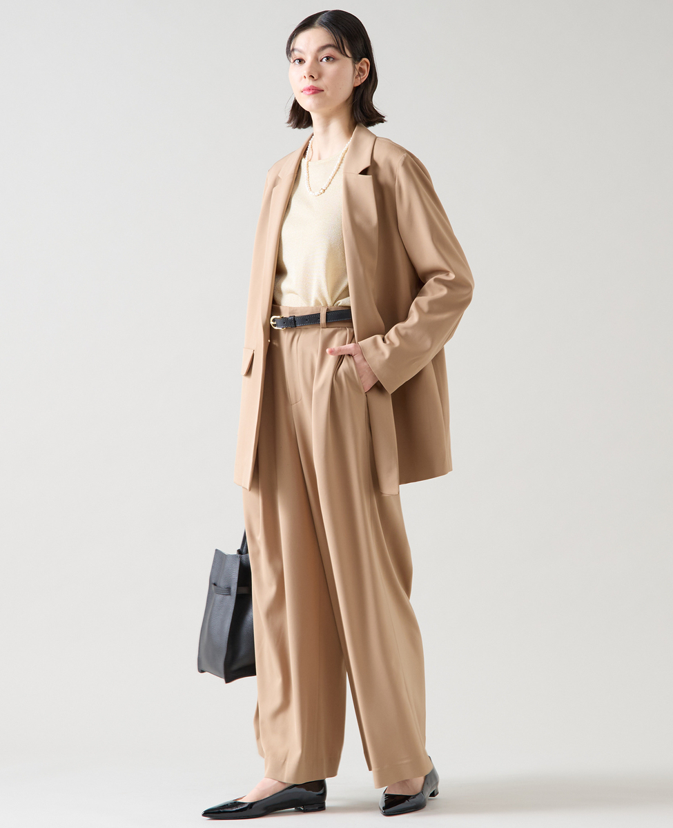 大きすぎない衿がダブルのジャケットでも女性らしい雰囲気に。