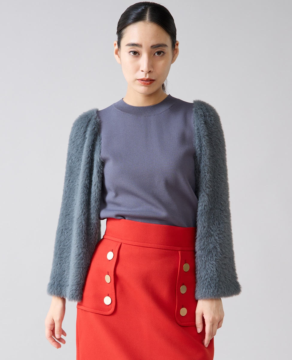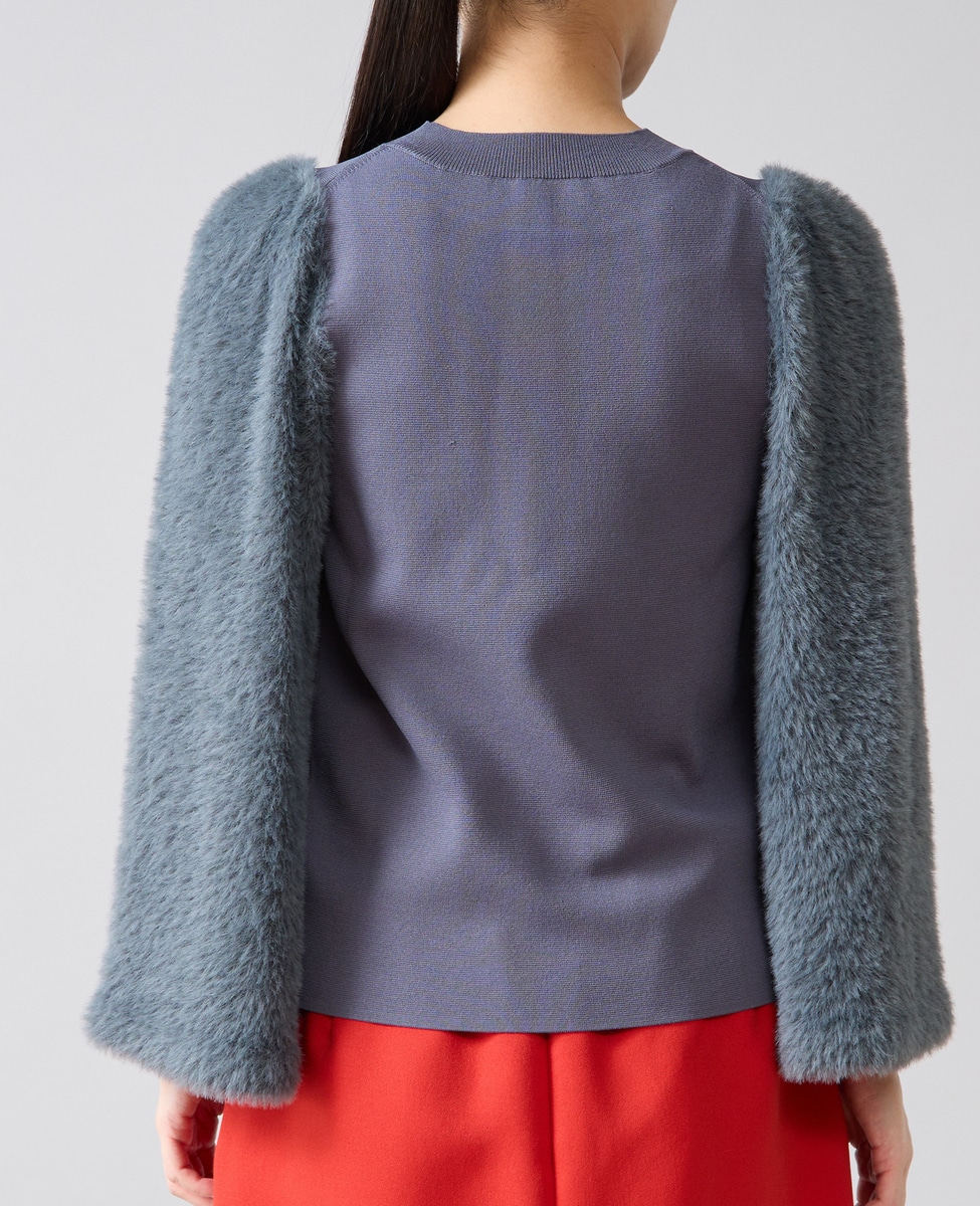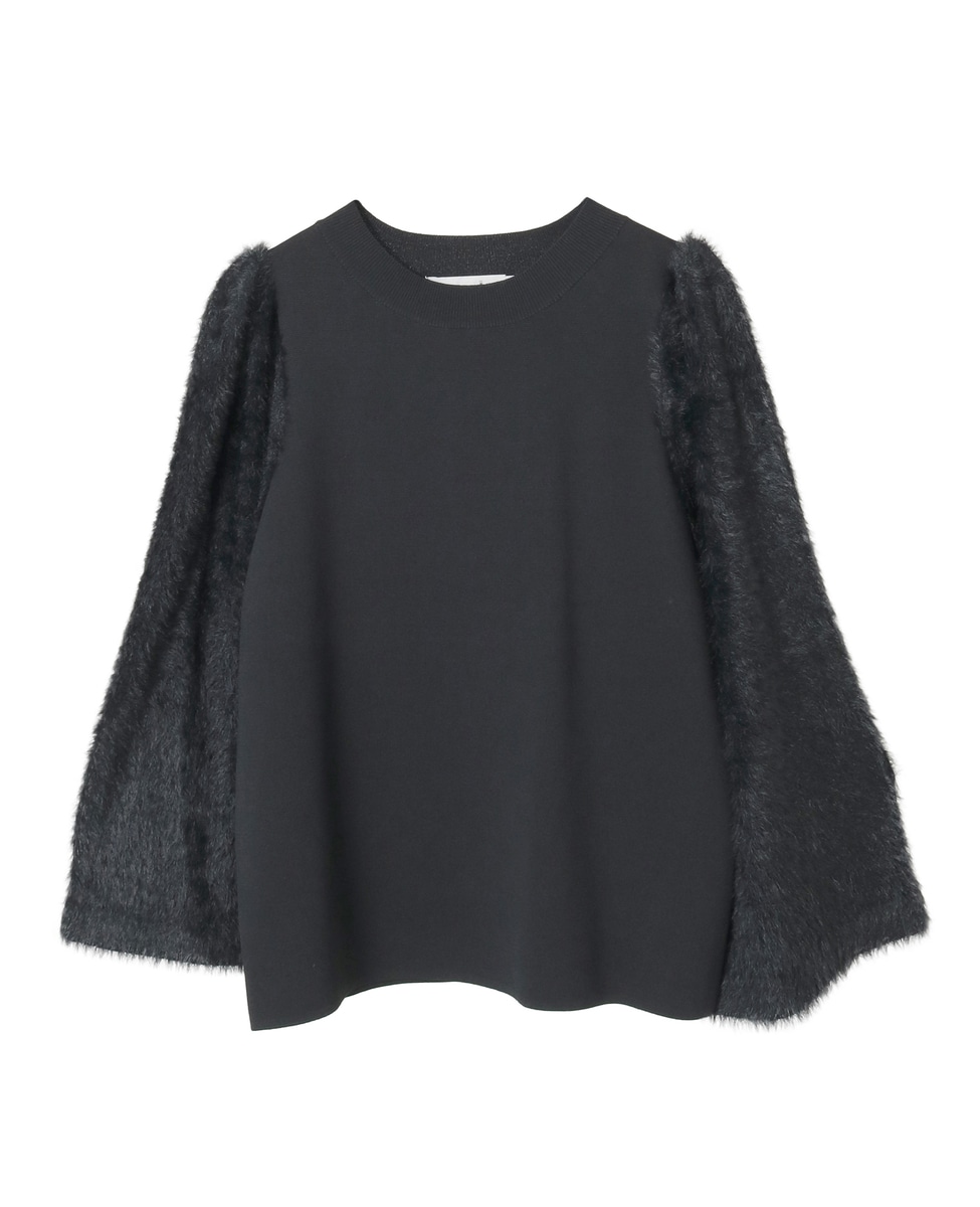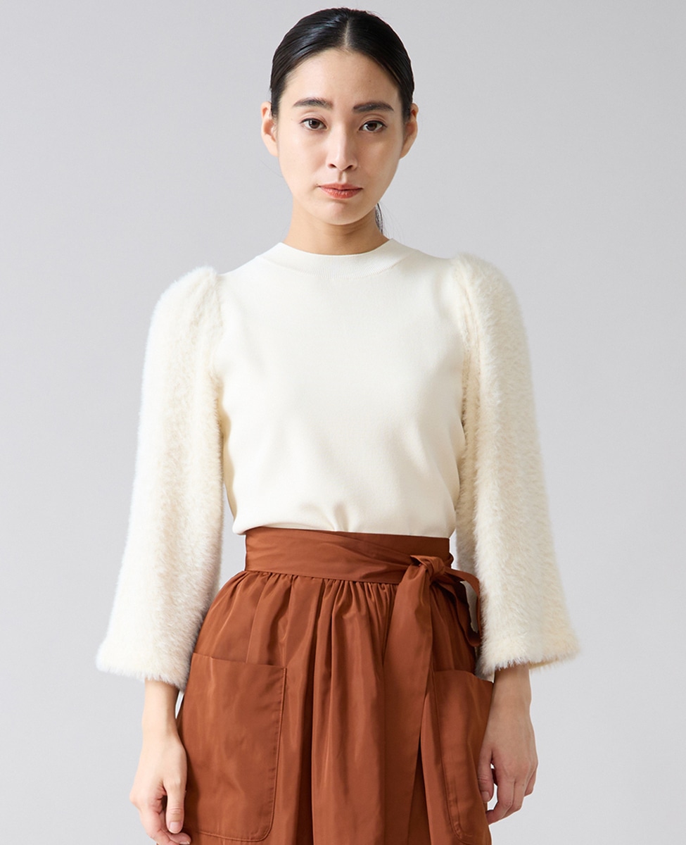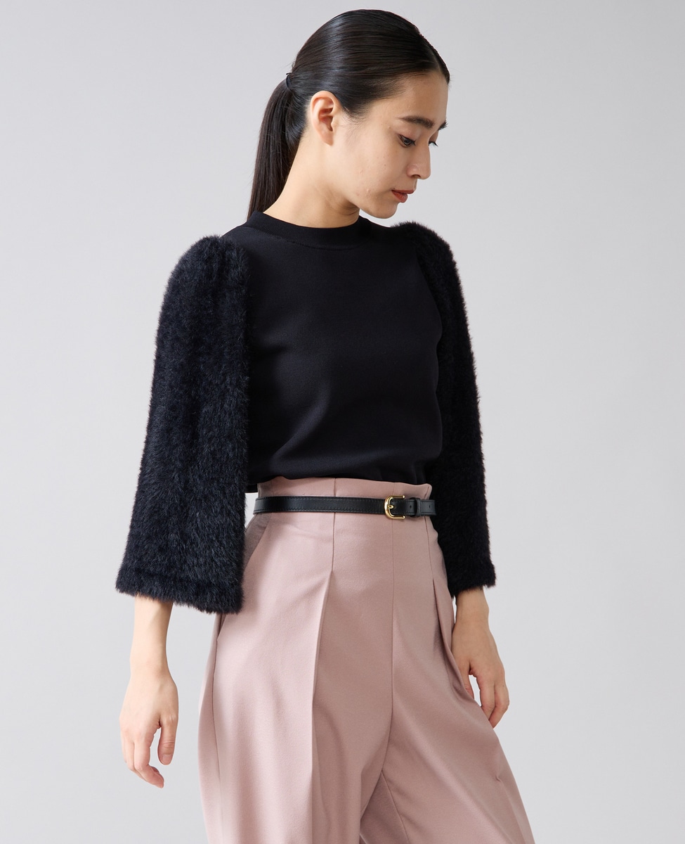 袖に毛足の長いフェザーを施したスリーブコンシャストップス。