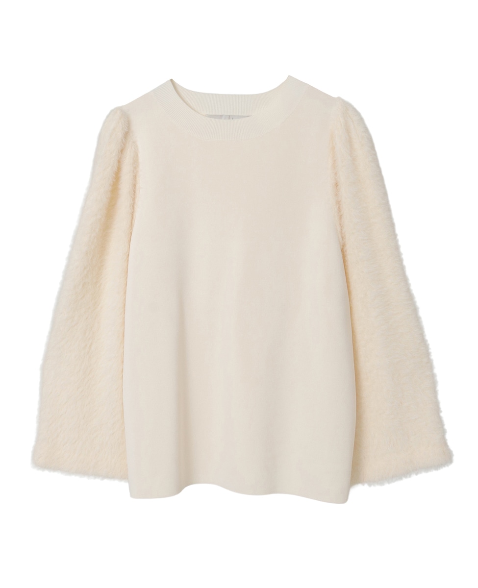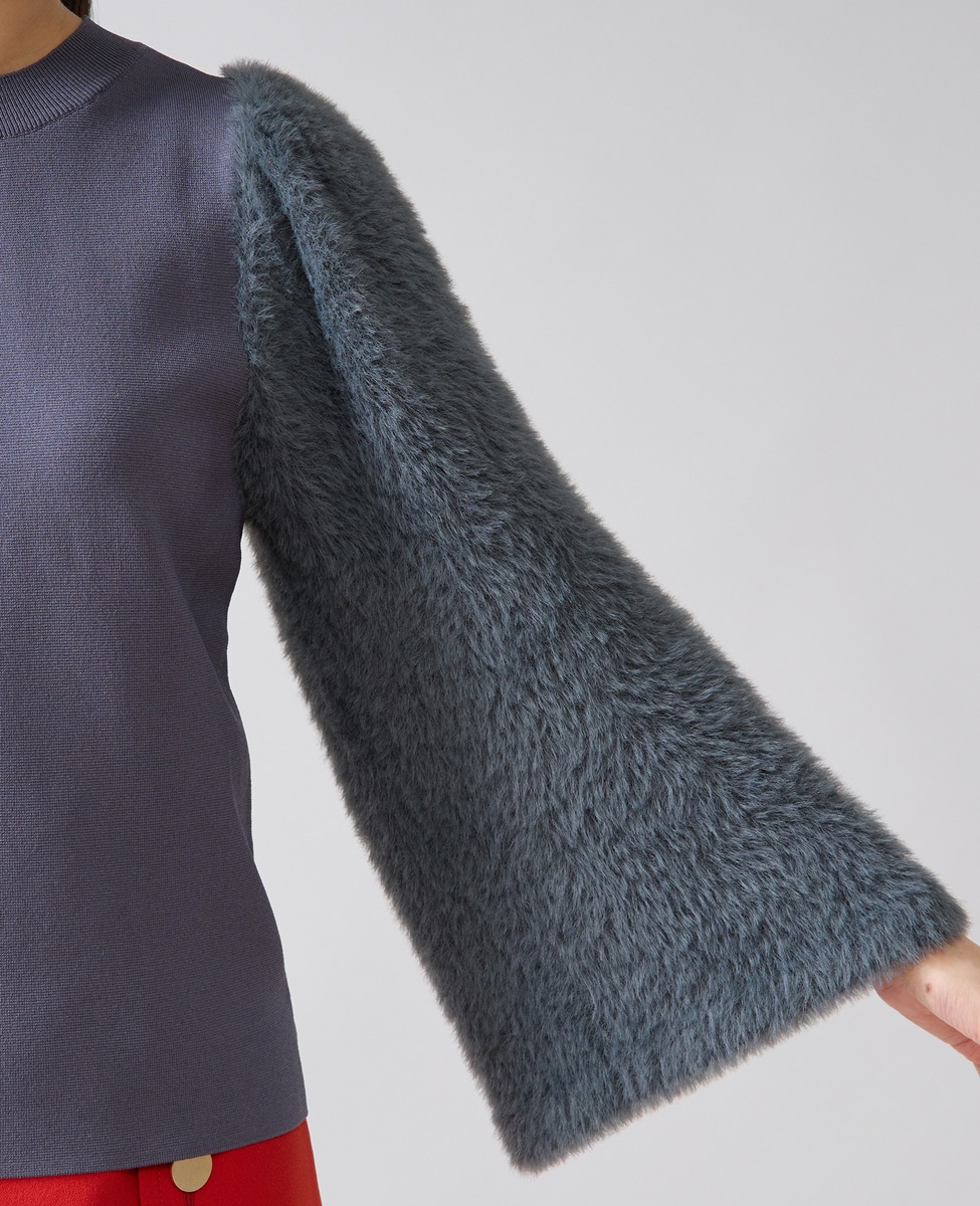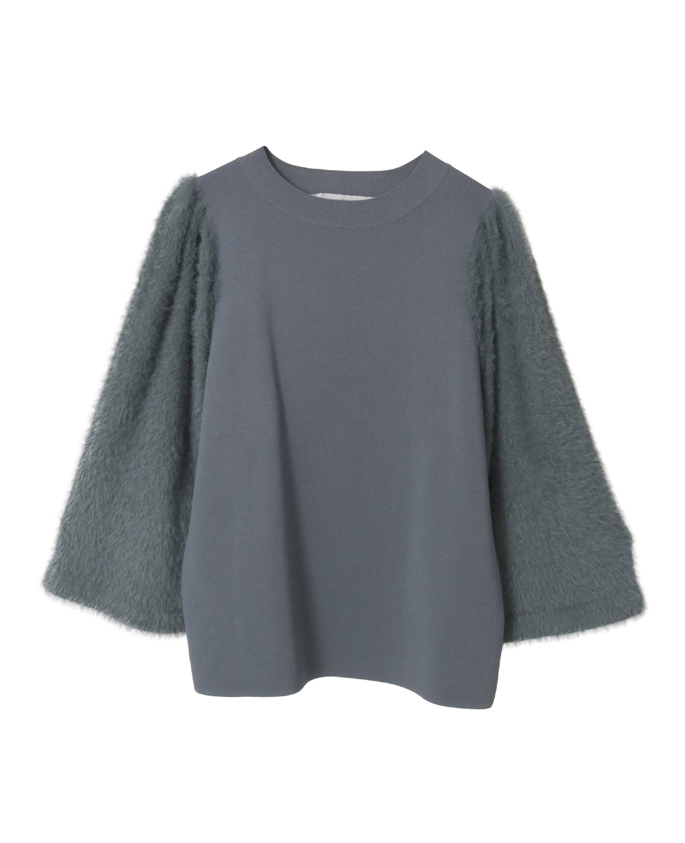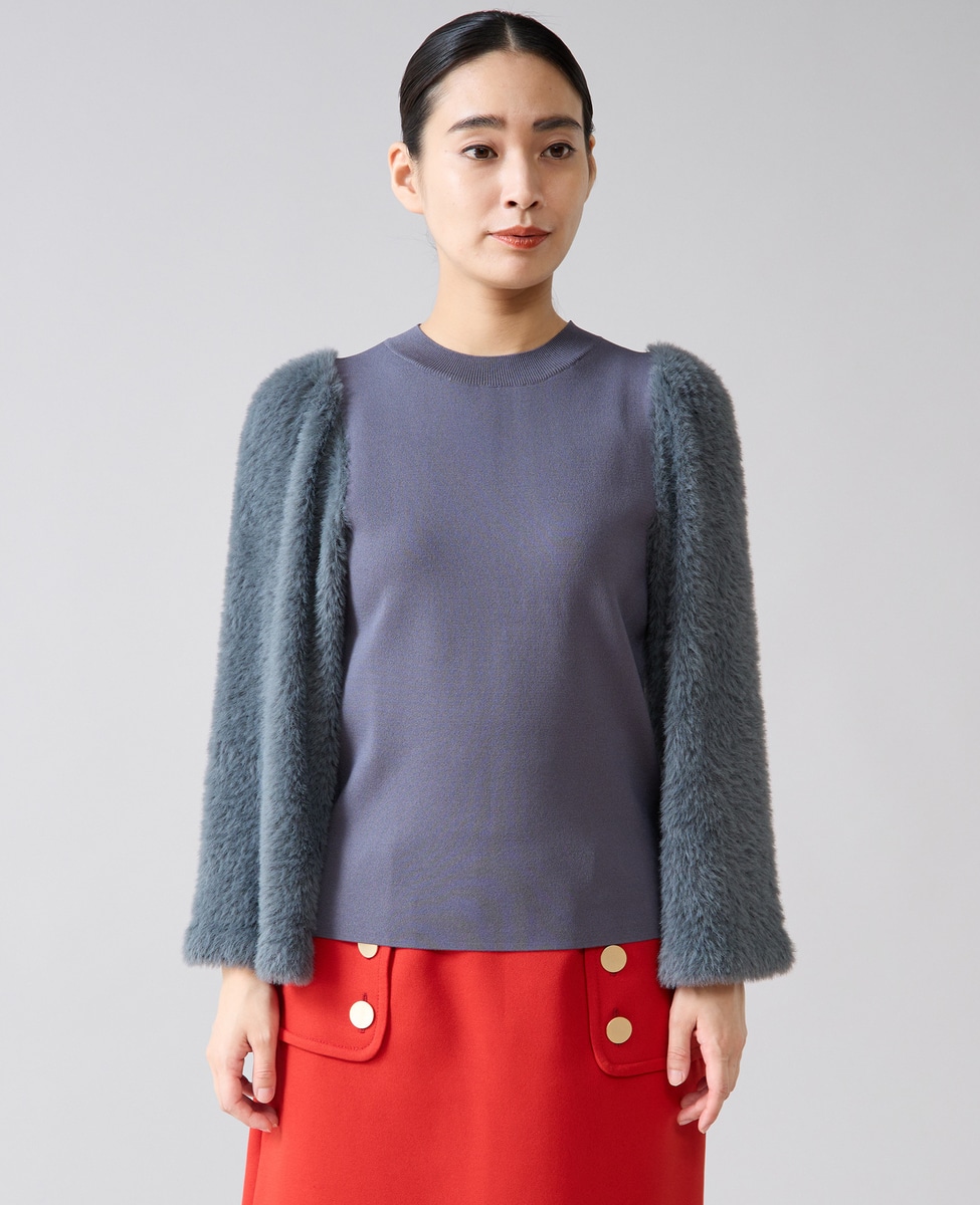 袖に毛足の長いフェザーを施したスリーブコンシャストップス。