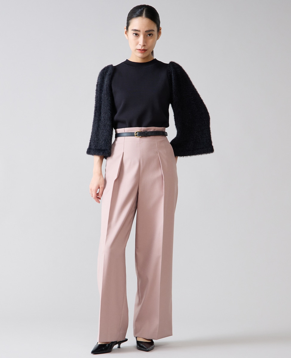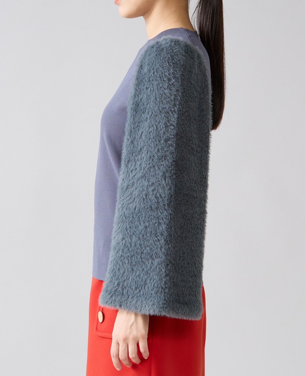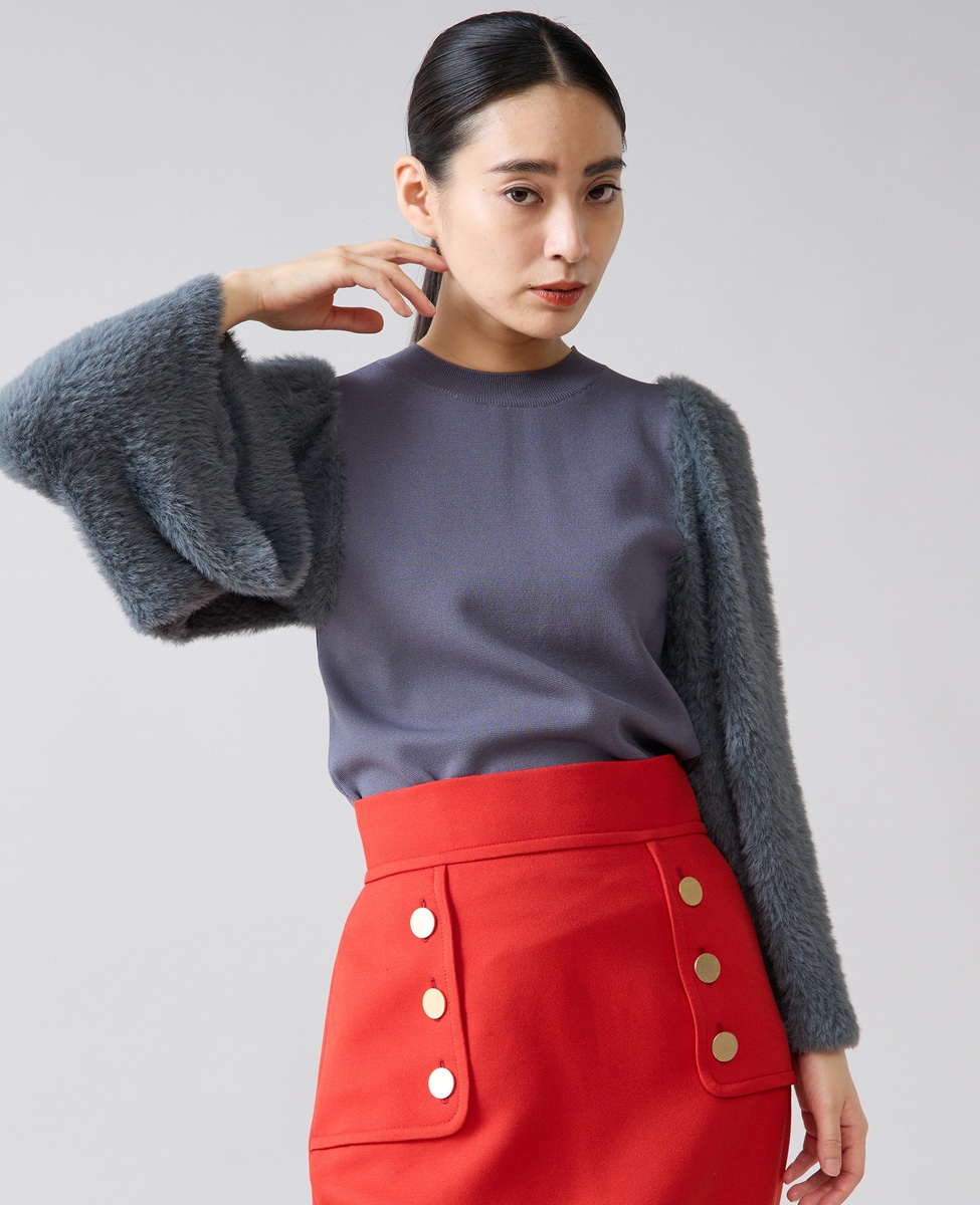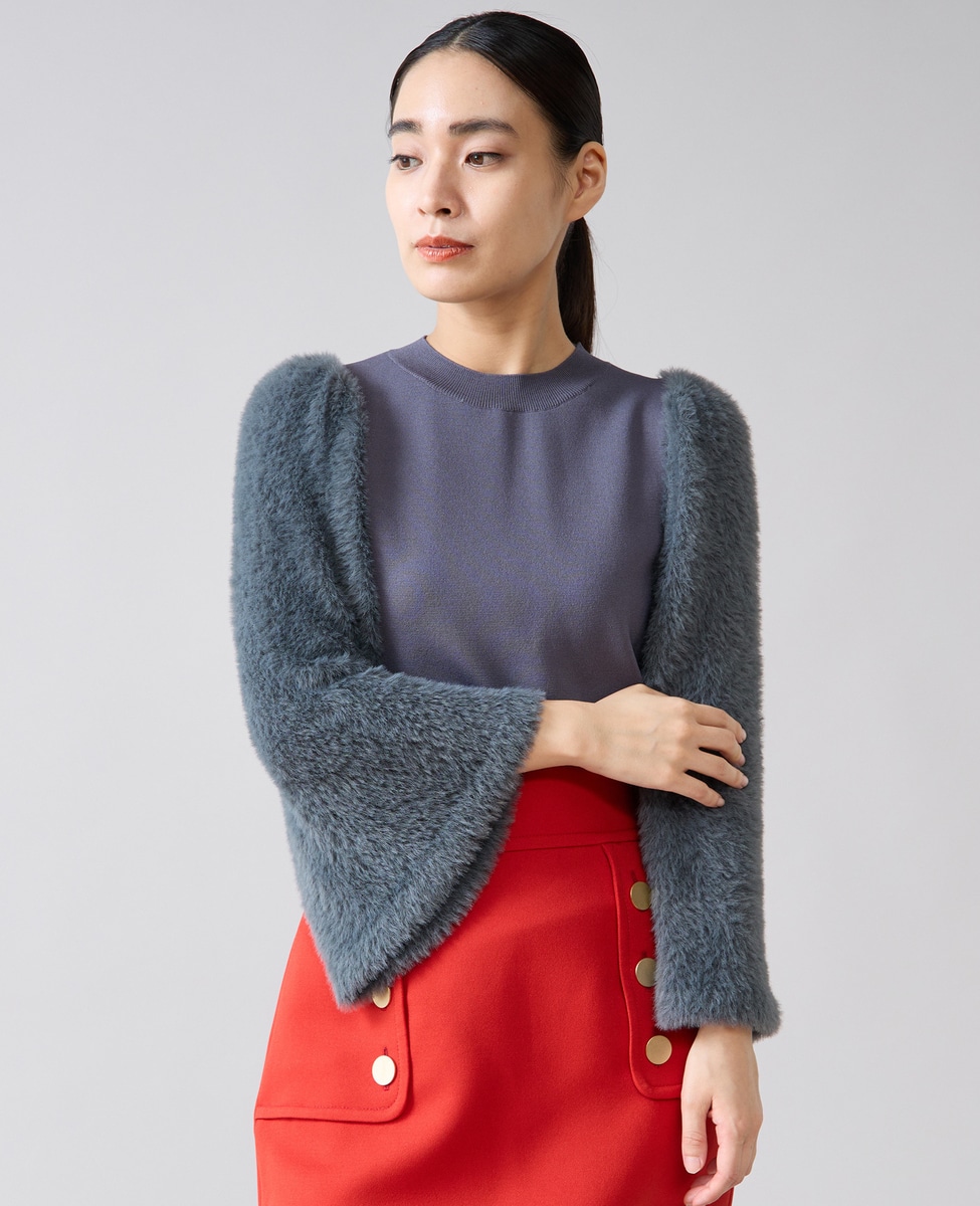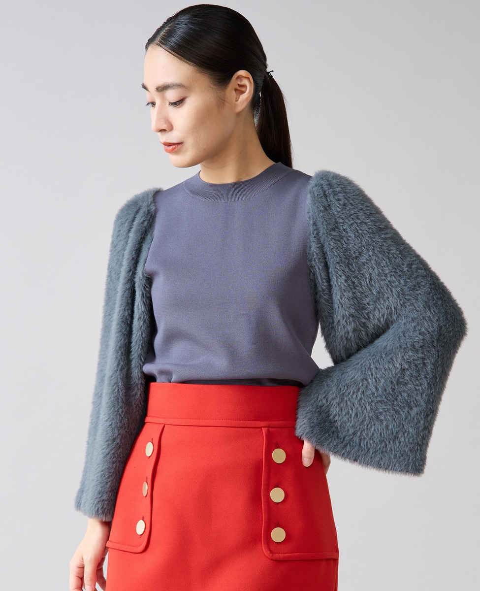 袖に毛足の長いフェザーを施したスリーブコンシャストップス。
