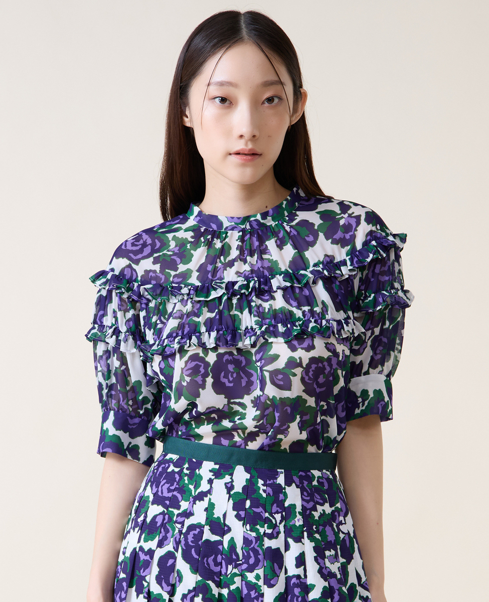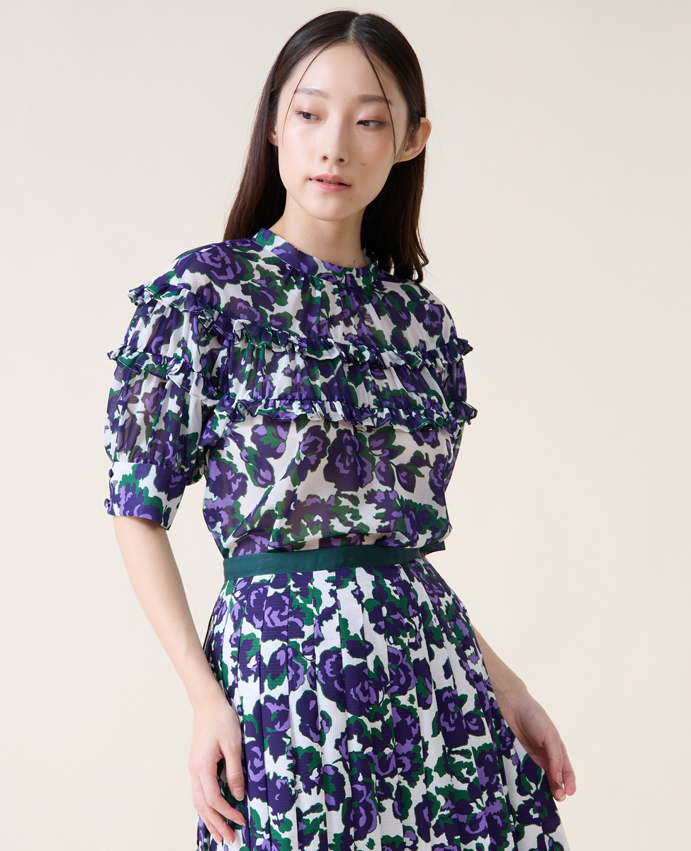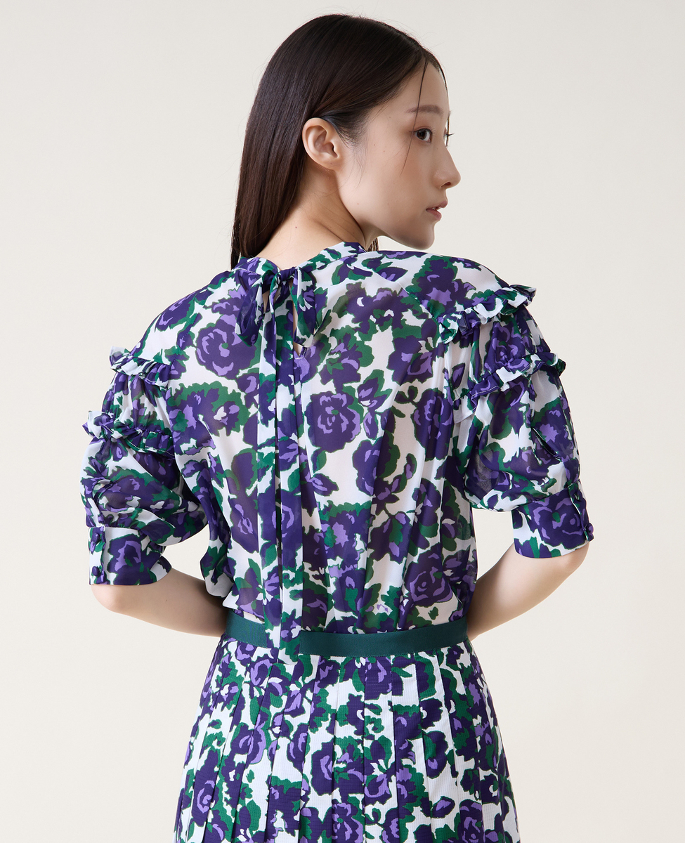 オールドローズプリントヨークフリルブラウス