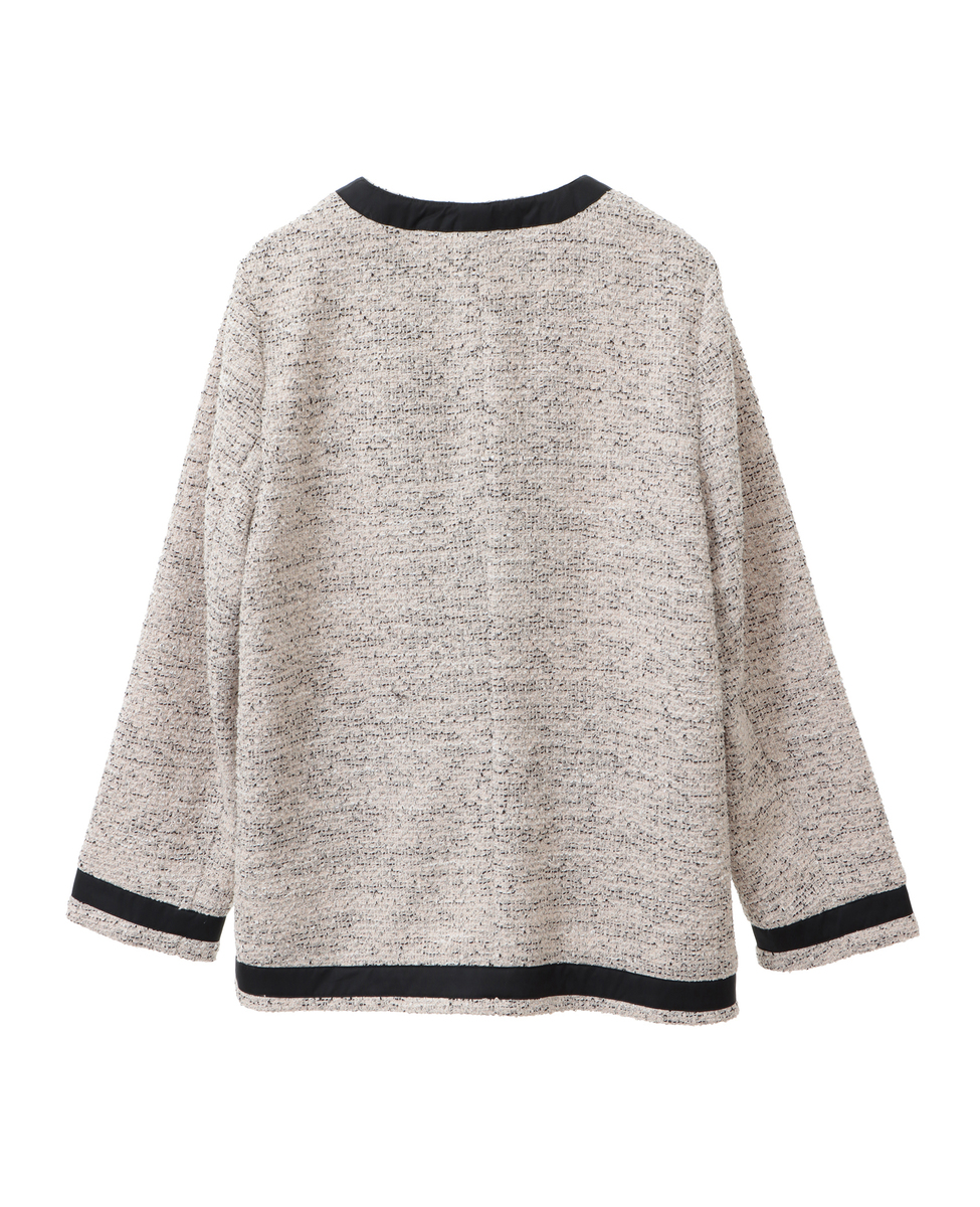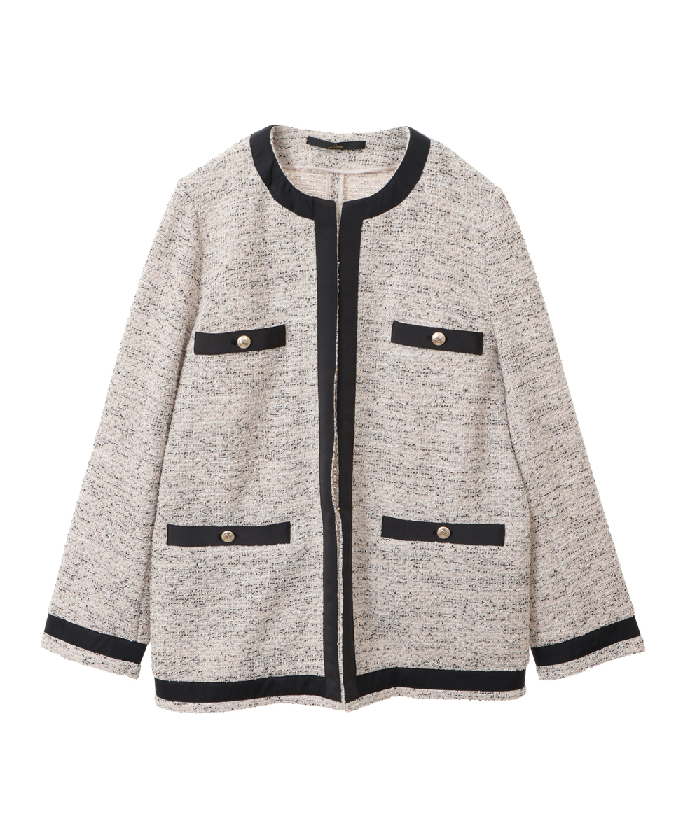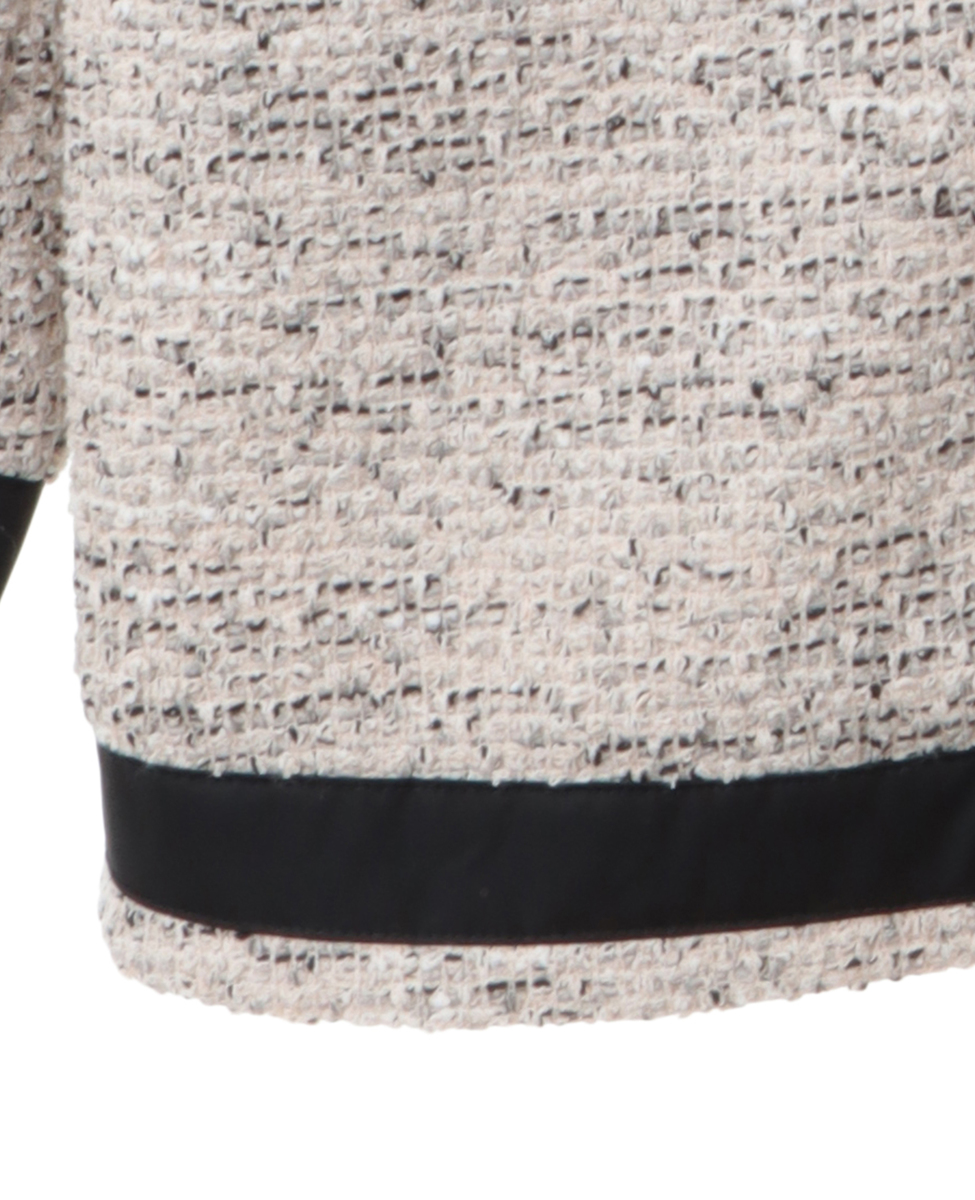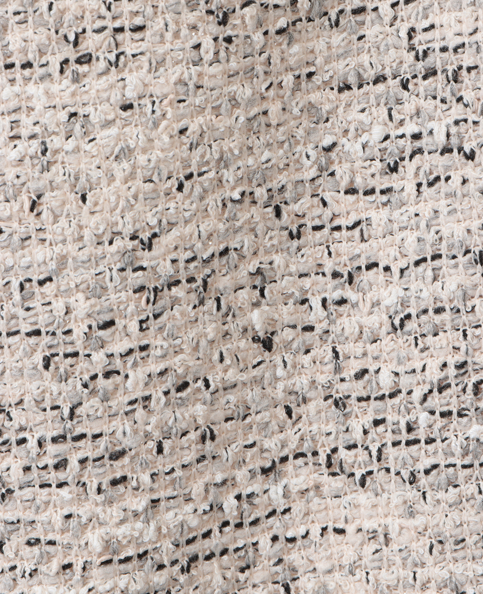 リングヤーンをふんだんに使用したニットツィード。ミックス感と表面感が合わさった新しいツィードでニットの伸縮性もある素材です。いつもと異なるミックスツィードを使うことにより上品感のある、アイテムとなっております。デニムやきれめのボトム合わせがおすすめです。