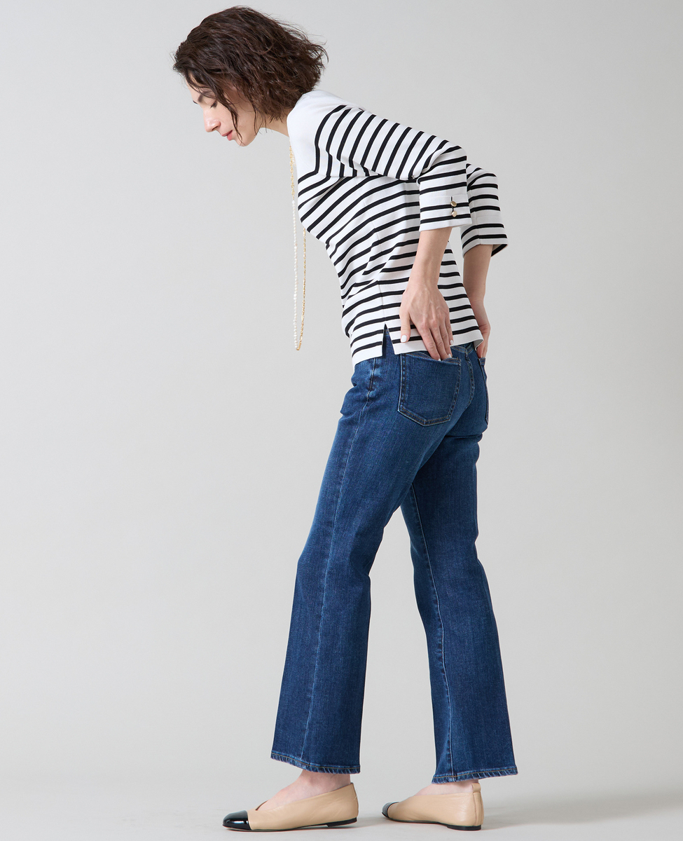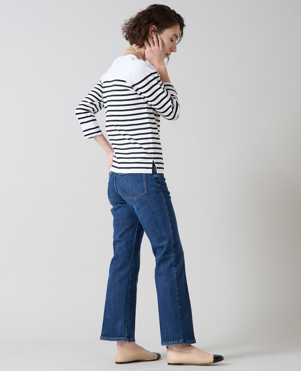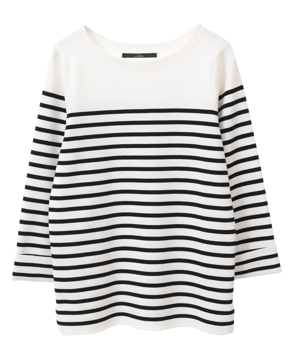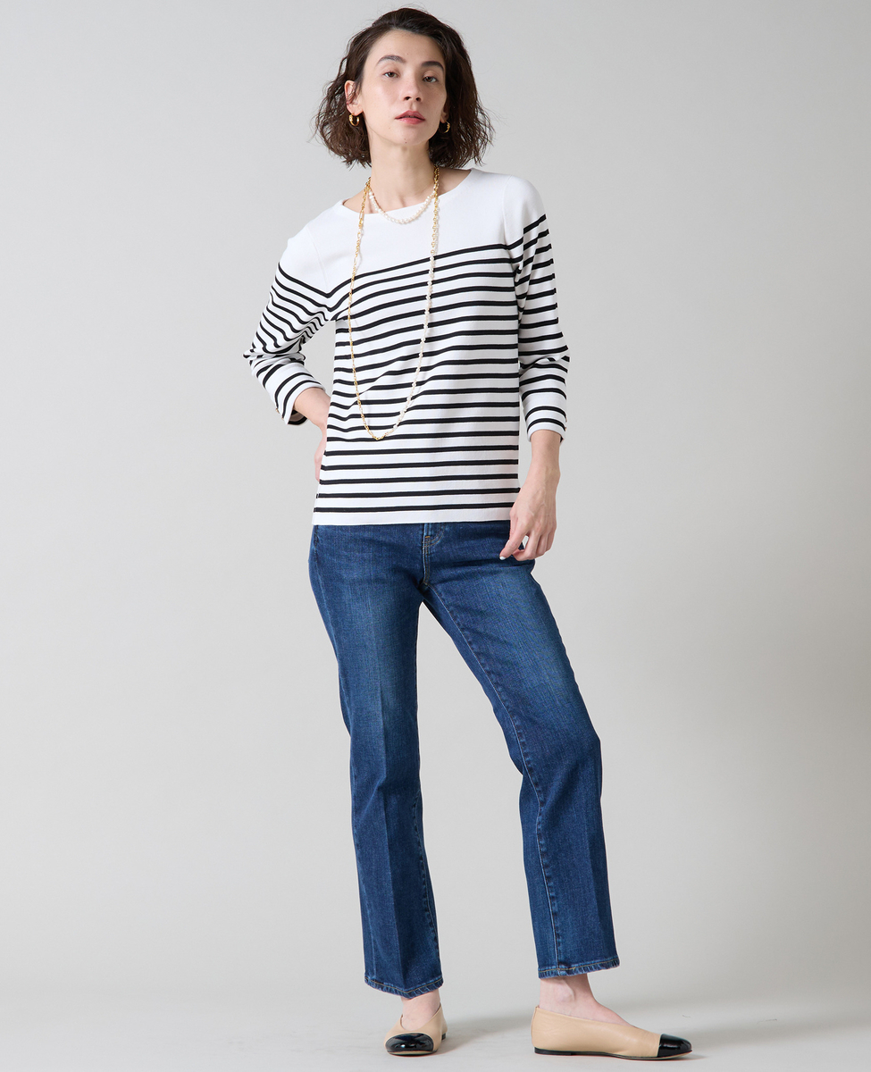 総針編みで透けにくく、適度な張りとストレッチ性のあるニット。UVカット・吸水速乾素材でポリエステル混となっておりお洗濯可能です。広すぎないボートネックで首元をスッキリ見せられ、細すぎない身頃と適度な張り感のある素材感ですっきりとした女性をきれいに見せるシルエットを作り出します。手首の見える袖丈と、アウトして着ても裾のスリットと適度な丈感できれいに着ていただけます。