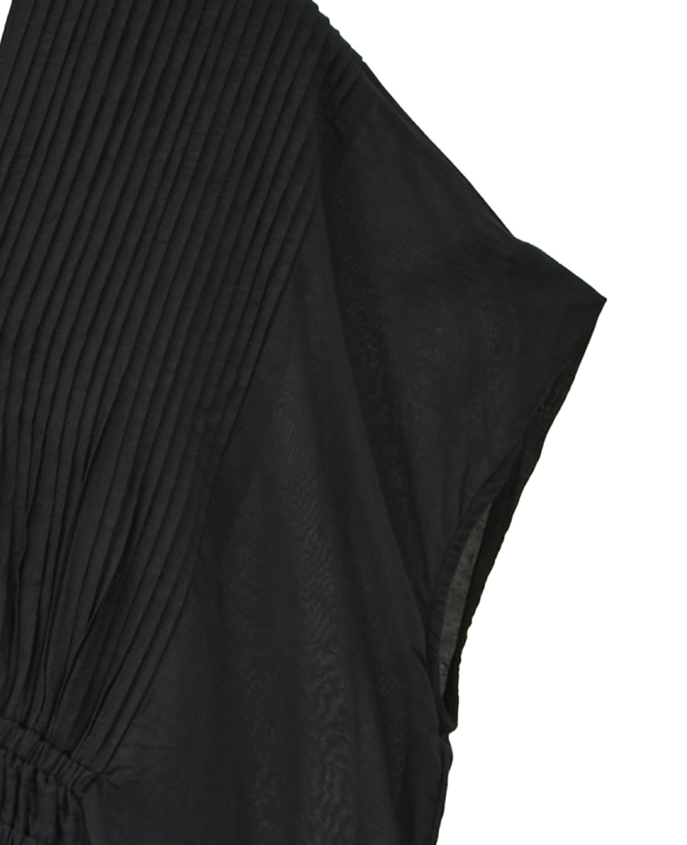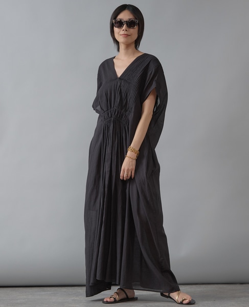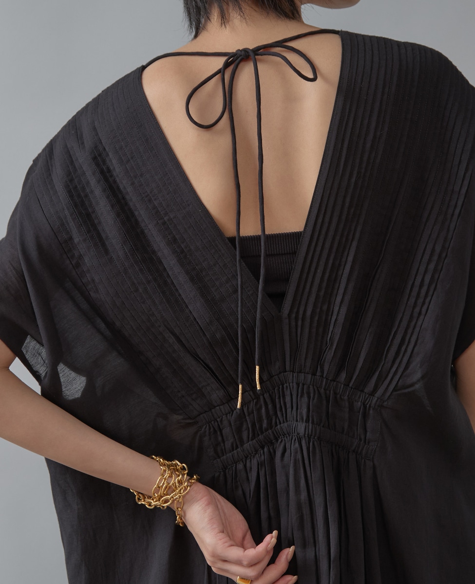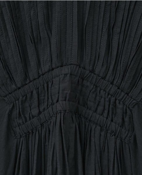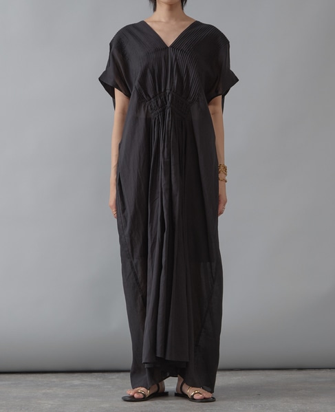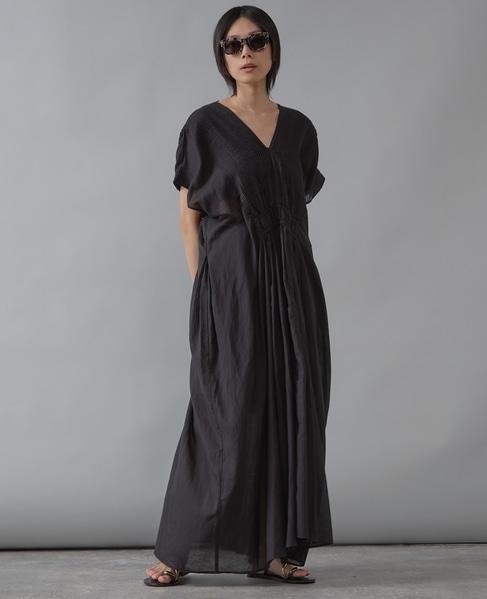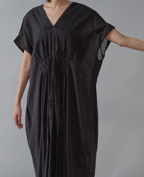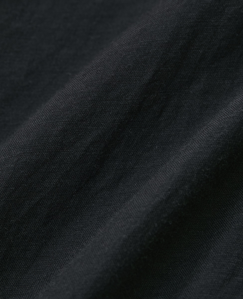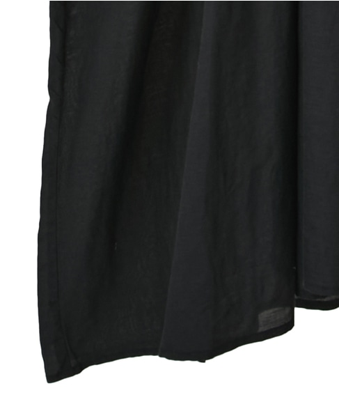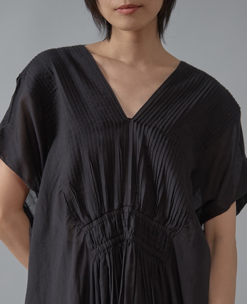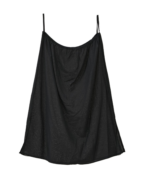 sushiボイルと呼ばれている、日本向けに織られた綿/レーヨンボイルを使用しました。繊細な透け感と、優しい光沢、肌触りの良さが特徴です。オリジナルカラー、イエローとブラックの2色展開。手洗い可能です。汗ばむ時期に、涼しく過ごしていただけます。ピンタックを前後衿元に入れ、深Vがシャープにスッキリ見えるデザインにしています。ウエスト部分にゴムでギャザーを入れ、縦長シルエットにしています。タンクトップなどインナーに重ねて着て頂くのがおすすめです。(スカートペチコート付き)
