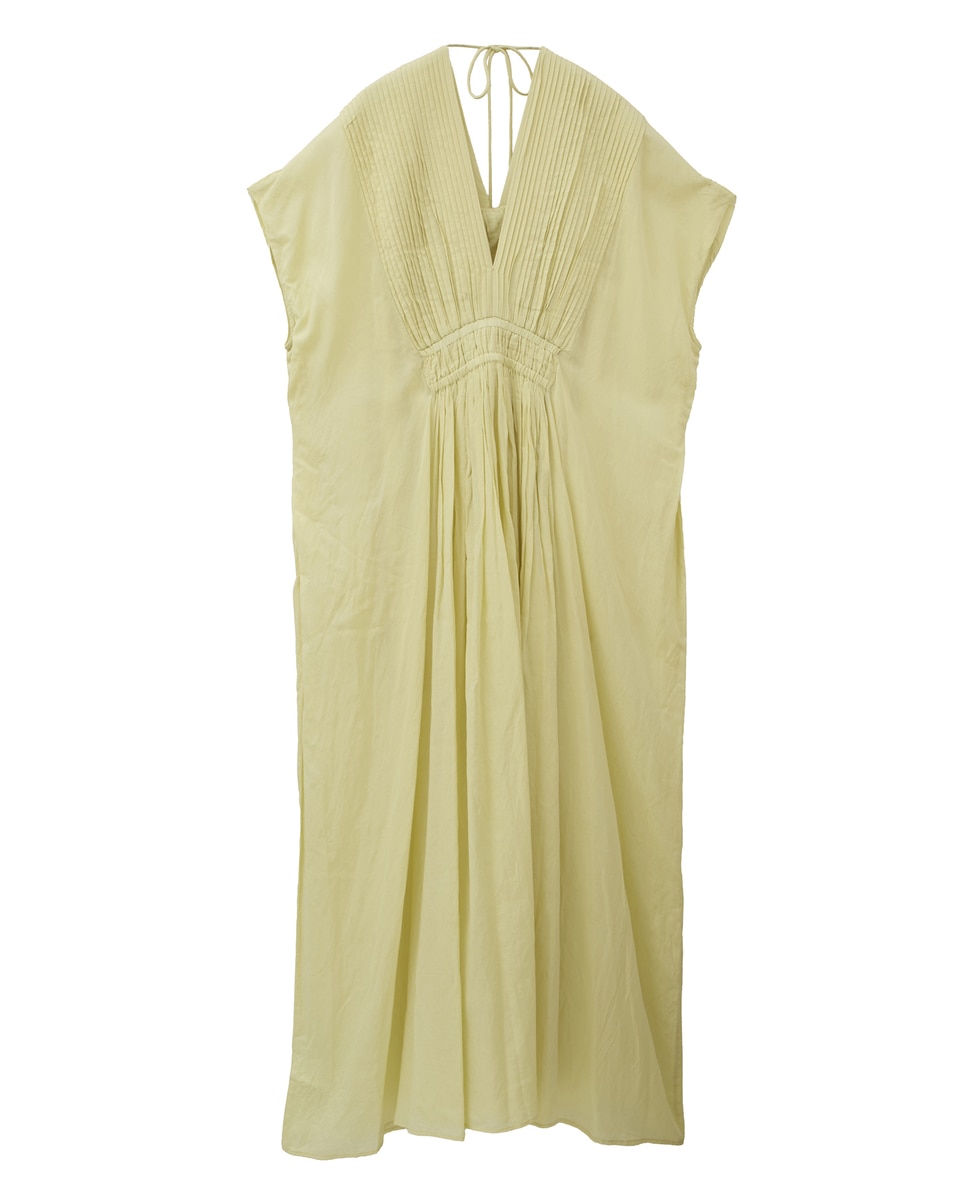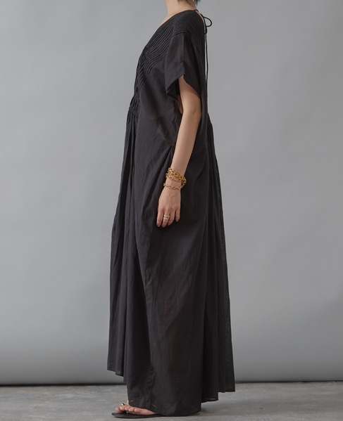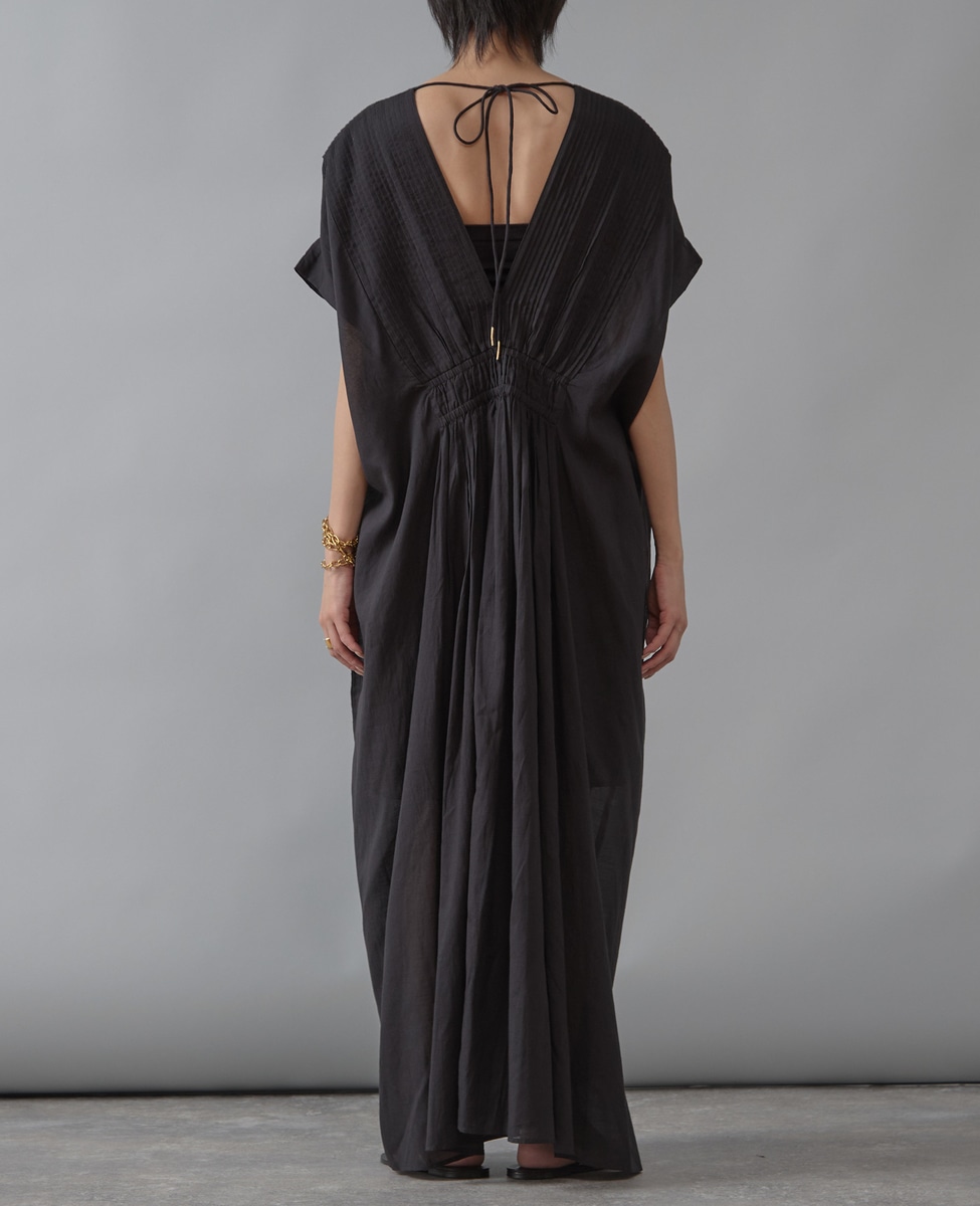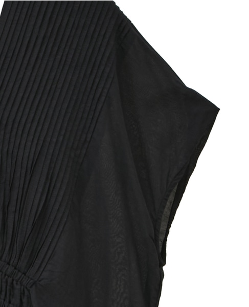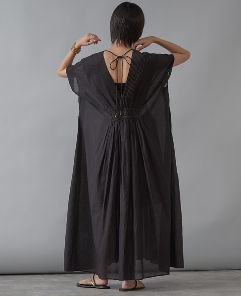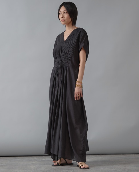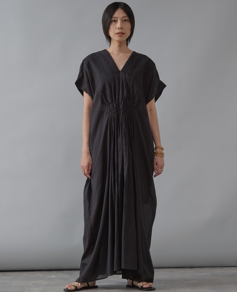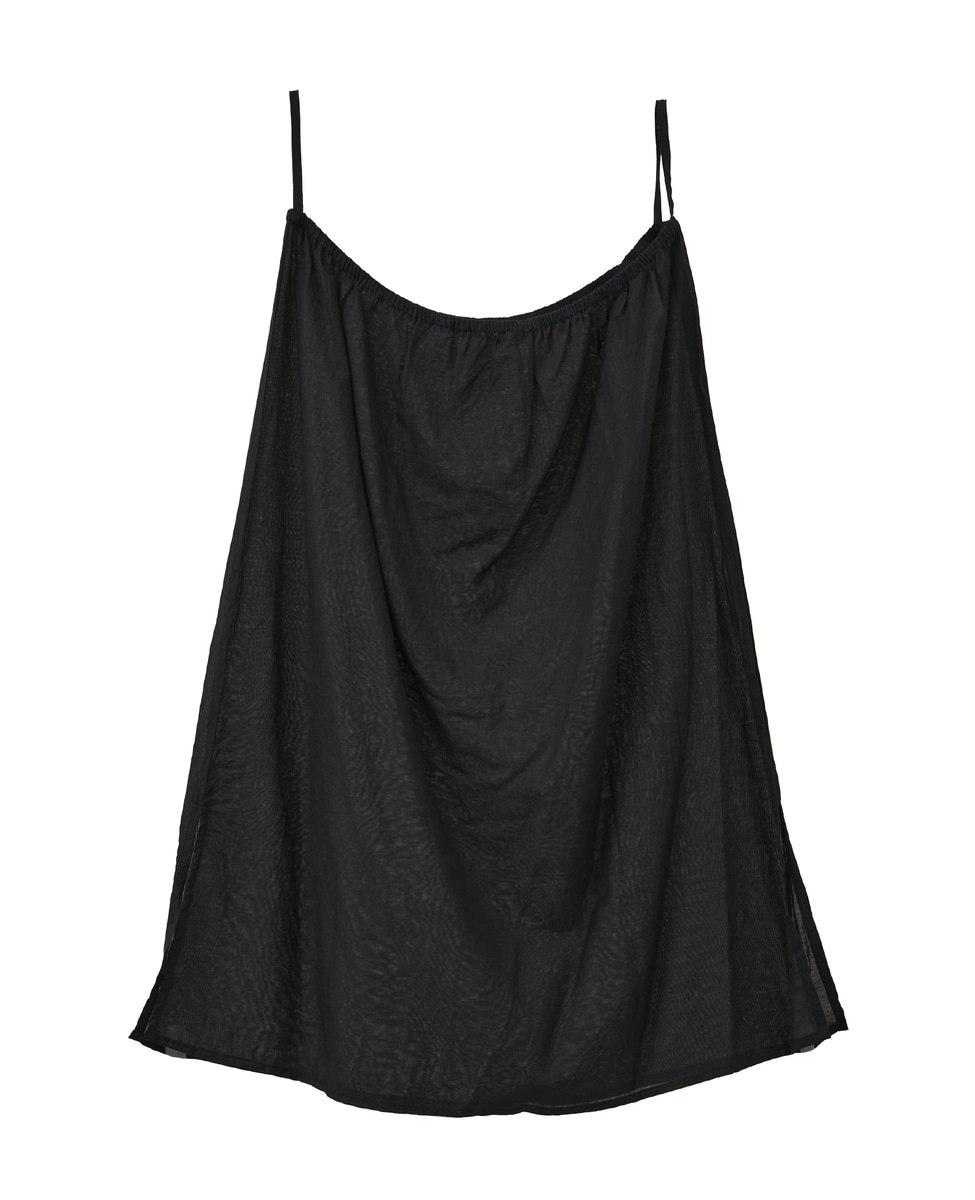 sushiボイルと呼ばれている、日本向けに織られた綿/レーヨンボイルを使用しました。繊細な透け感と、優しい光沢、肌触りの良さが特徴です。オリジナルカラー、イエローとブラックの2色展開。手洗い可能です。汗ばむ時期に、涼しく過ごしていただけます。ピンタックを前後衿元に入れ、深Vがシャープにスッキリ見えるデザインにしています。ウエスト部分にゴムでギャザーを入れ、縦長シルエットにしています。タンクトップなどインナーに重ねて着て頂くのがおすすめです。(スカートペチコート付き)