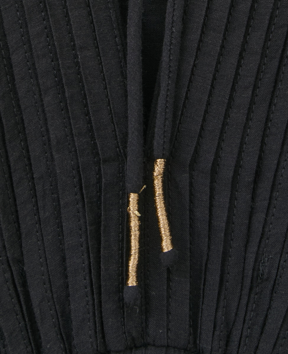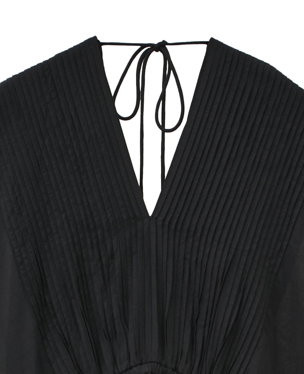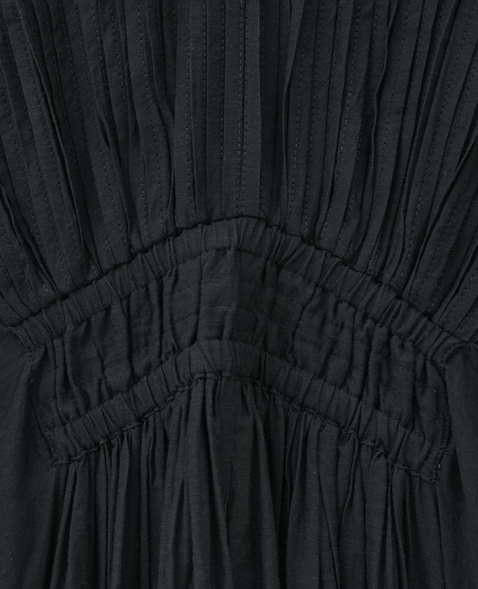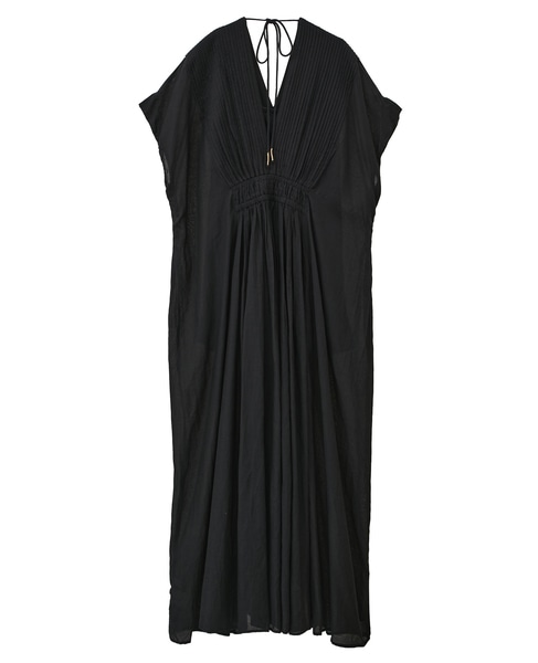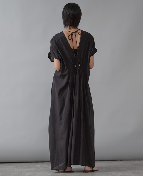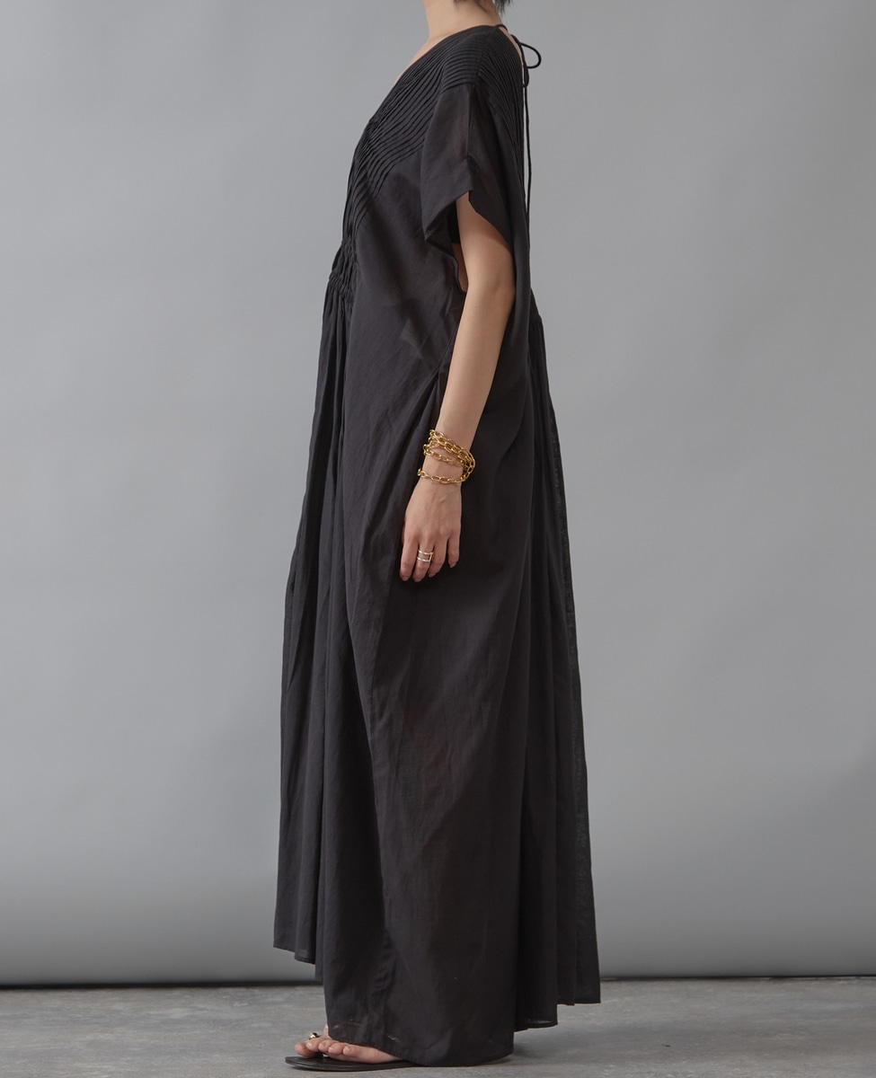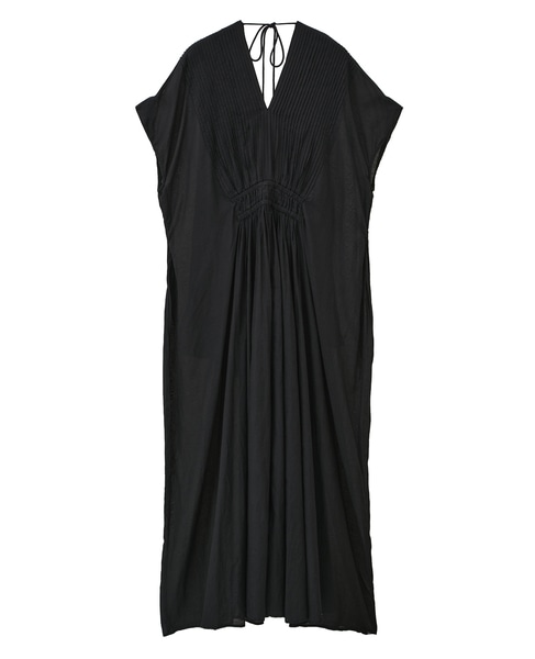 sushiボイルと呼ばれている、日本向けに織られた綿/レーヨンボイルを使用しました。繊細な透け感と、優しい光沢、肌触りの良さが特徴です。オリジナルカラー、イエローとブラックの2色展開。手洗い可能です。汗ばむ時期に、涼しく過ごしていただけます。ピンタックを前後衿元に入れ、深Vがシャープにスッキリ見えるデザインにしています。ウエスト部分にゴムでギャザーを入れ、縦長シルエットにしています。タンクトップなどインナーに重ねて着て頂くのがおすすめです。(スカートペチコート付き)