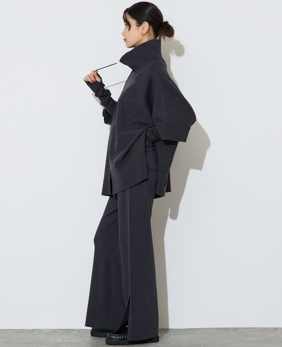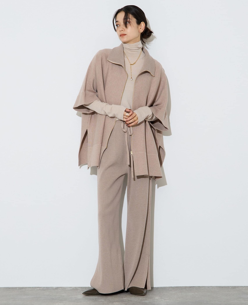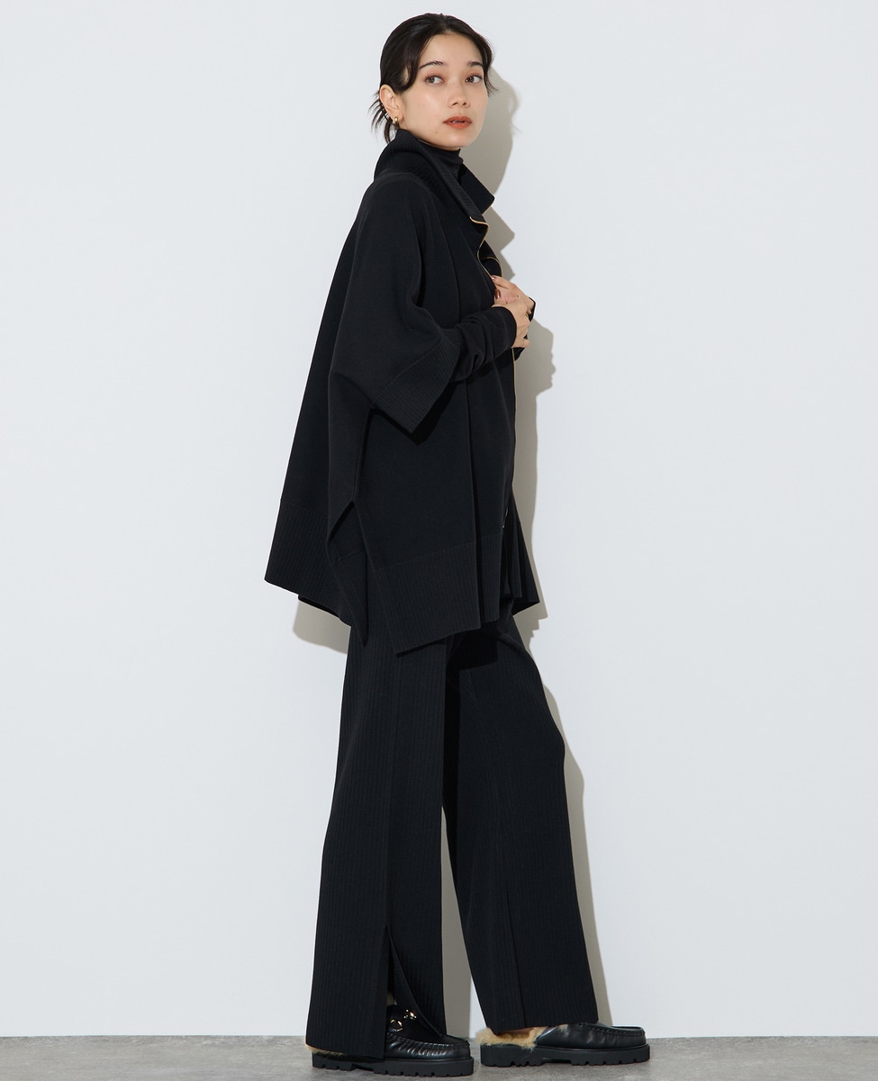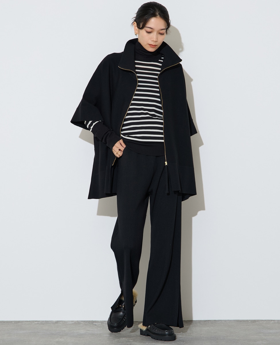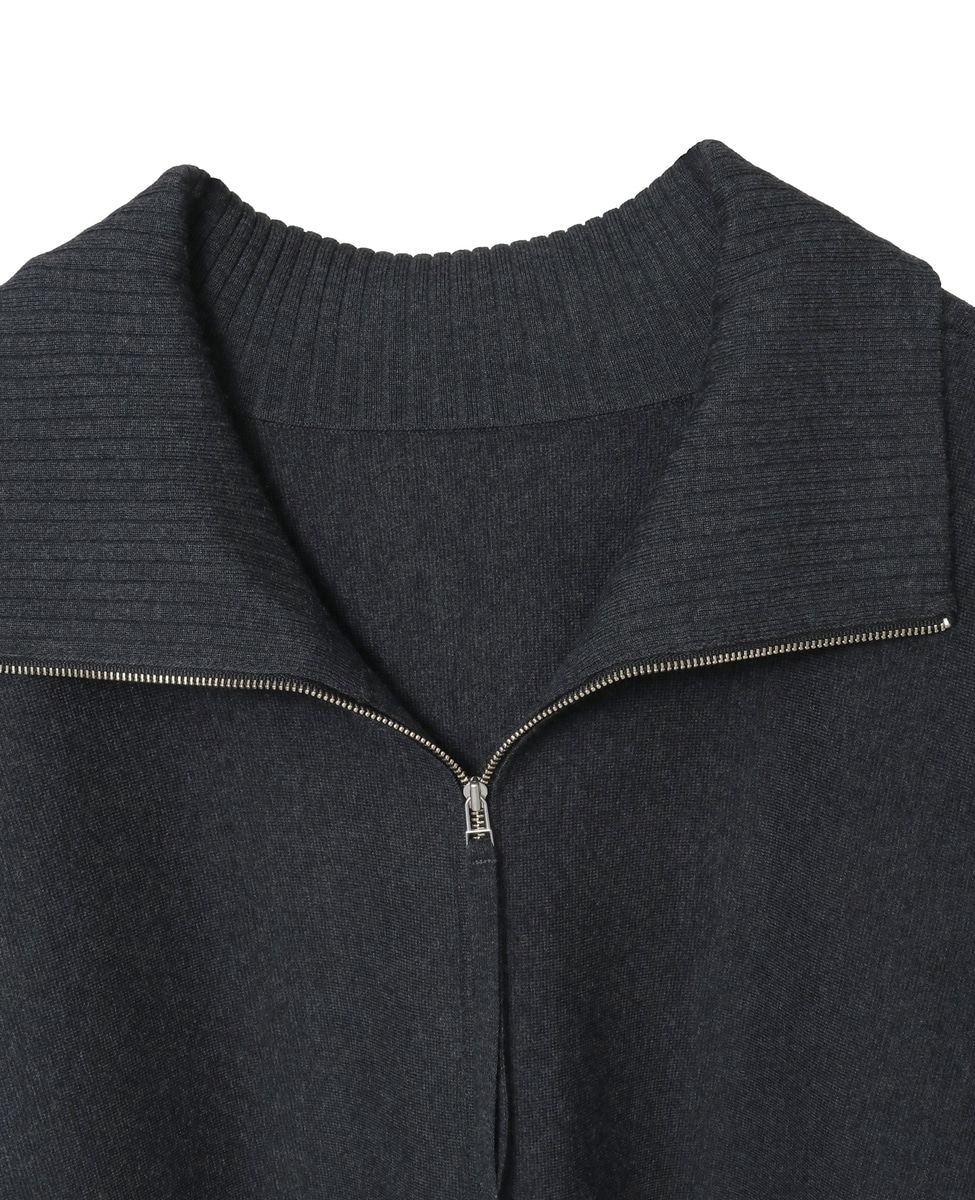 衿元のファスナーの開け具合で、女性らしさのあるスタイリングが楽しめます。