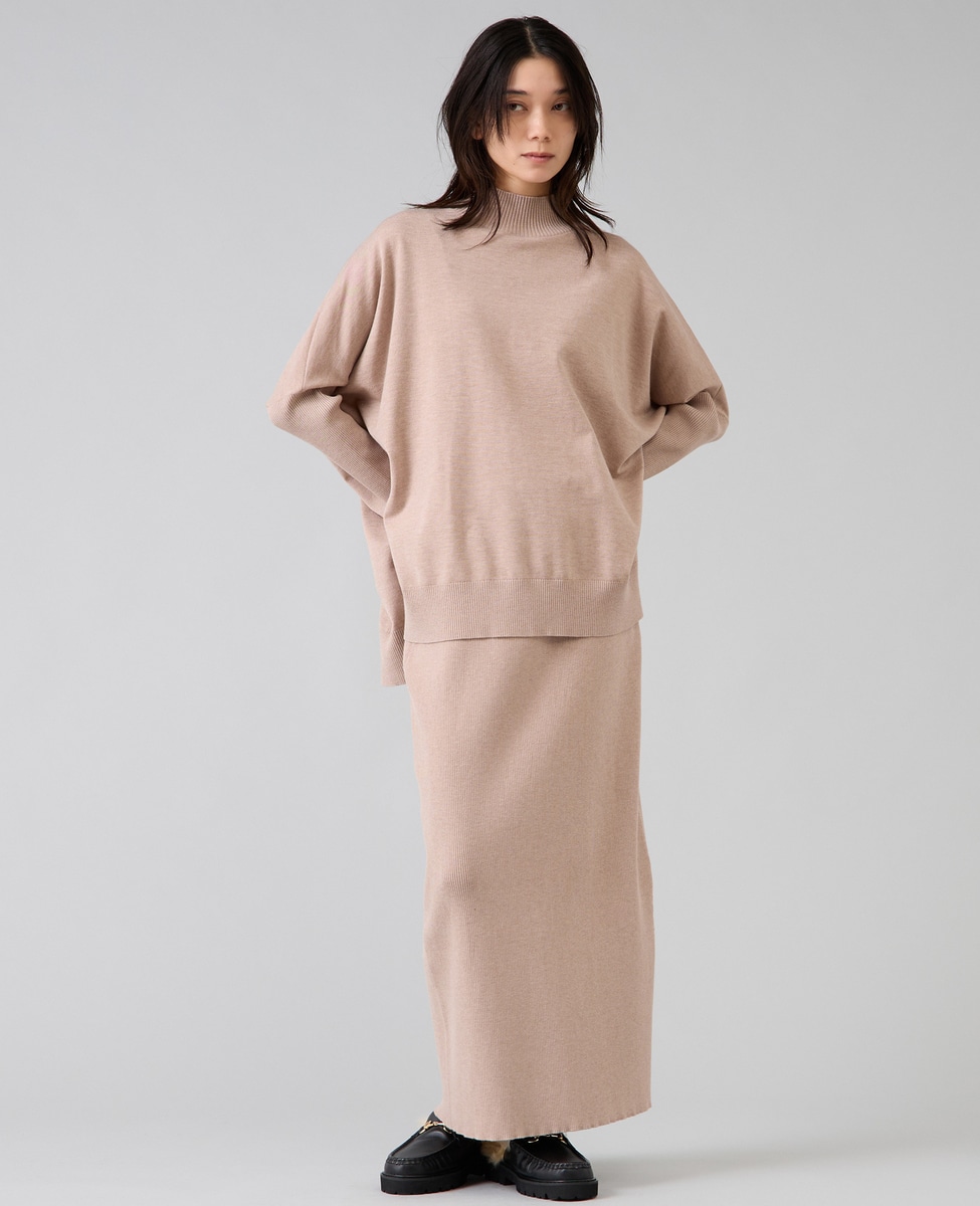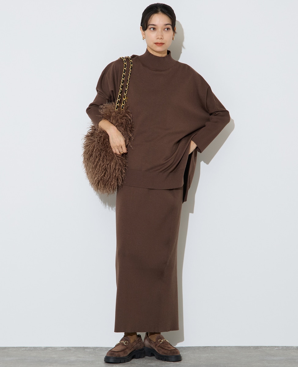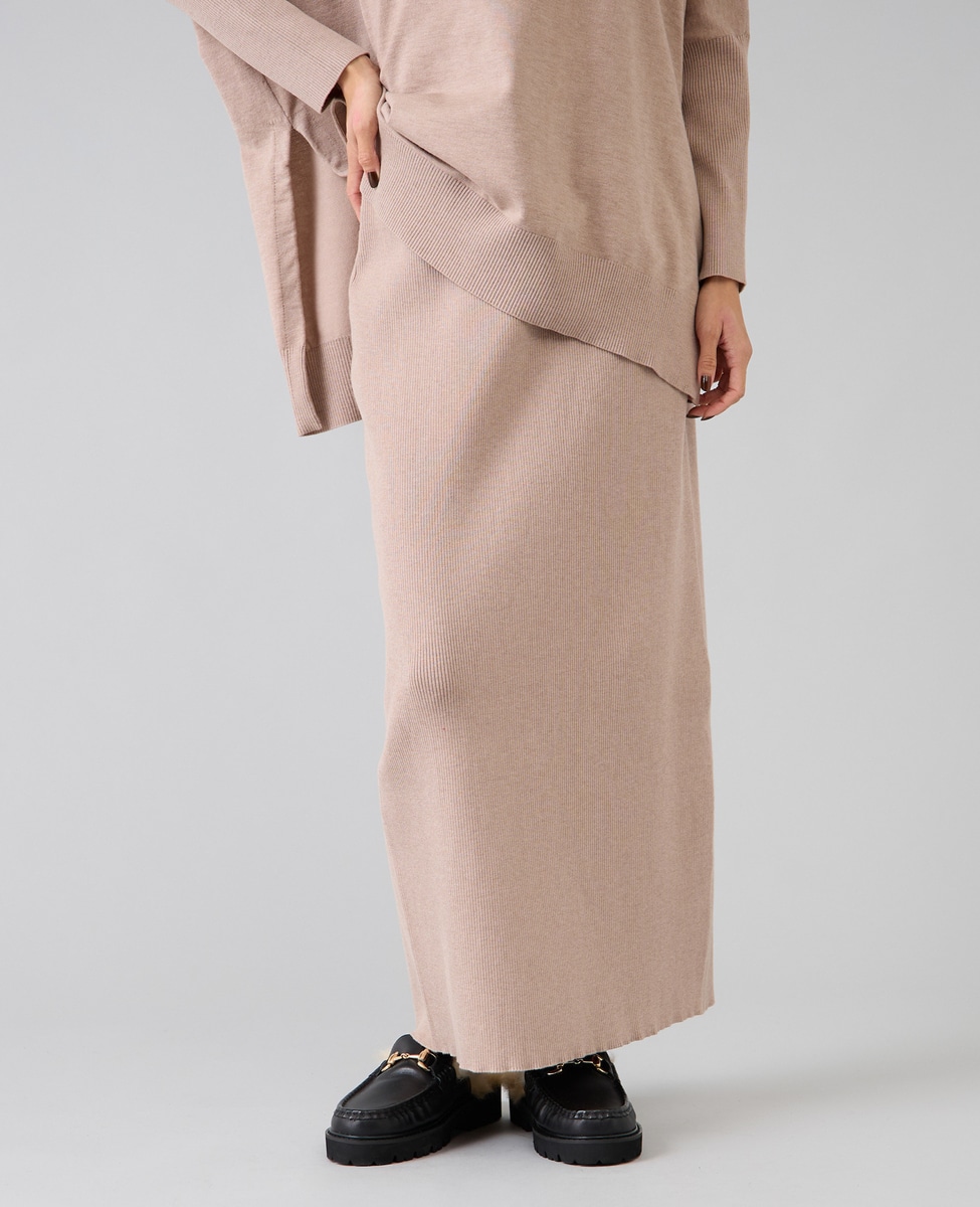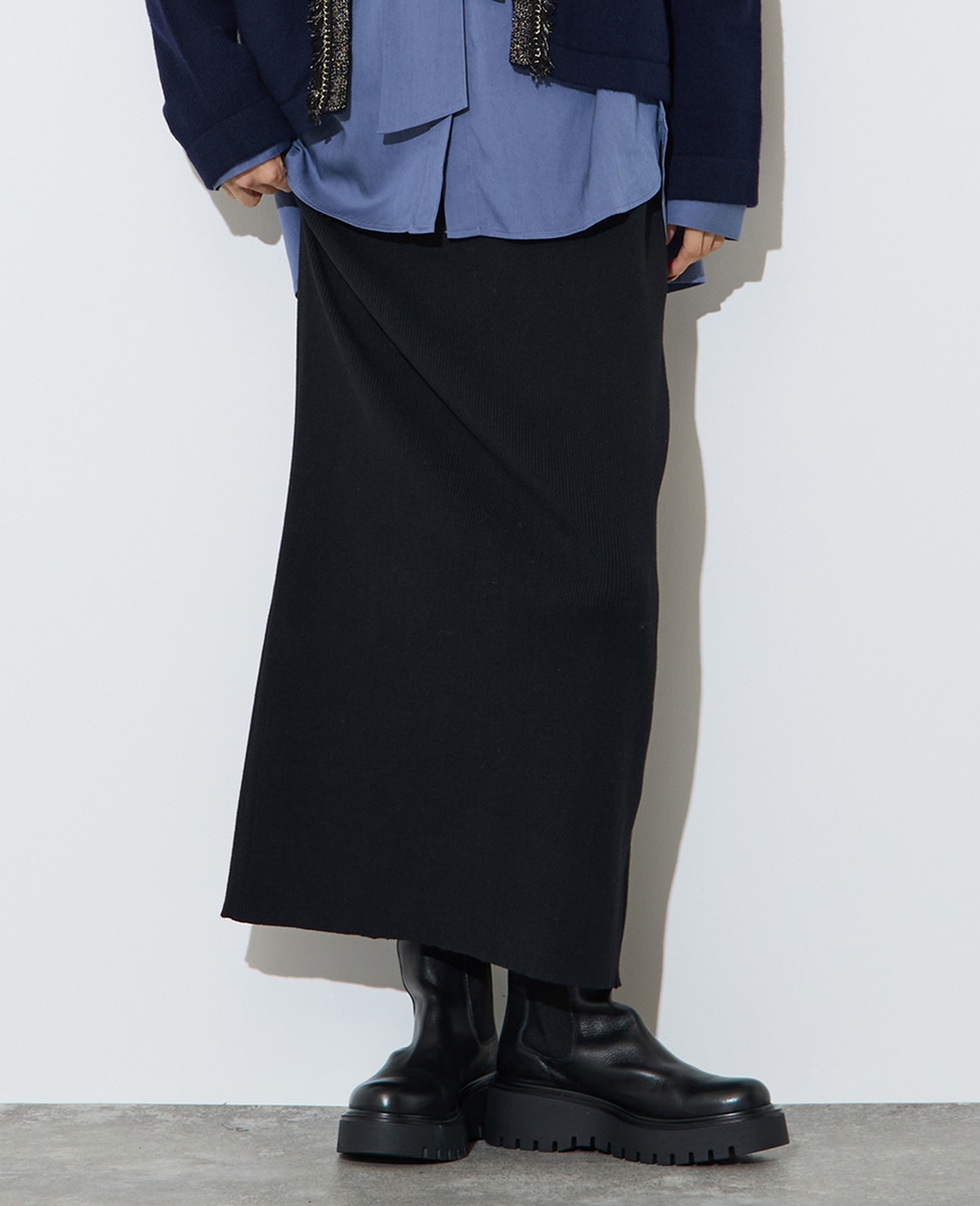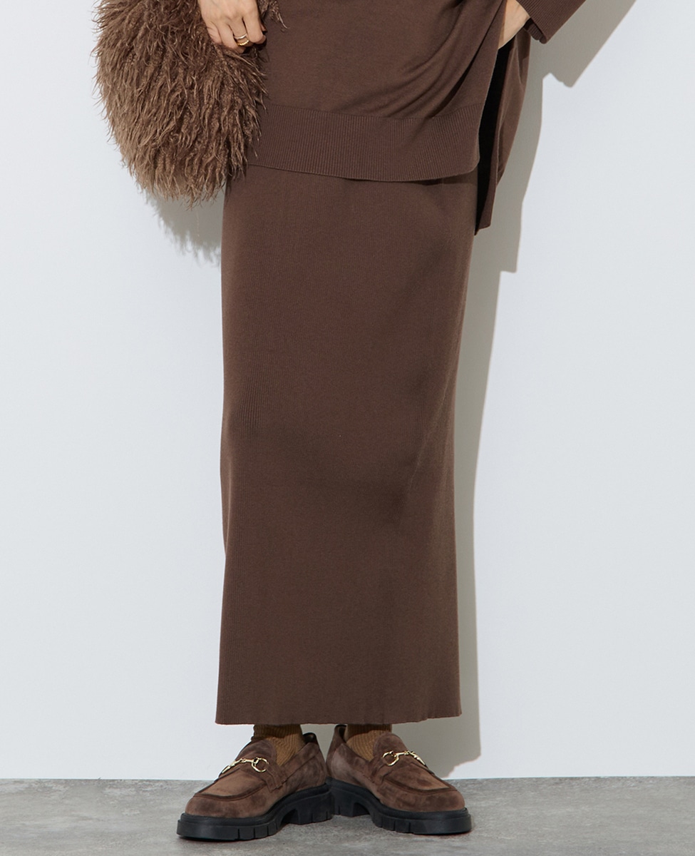 キレイ目~カジュアルまで多様なスタイリングに合わせられる、万能なニットスカートです。