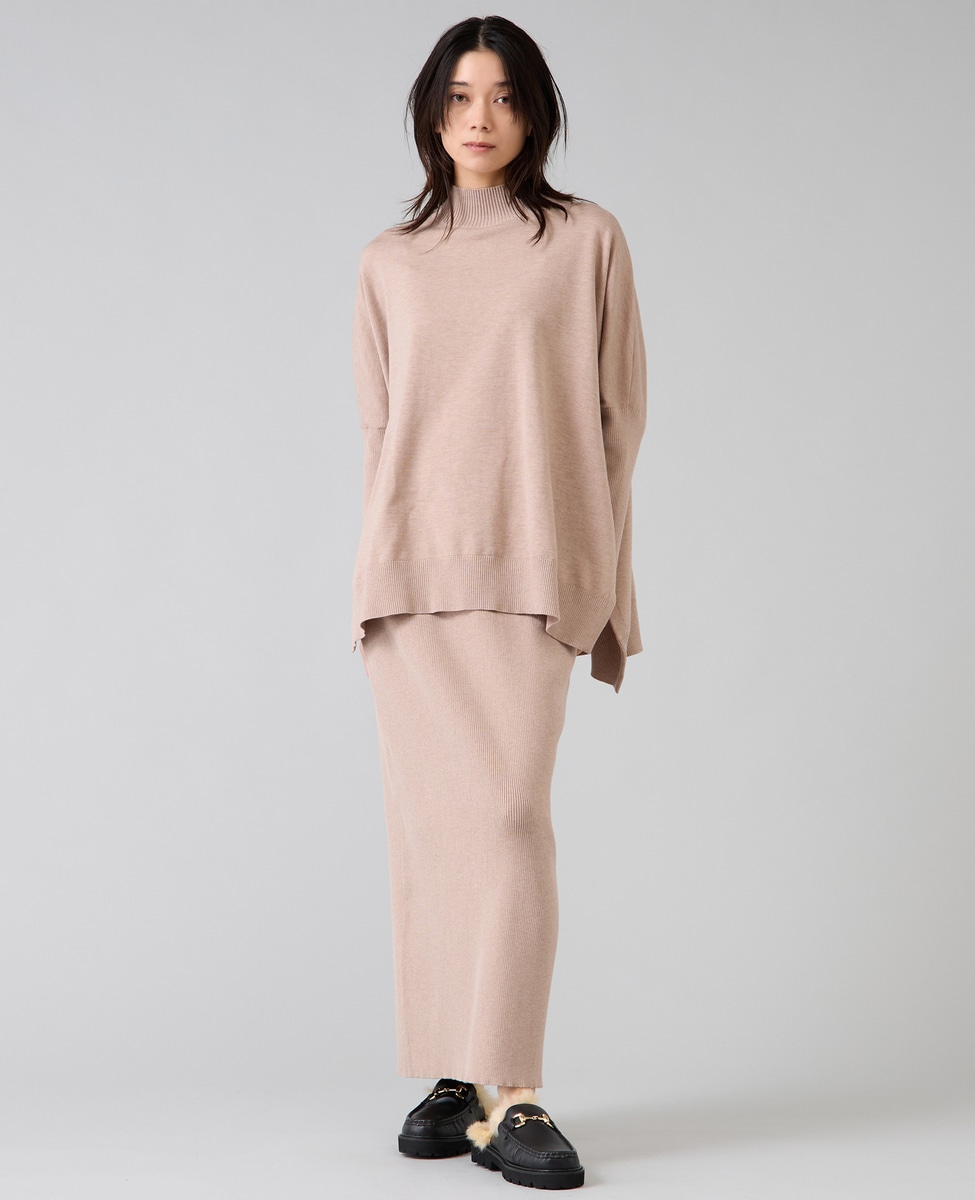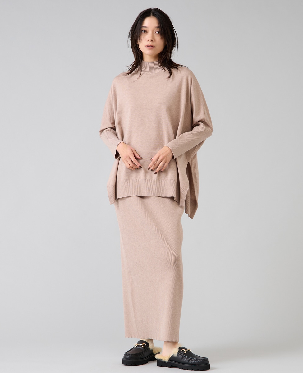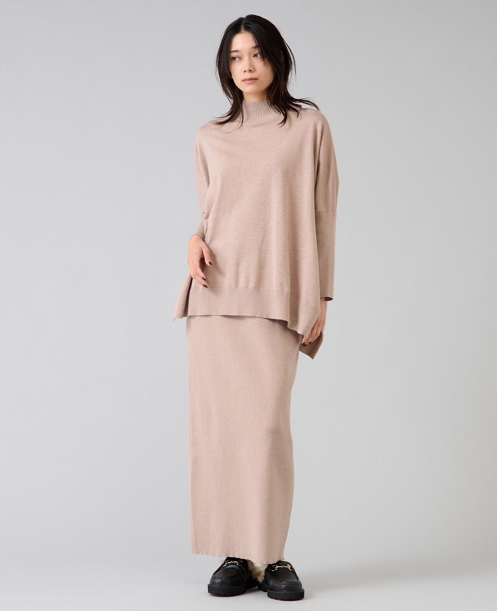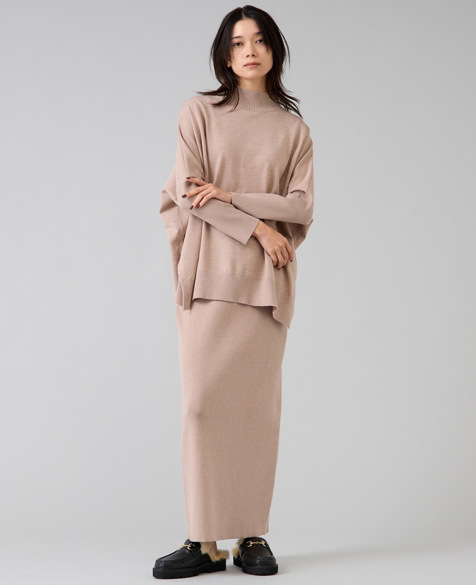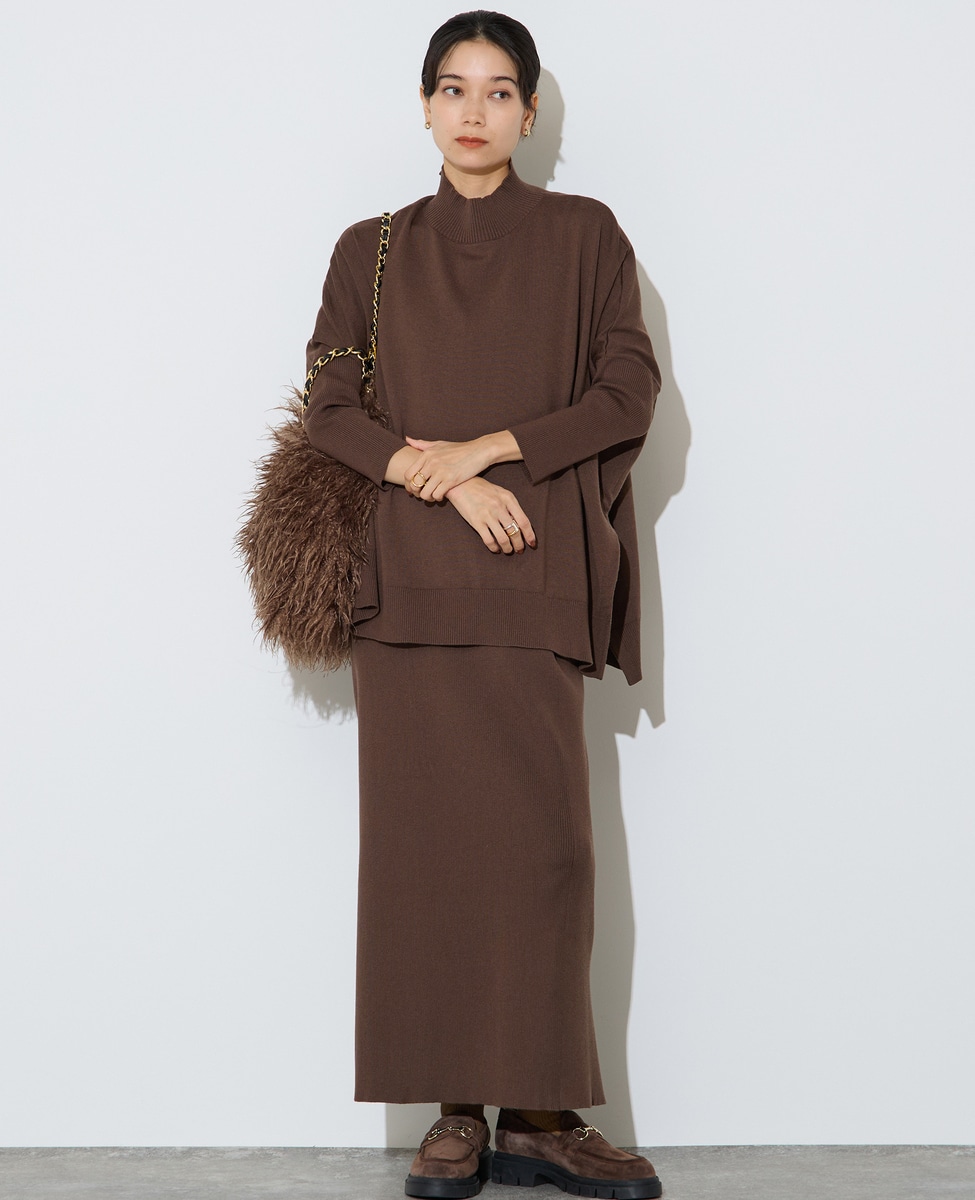 キレイ目~カジュアルまで多様なスタイリングに合わせられる、万能なニットスカートです。