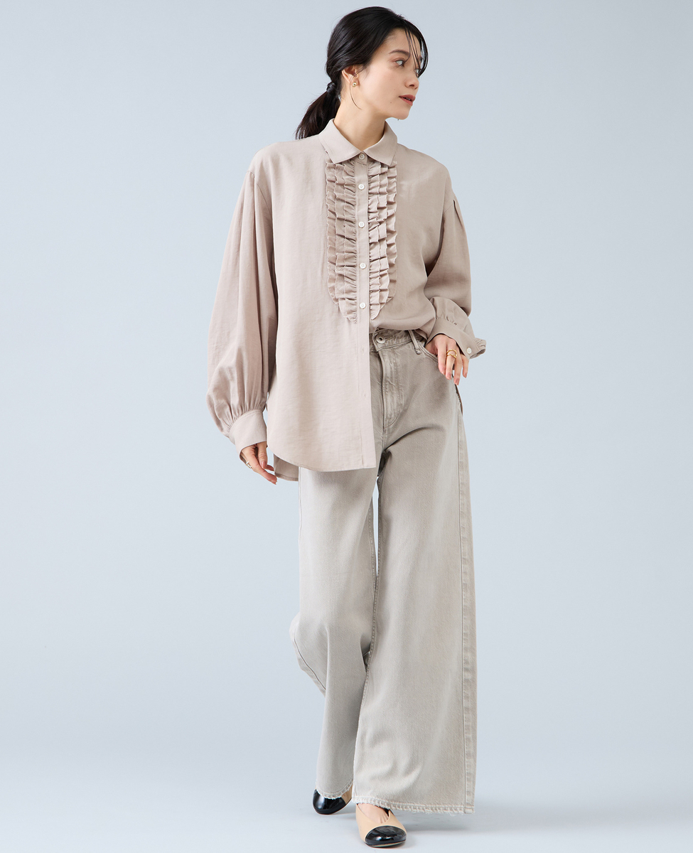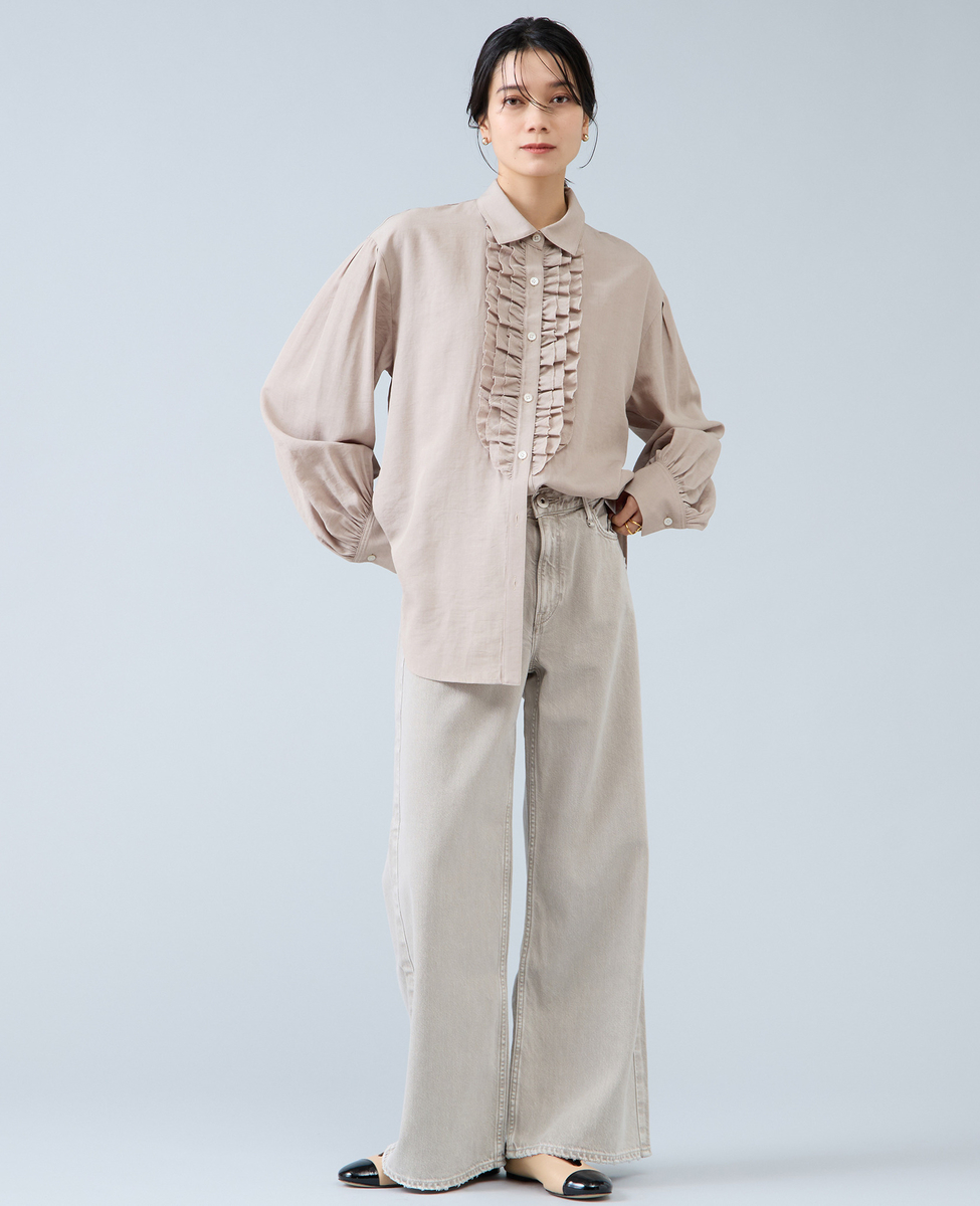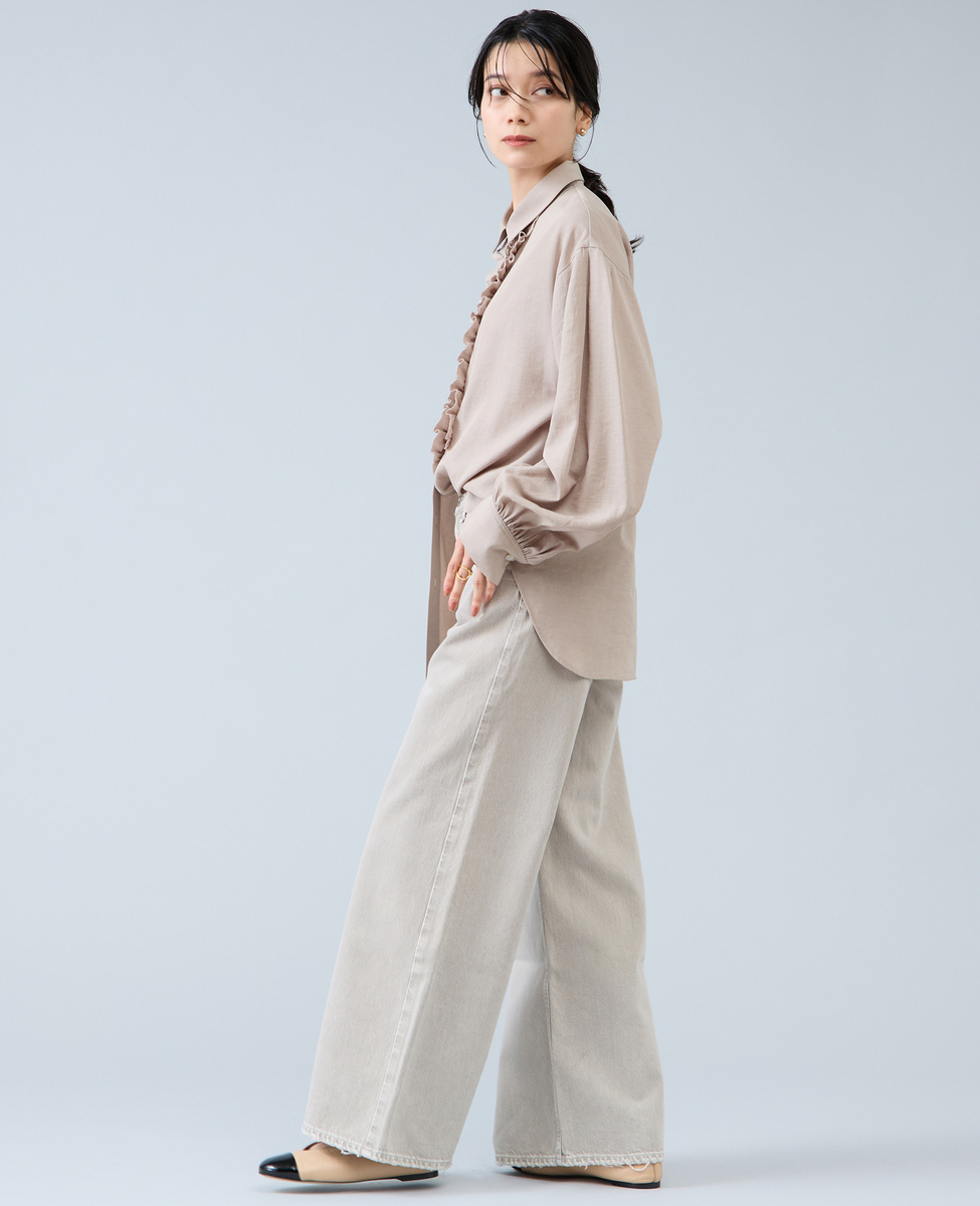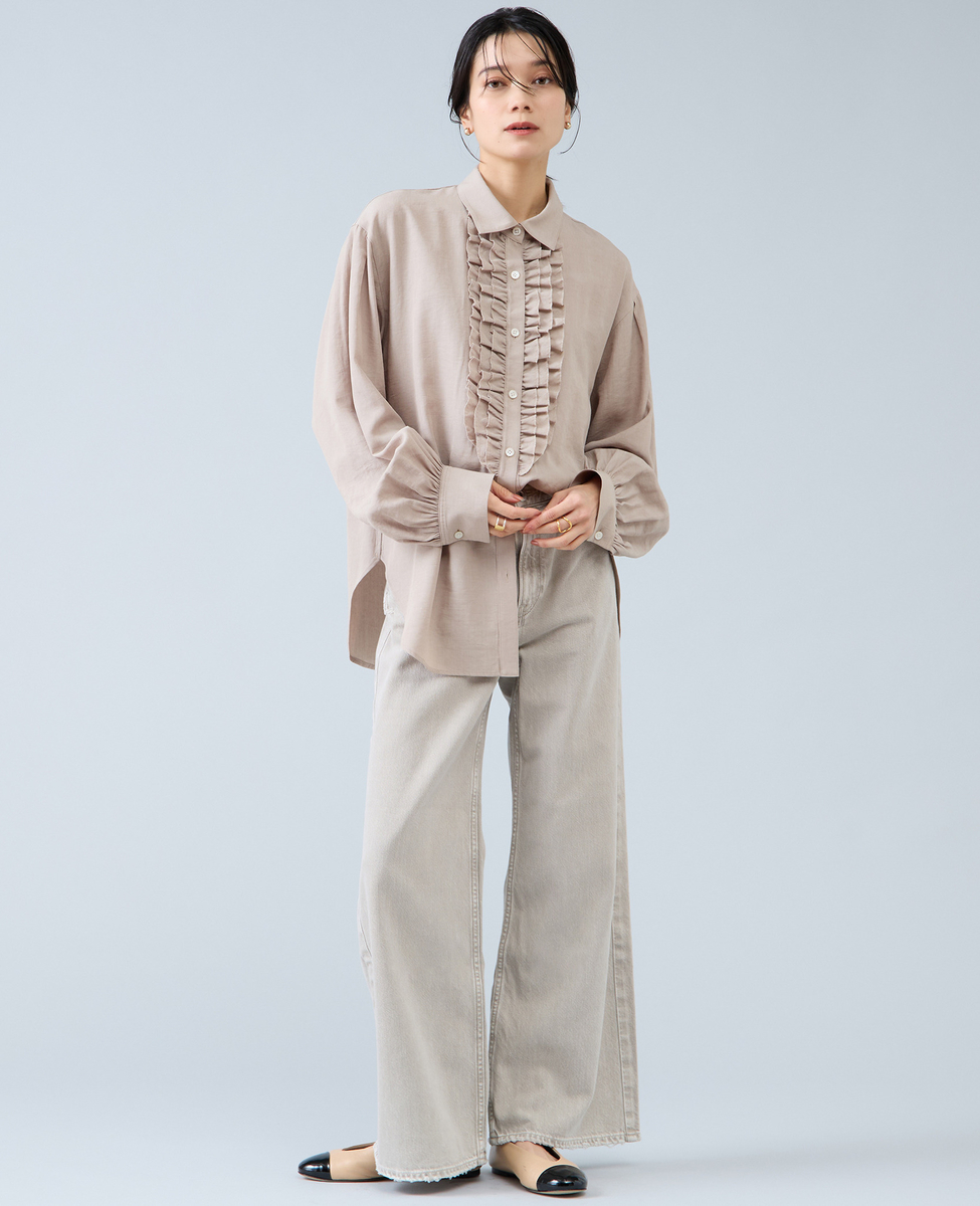 切りっぱなしのフリルディテールで甘さを抑え、こなれた雰囲気に仕上げています。