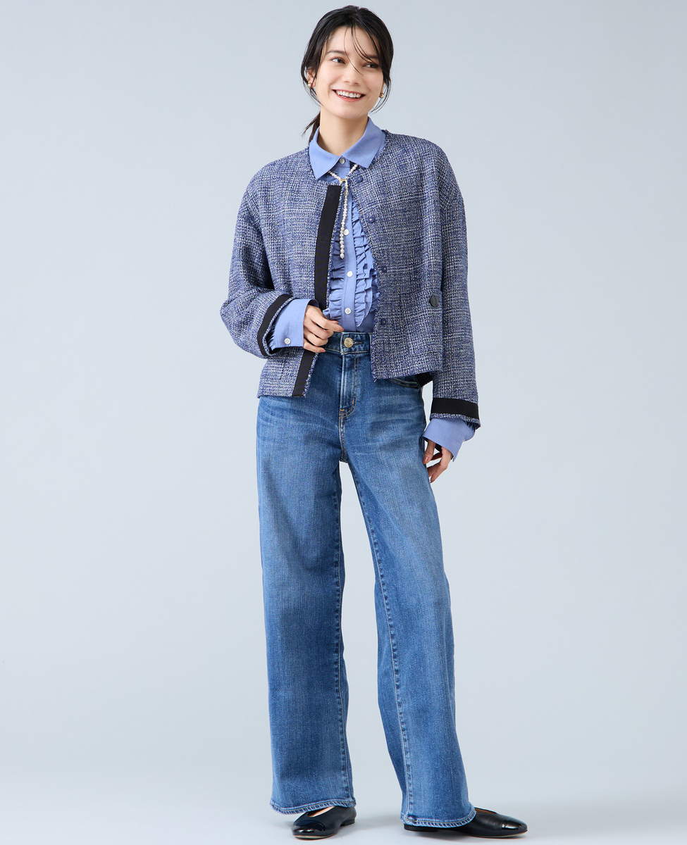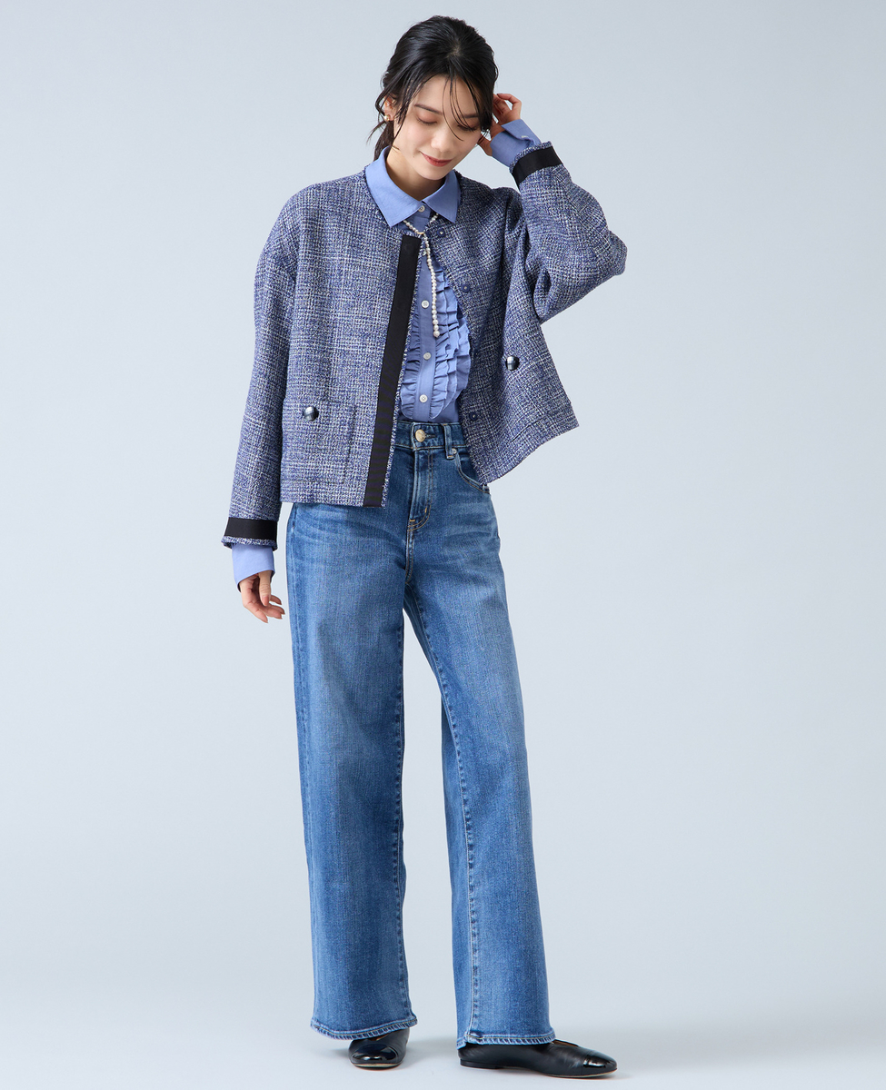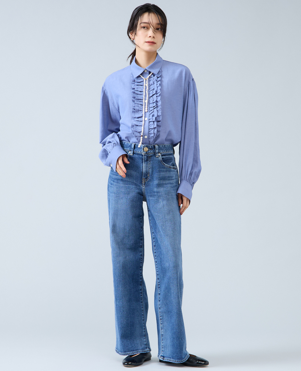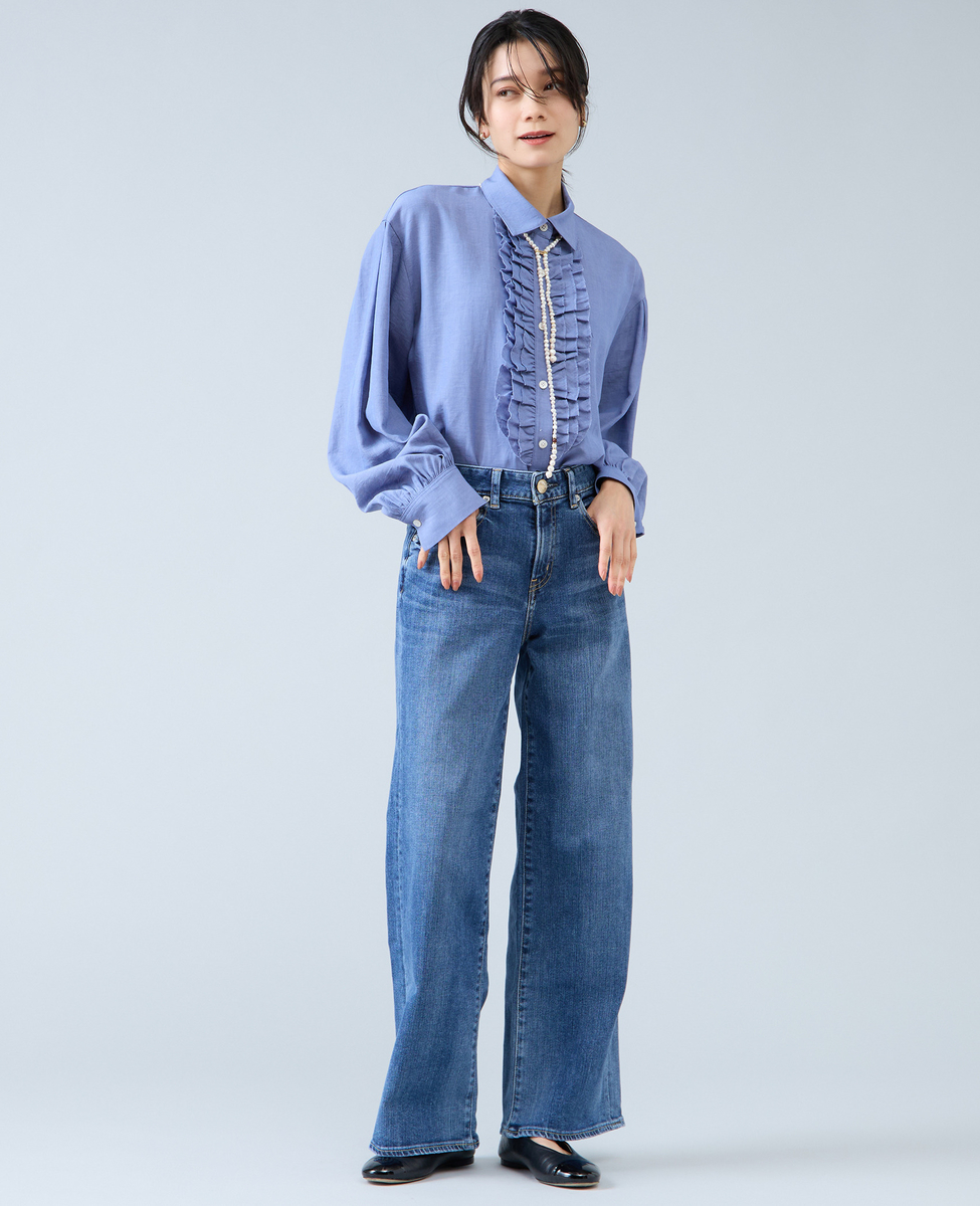 切りっぱなしのフリルディテールで甘さを抑え、こなれた雰囲気に仕上げています。