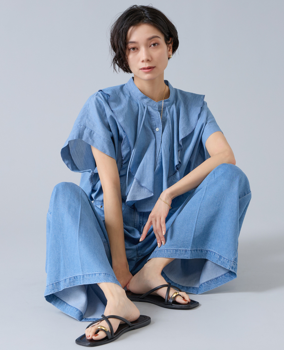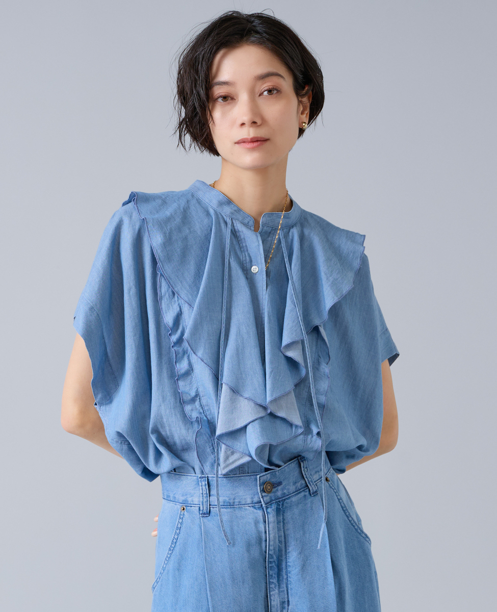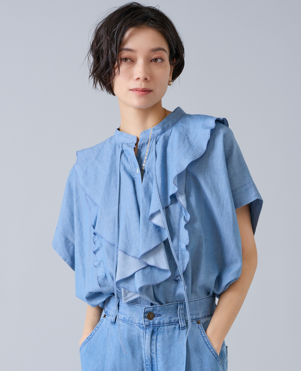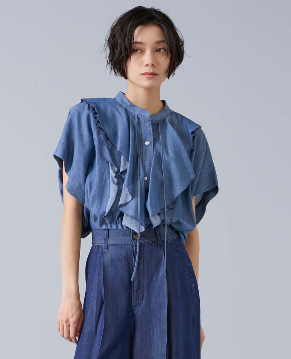 シアーデニムフリルブラウス