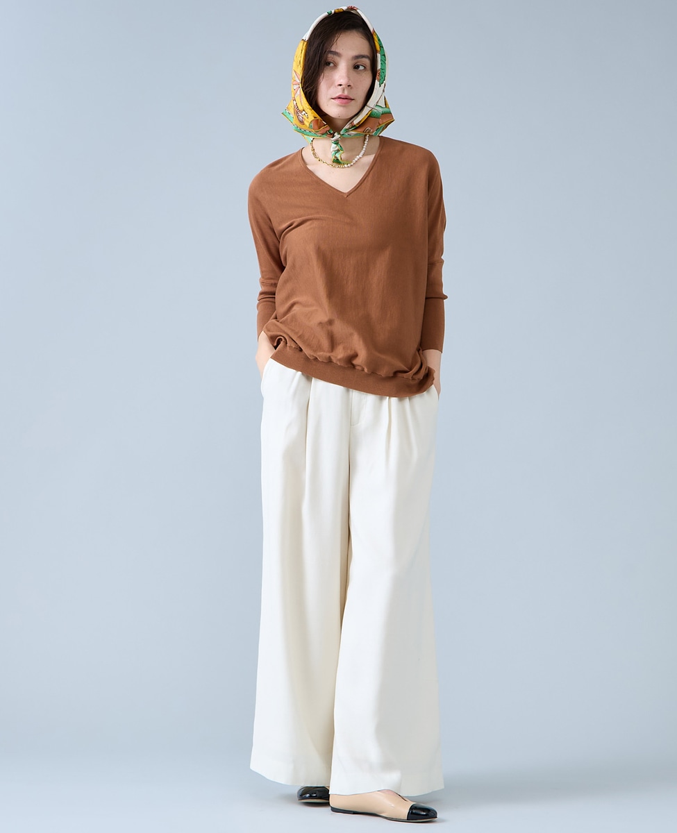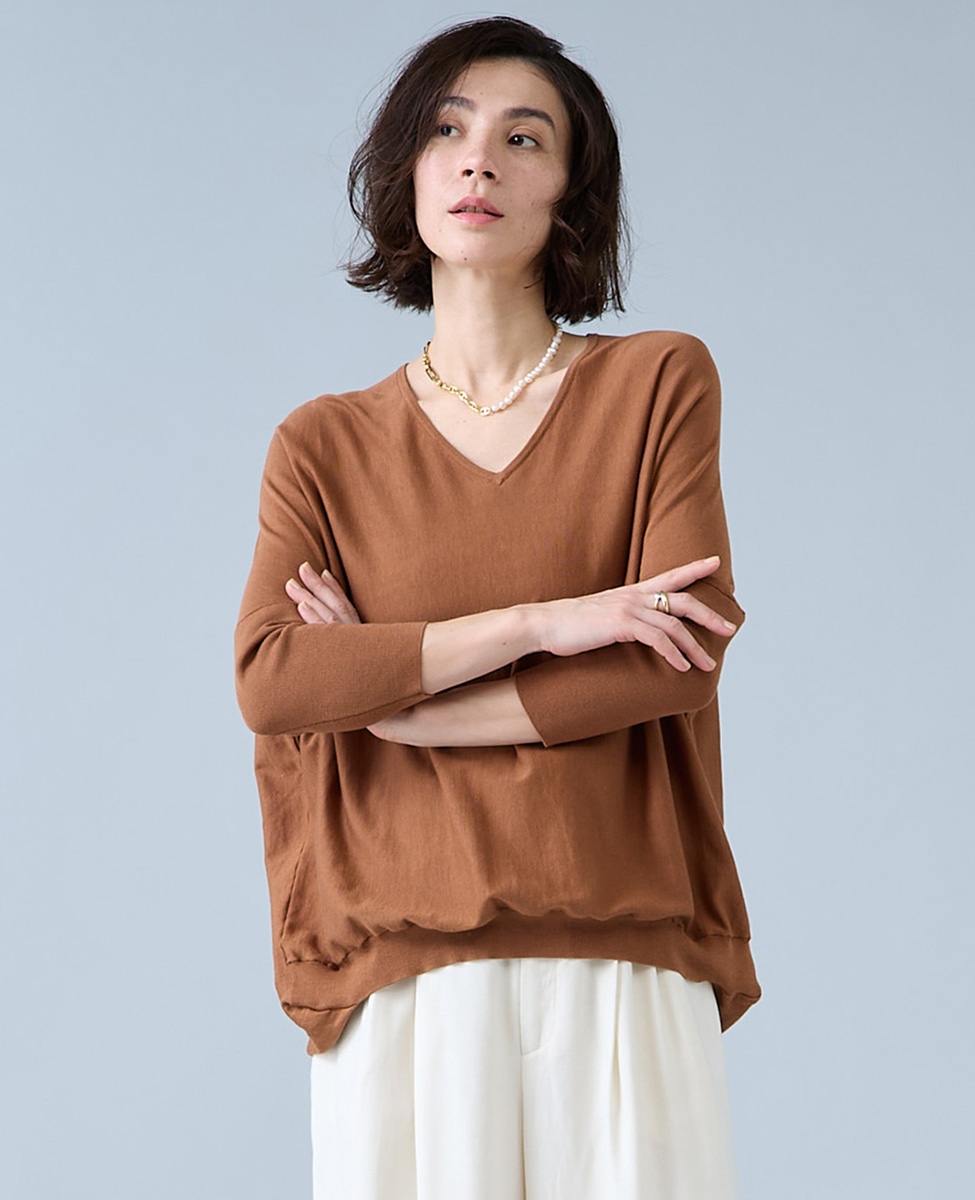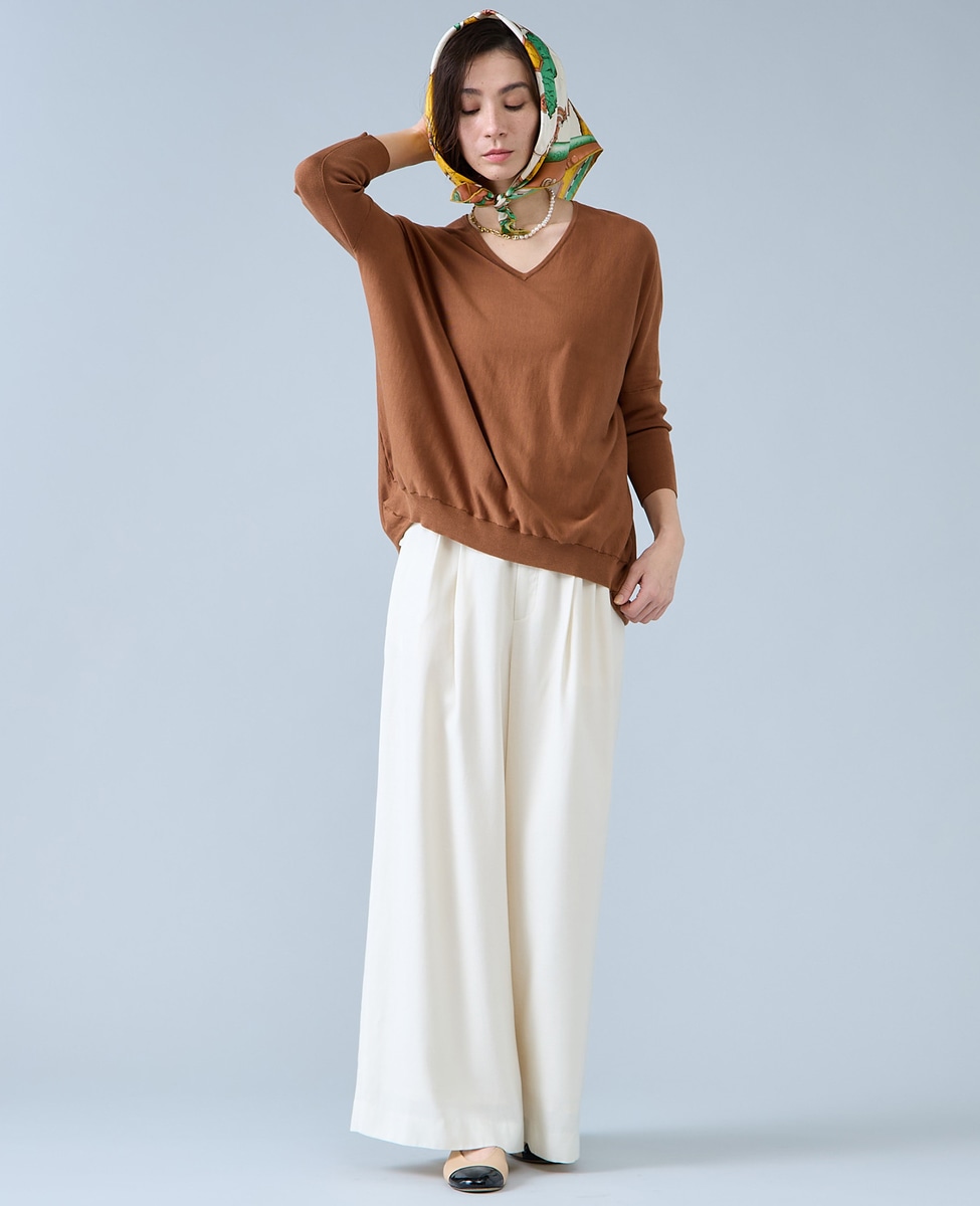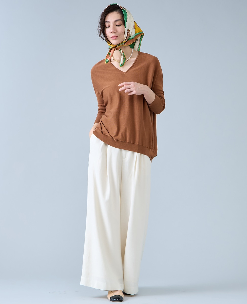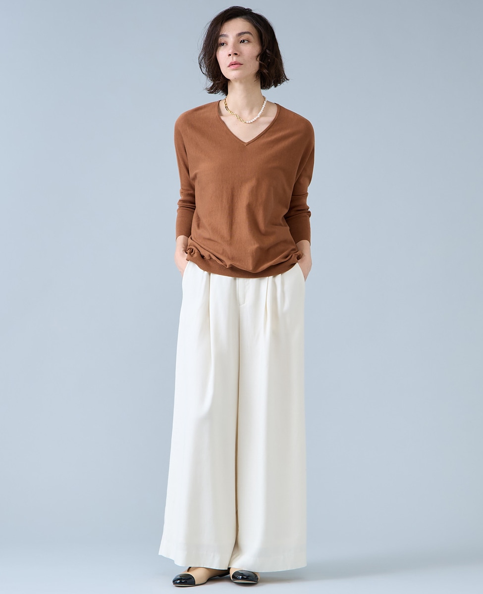Vネックラインはシルク混で柔らかく、デコルテを上品に演出します。