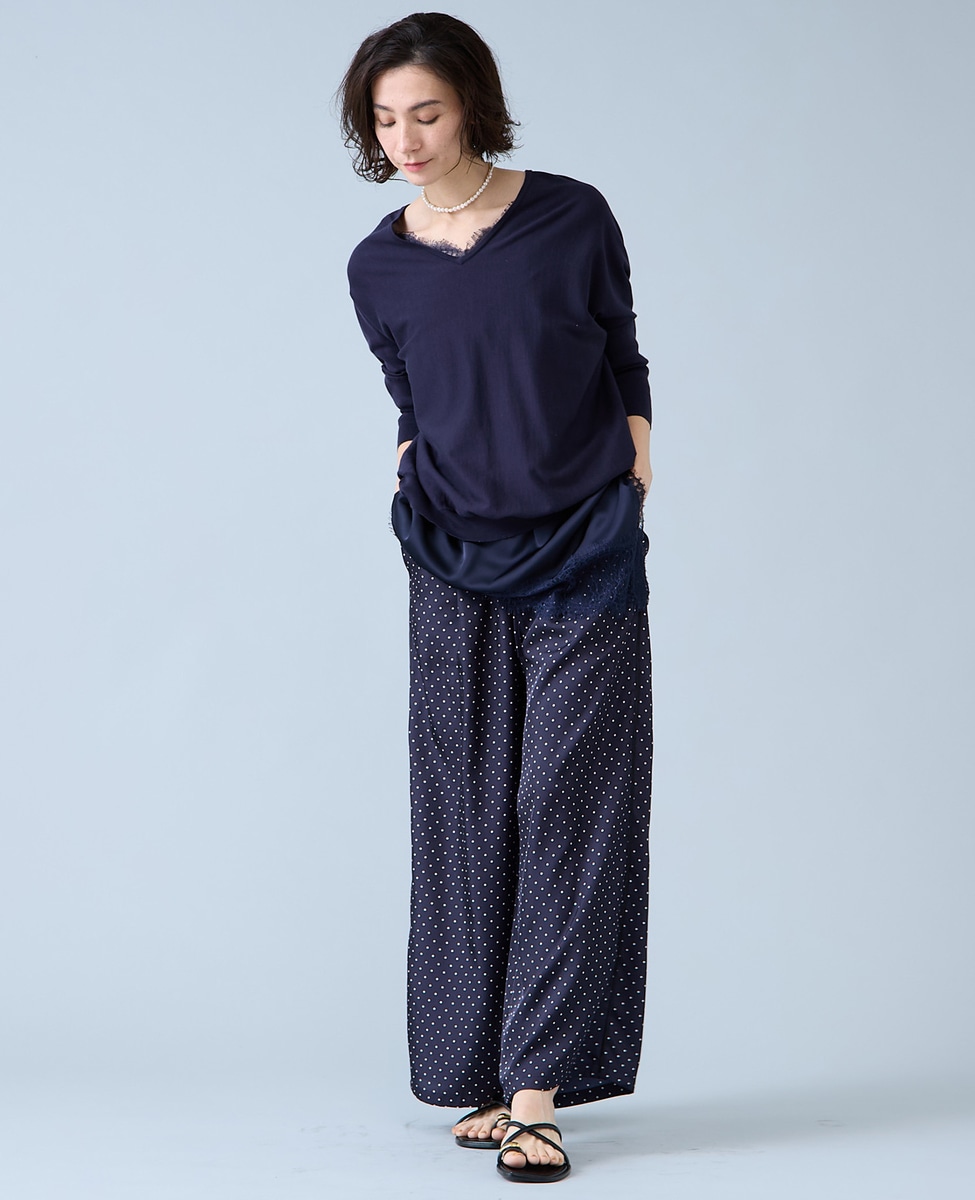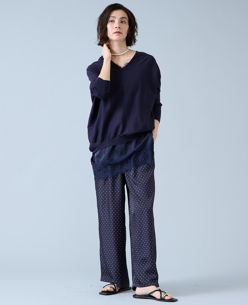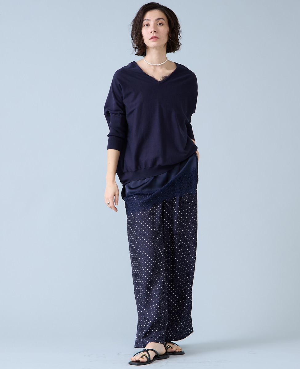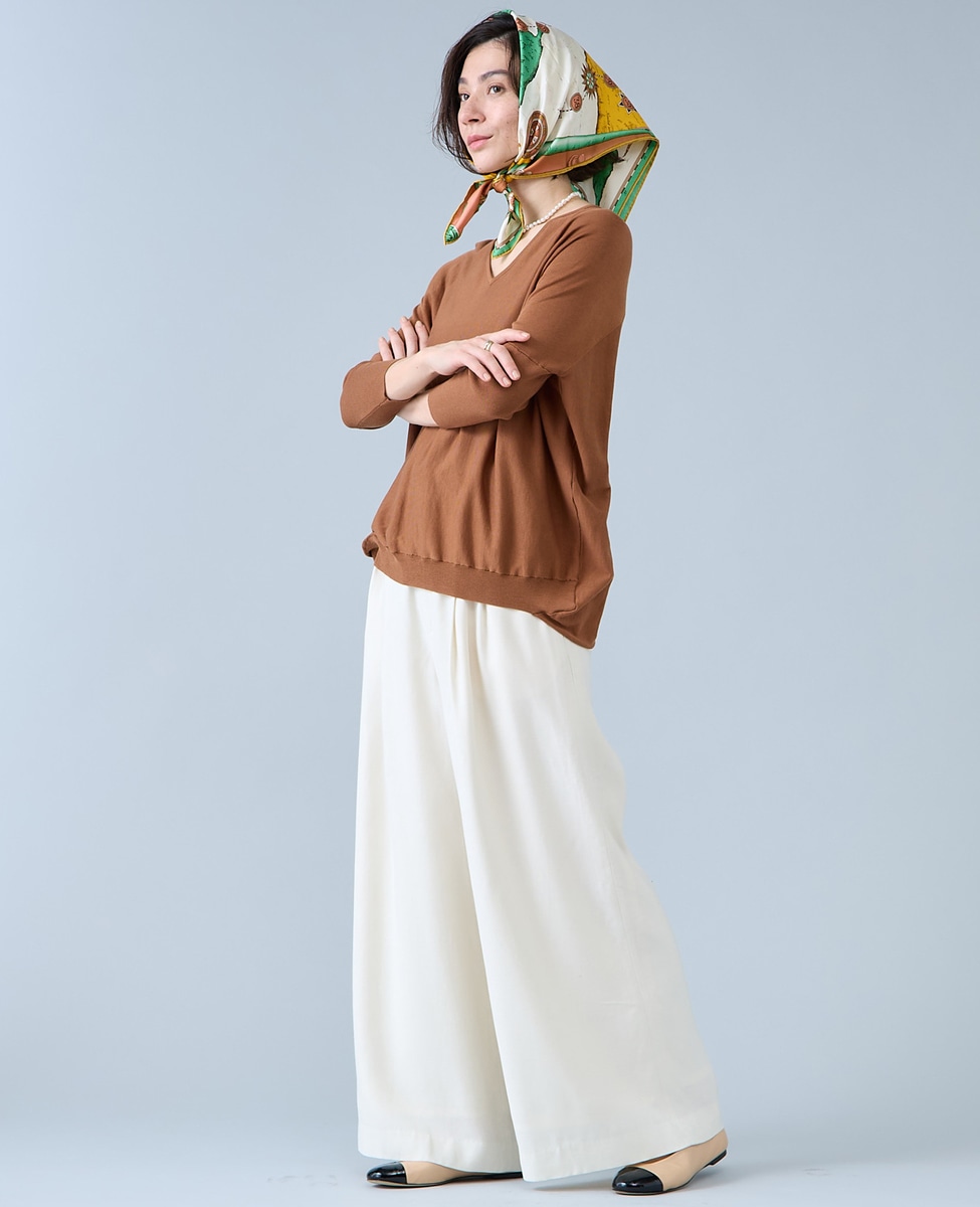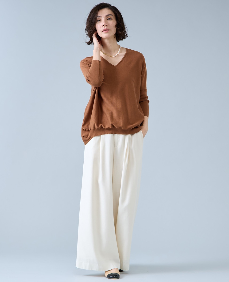 Vネックラインはシルク混で柔らかく、デコルテを上品に演出します。