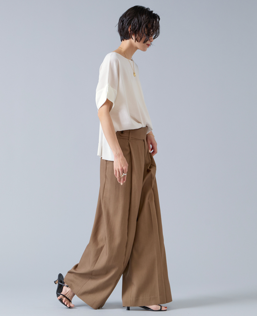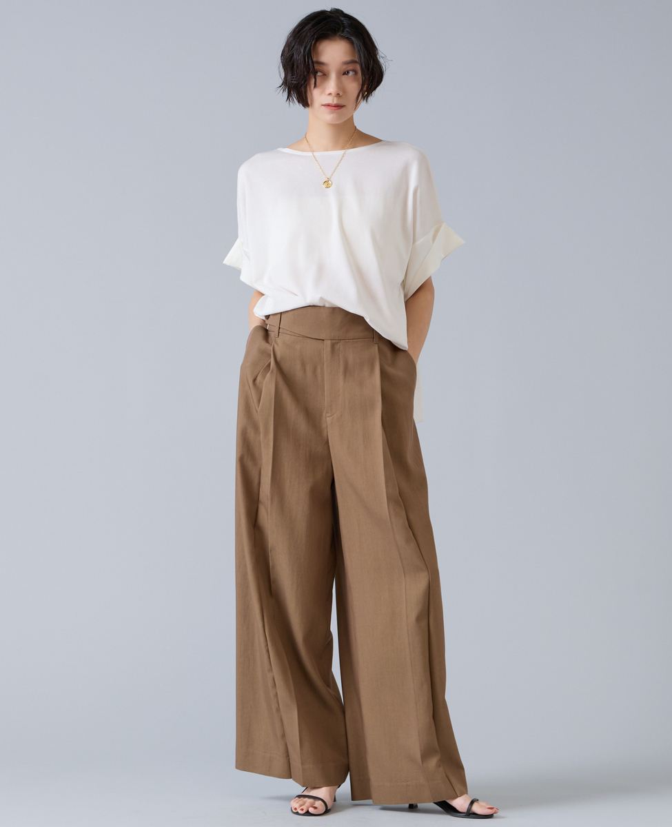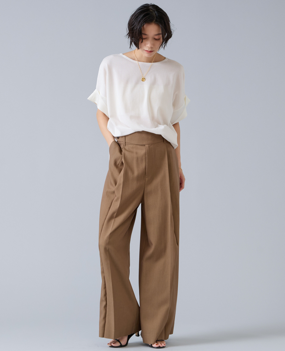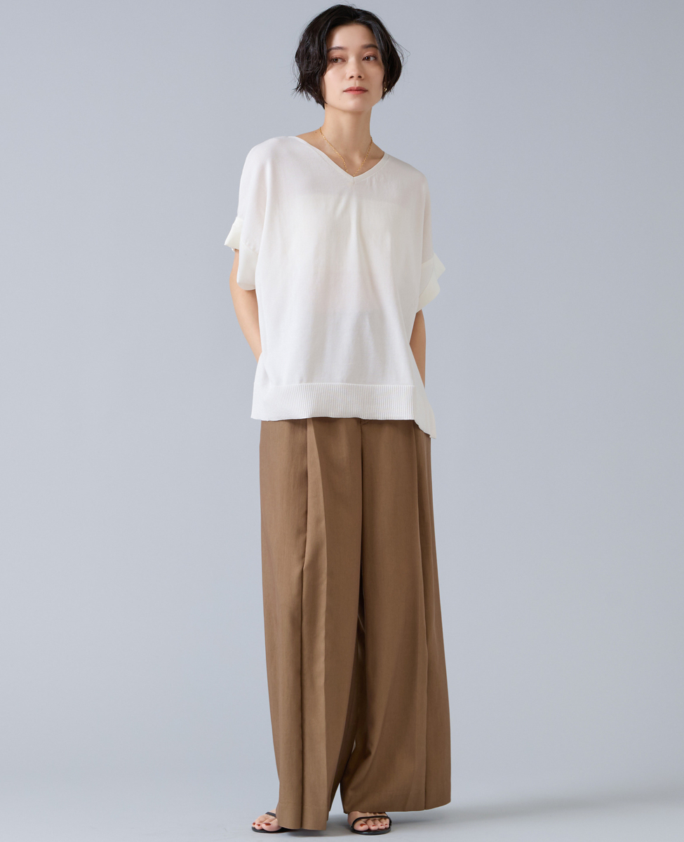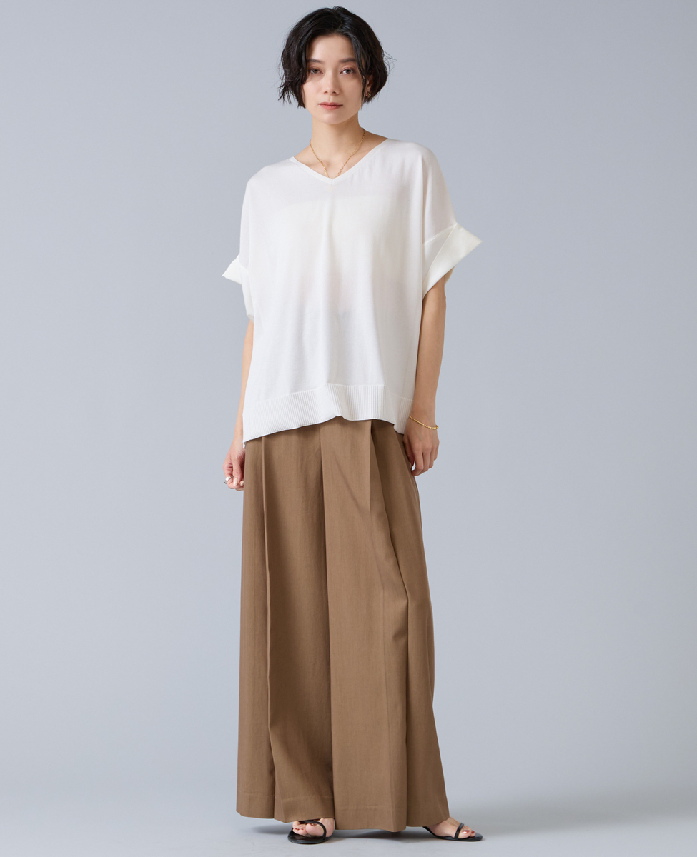 スカートでもパンツでも、ウエストインでもアウトでもバランスよく装えます。