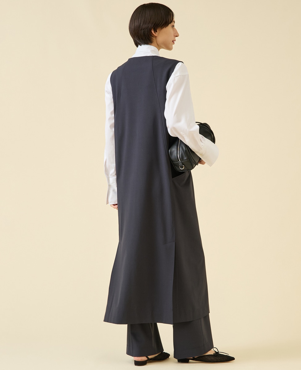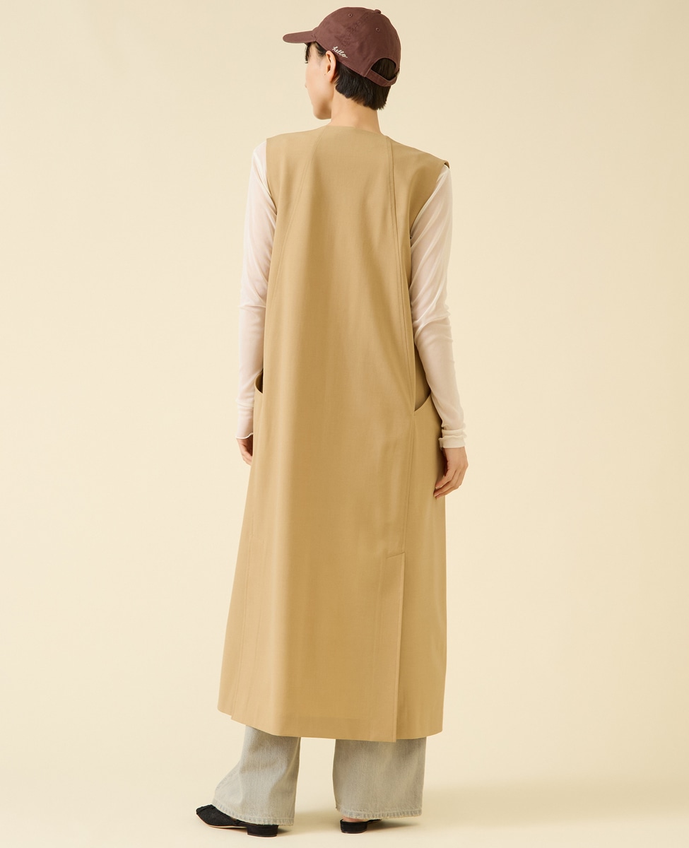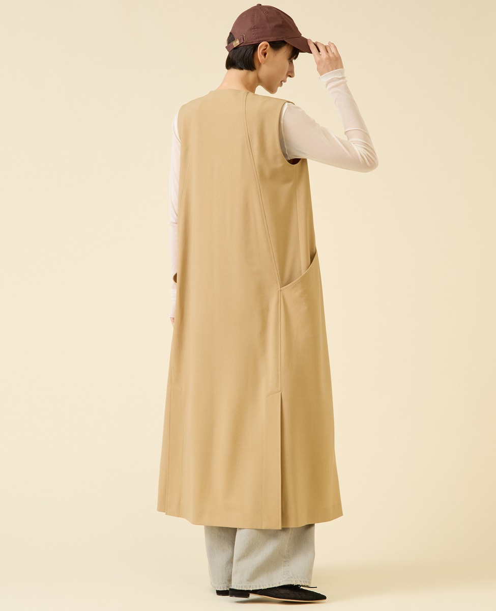 ロングワンピースのようなマスキュリンな雰囲気のジレワンピースです。フロントのポケットが後ろ側に回り込むような立体的なパターンが特徴です。