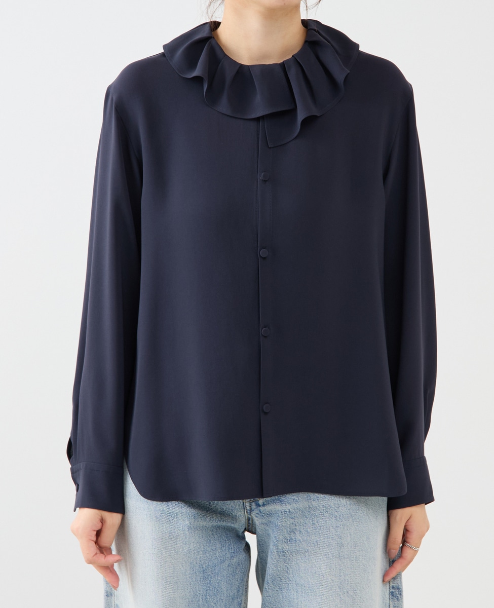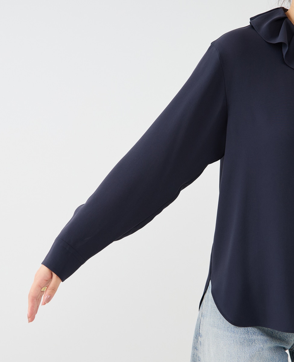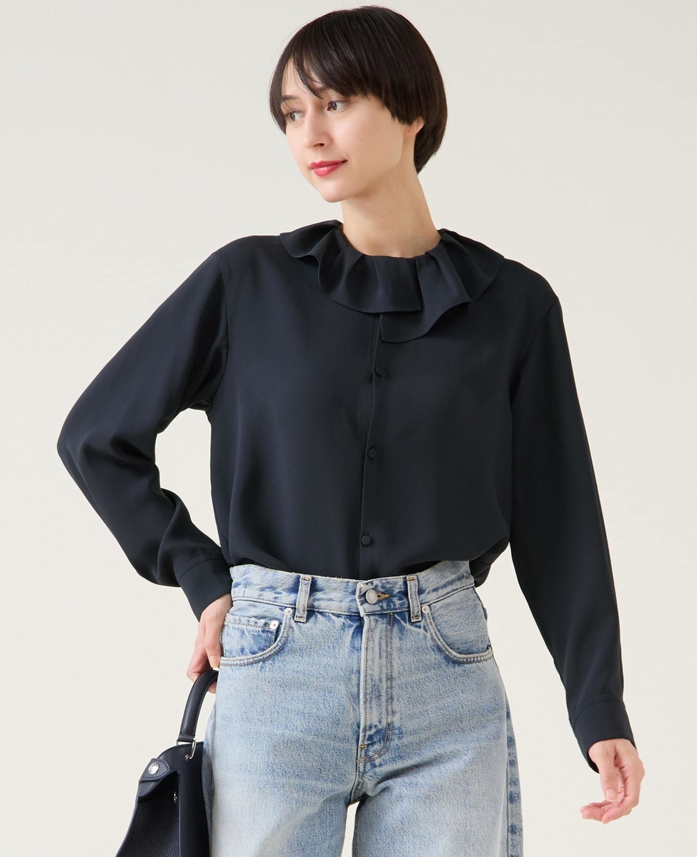 センターフロントをアシンメトリーに仕立てた、洗練された表情のブラウス。それに呼応するように、襟ぐりのフリルも左右非対称にデザインされ、静かな個性を引き立てます。胸元に自然な視線を集めるアクセントとして、一枚で存在感のあるスタイルに。カーディガンのインにも映え、オンオフ問わず着まわせる一着です。