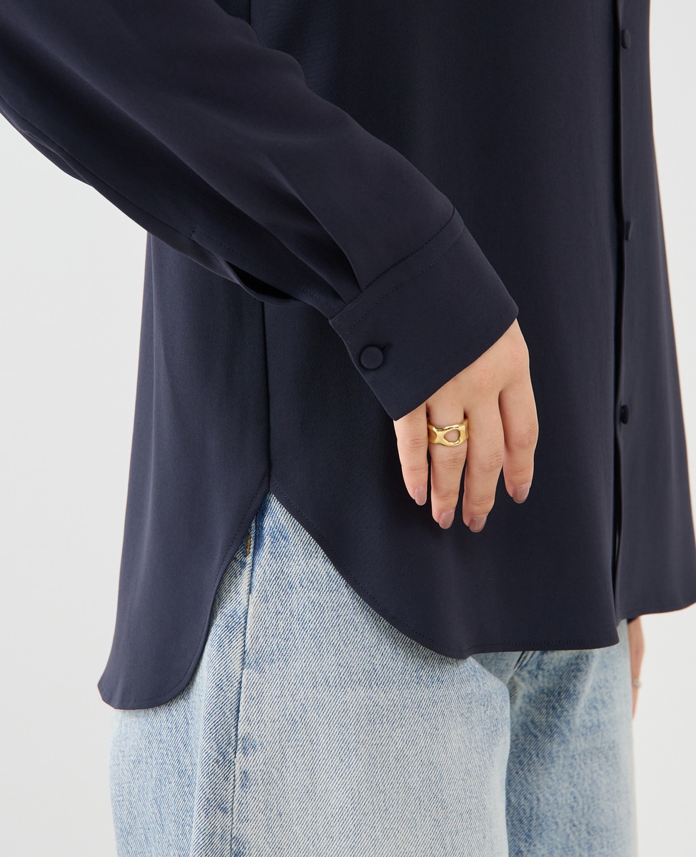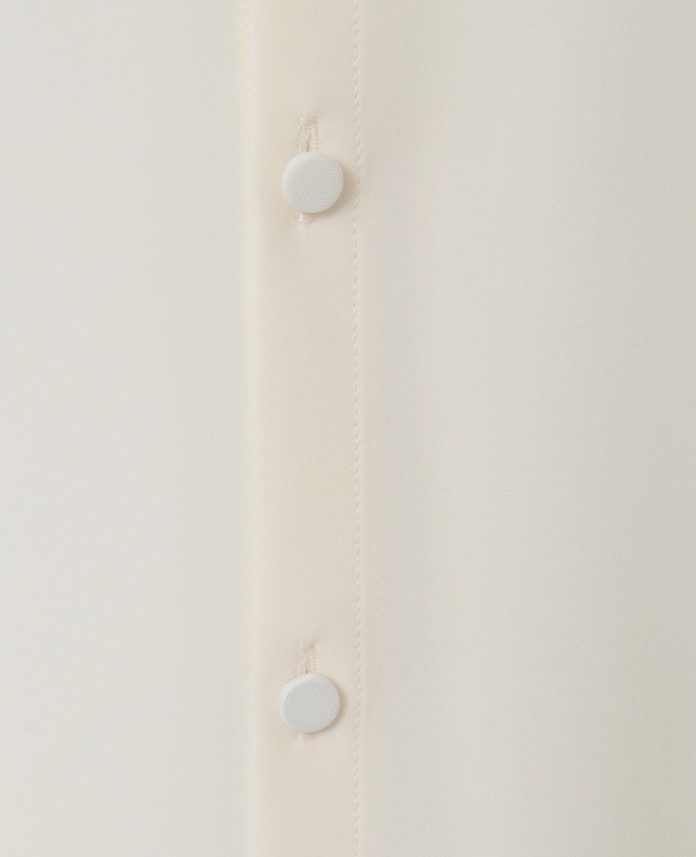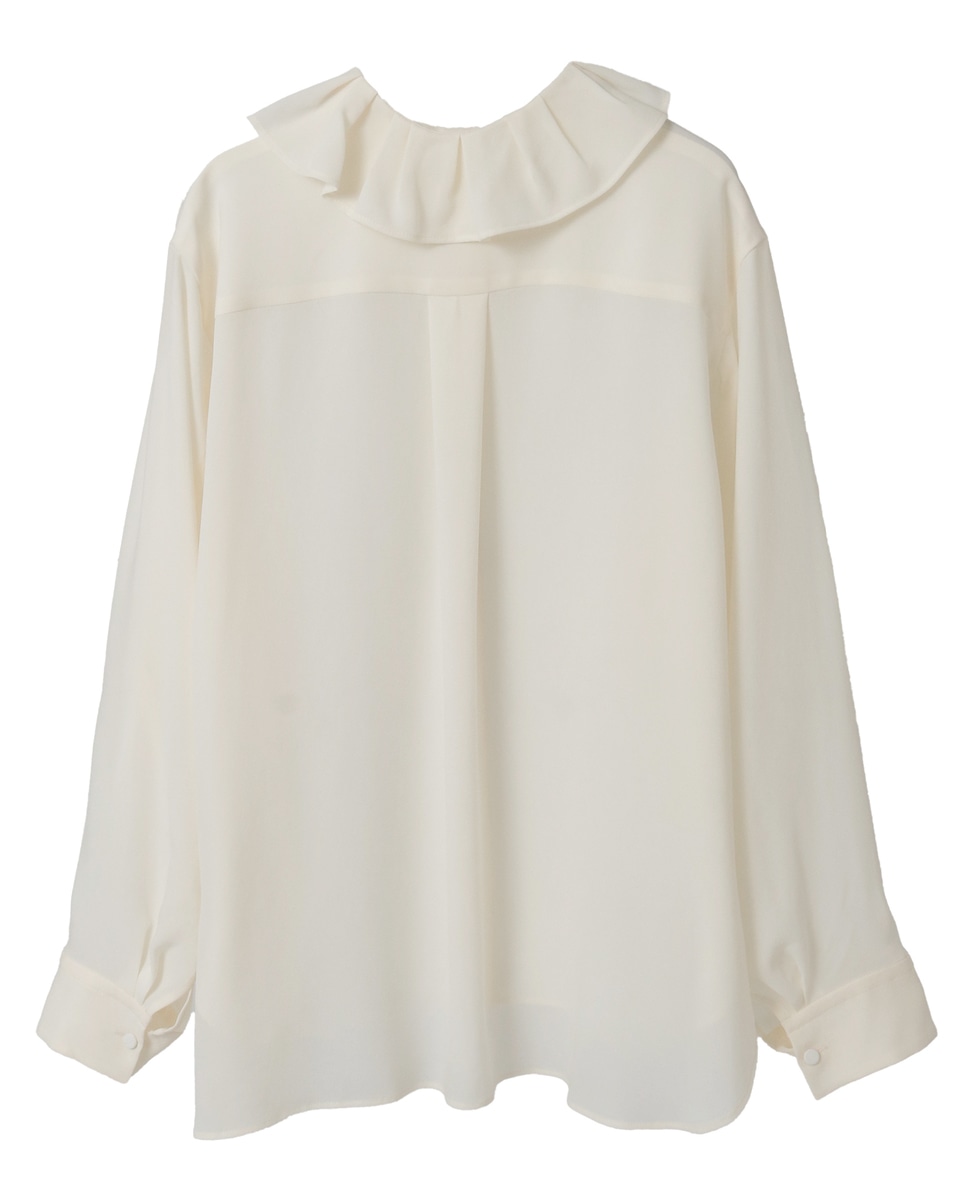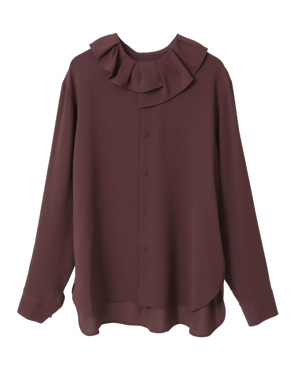 センターフロントをアシンメトリーに仕立てた、洗練された表情のブラウス。それに呼応するように、襟ぐりのフリルも左右非対称にデザインされ、静かな個性を引き立てます。胸元に自然な視線を集めるアクセントとして、一枚で存在感のあるスタイルに。カーディガンのインにも映え、オンオフ問わず着まわせる一着です。