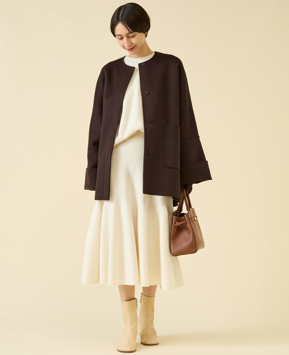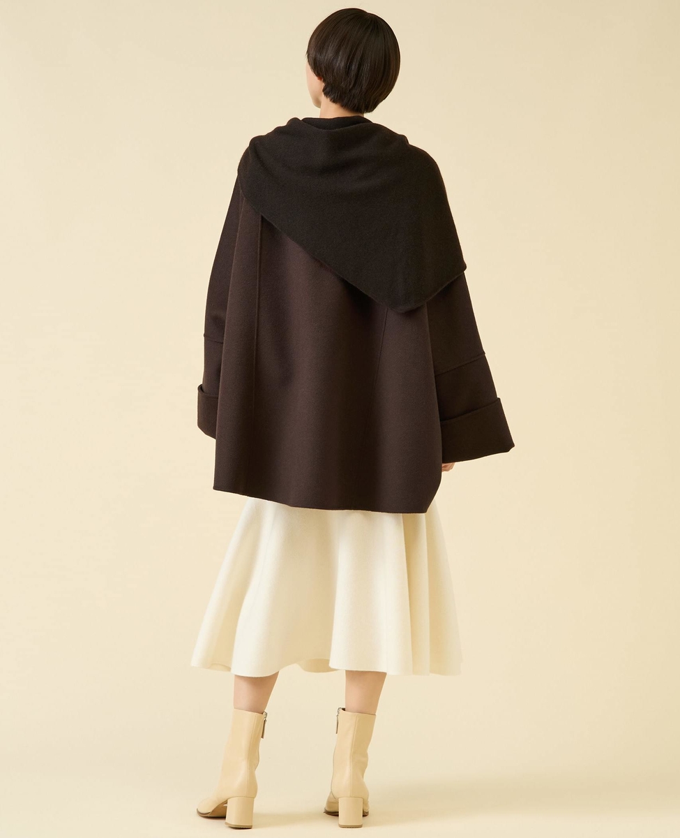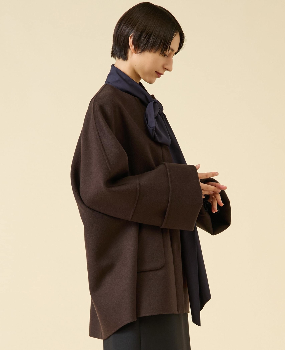 身幅は思い切り大きくした、ポンチョのようなノーカラーコートです。長めの袖丈でラフに折り返すのがポイントです。お尻下丈で様々なボトムと合わせやすい丈感です。