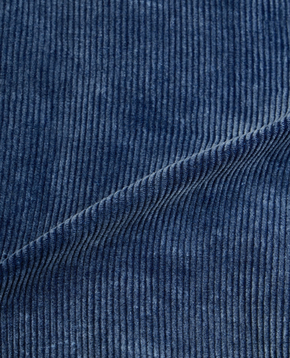 インディゴ染コットンコーデュロイを使用。ブリーチ加工でヴィンテージのようなこなれた色と風合いに仕上げています。インナーを選ばないゆったりとしたサイジングですが、逆三角形のシルエットで腰回りがダボつかずすっきりと見えるのもポイントです。