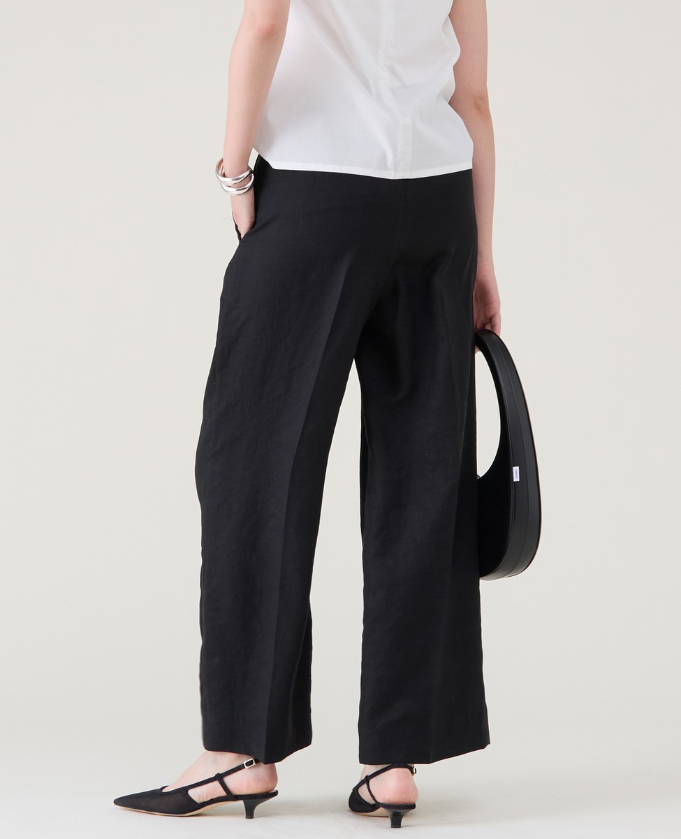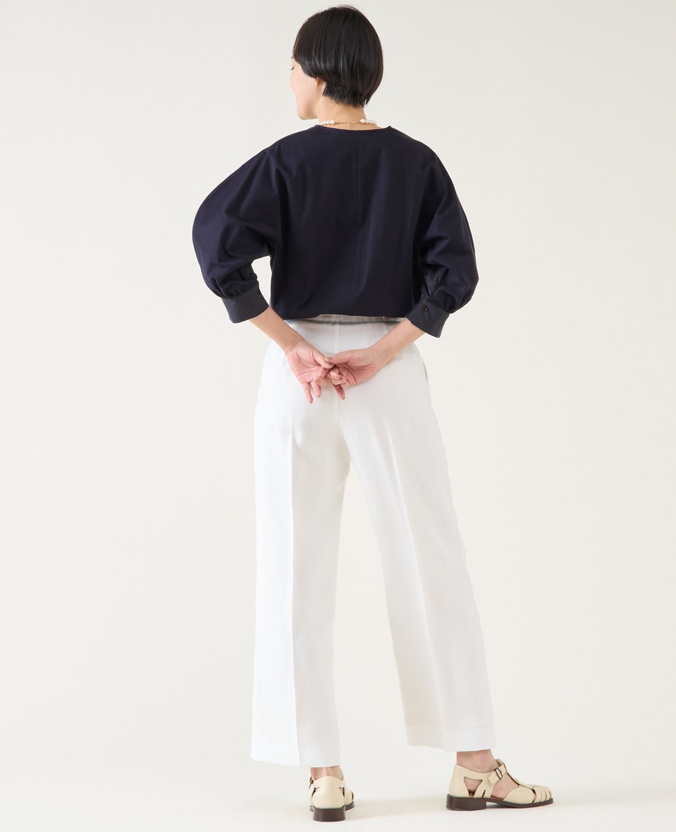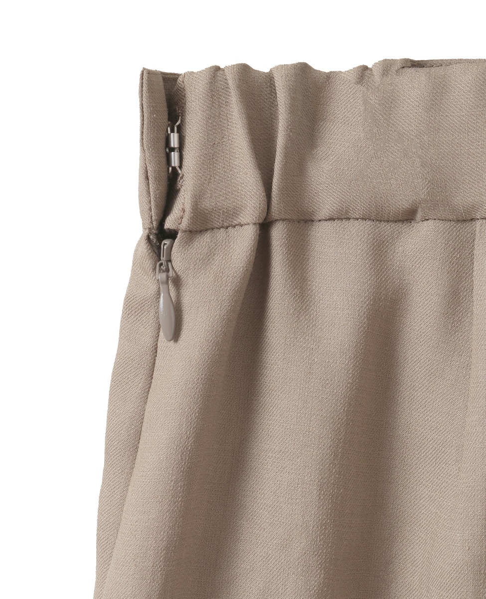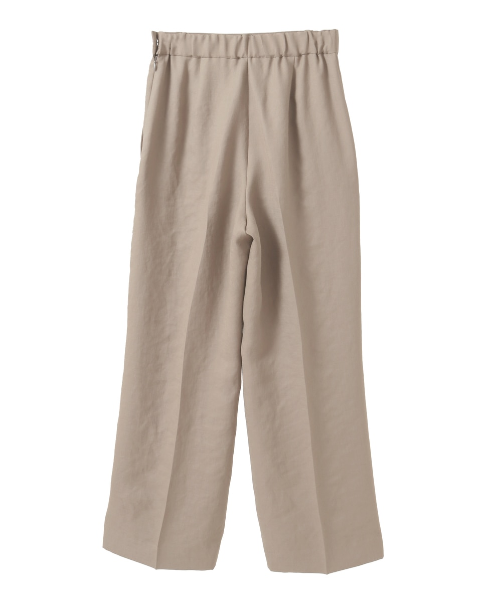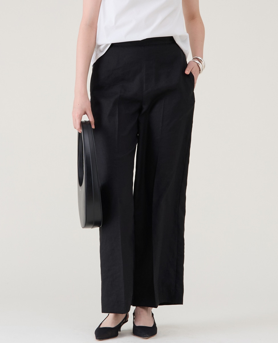 センタープレスが入ったキレイめワイドパンツ。サイドファスナーのバックゴム仕様なので着用感もよいのがポイント。ゴム仕様ですがヒップが膨らみすぎないバランス感に。