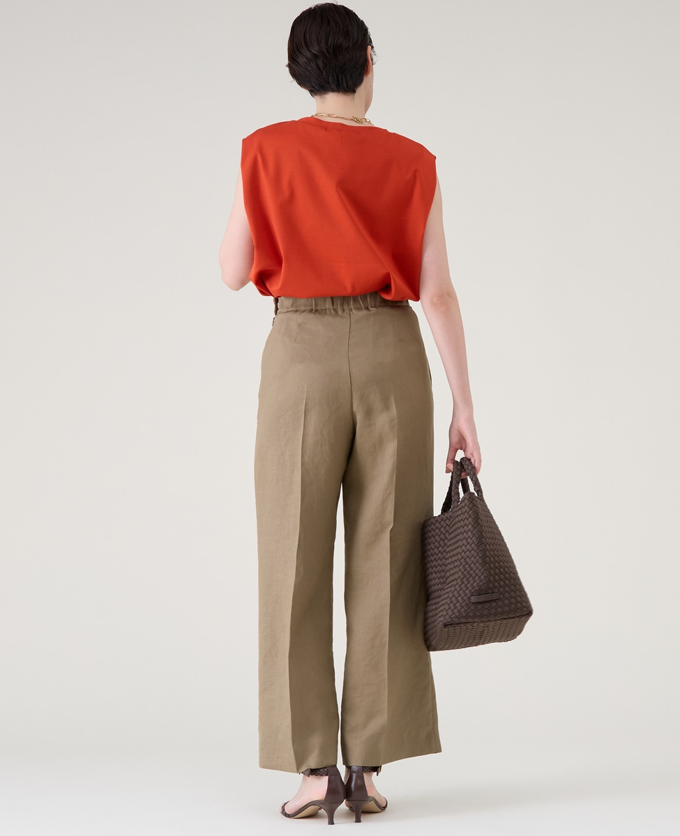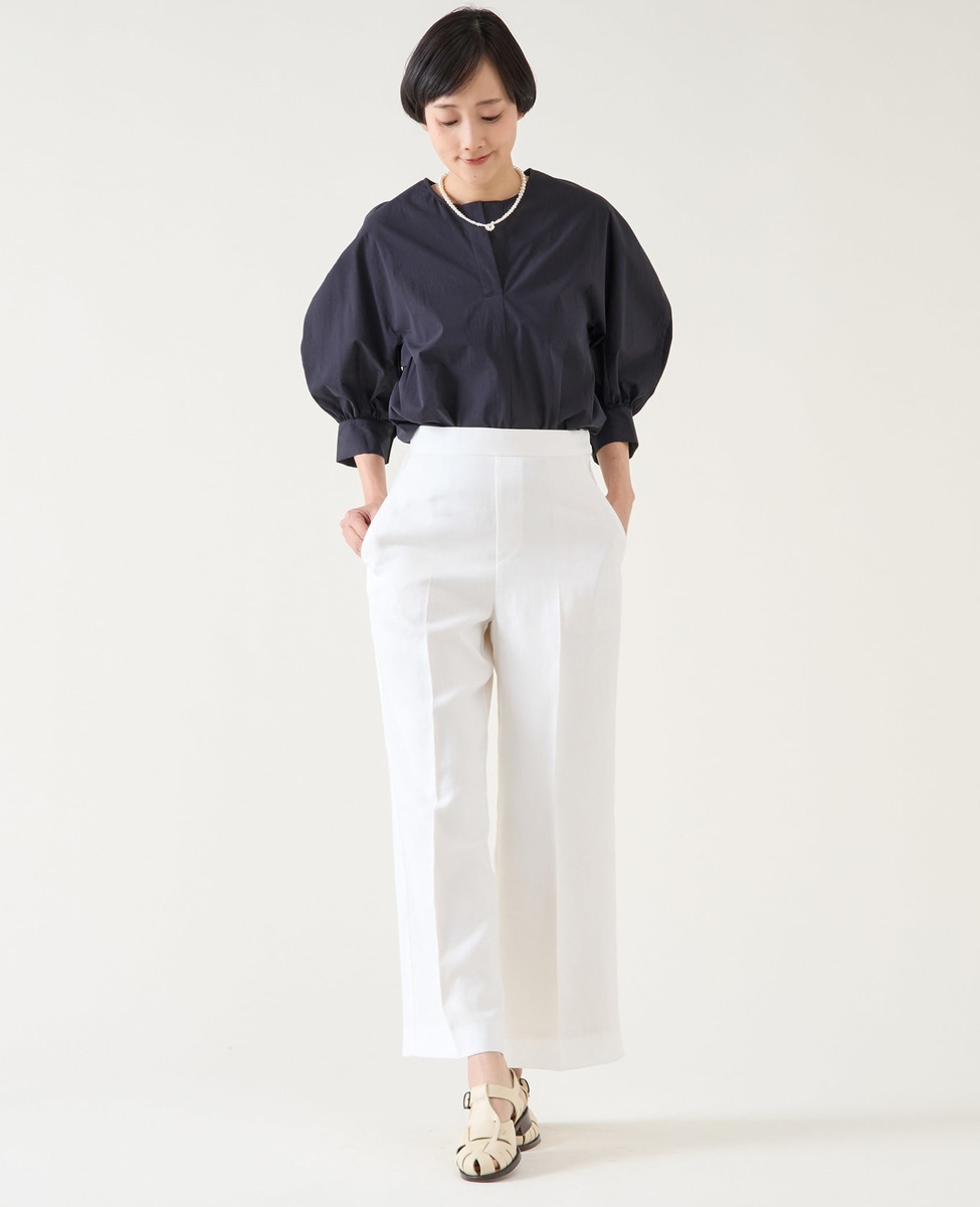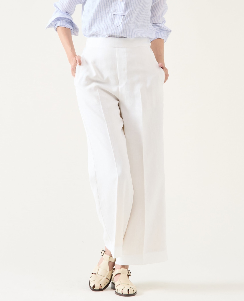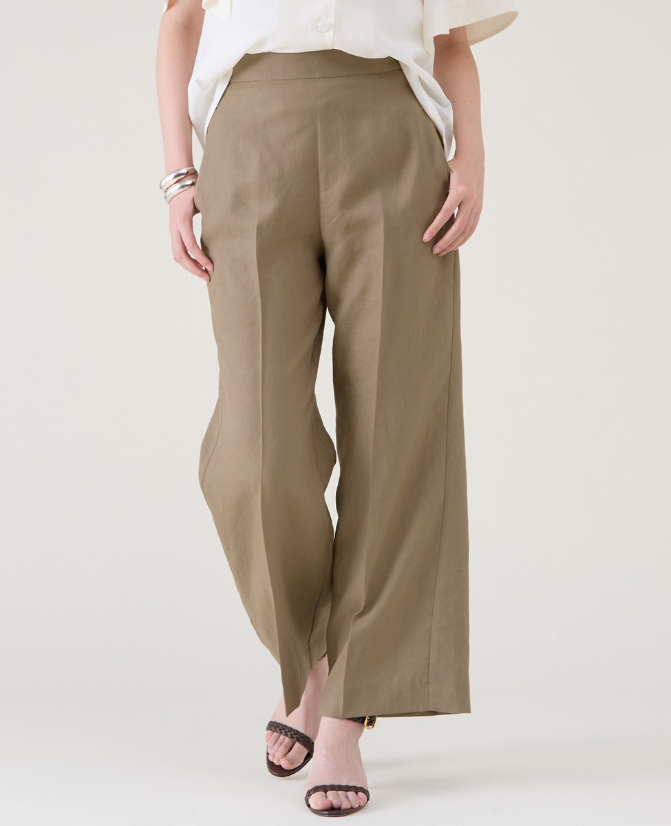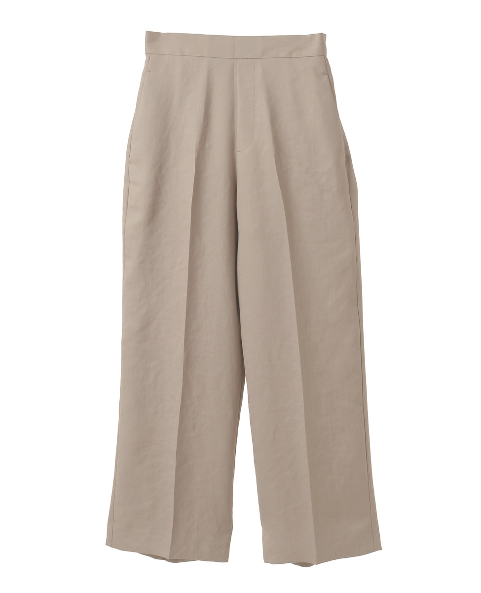 センタープレスが入ったキレイめワイドパンツ。サイドファスナーのバックゴム仕様なので着用感もよいのがポイント。ゴム仕様ですがヒップが膨らみすぎないバランス感に。