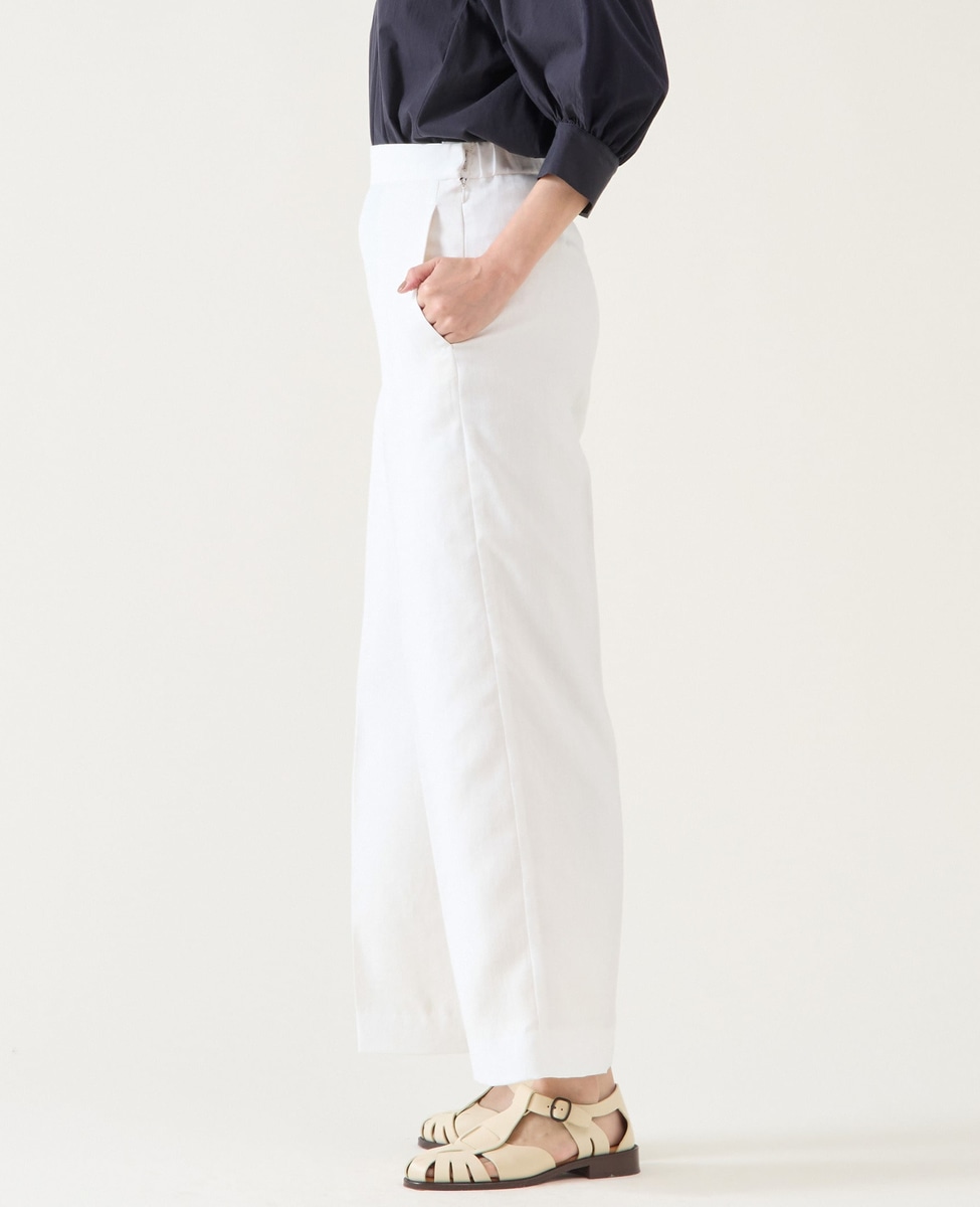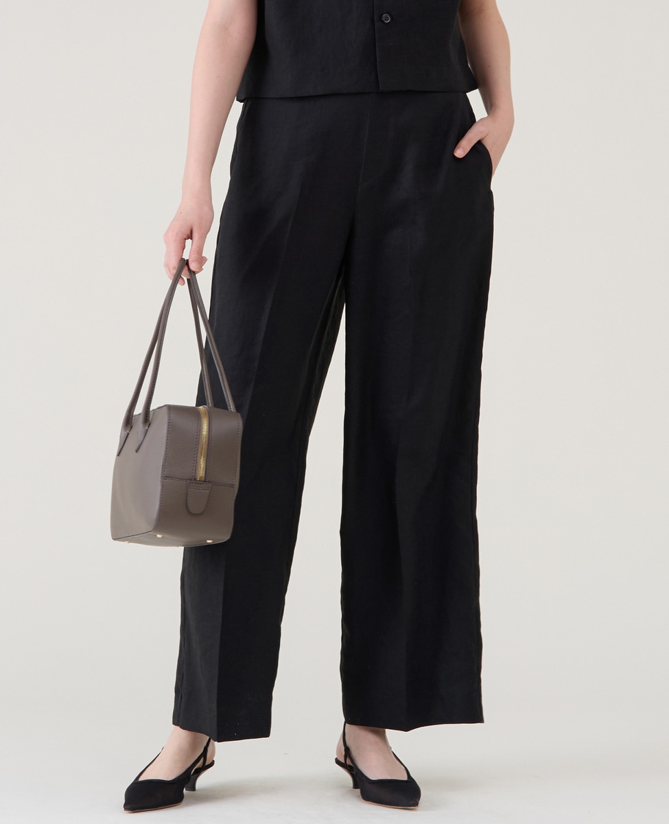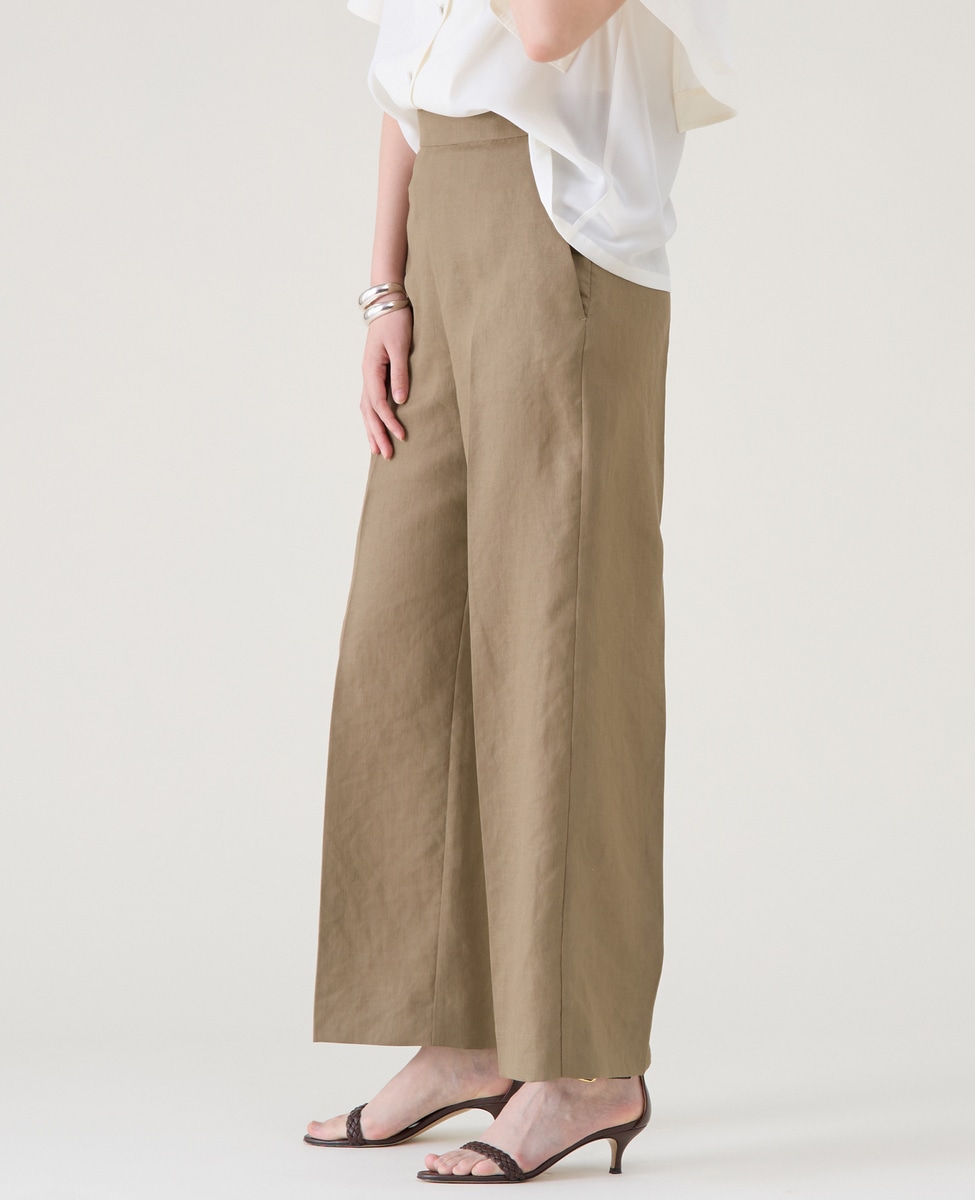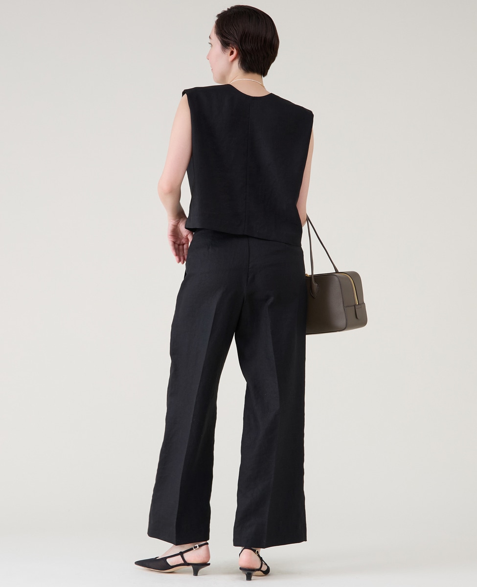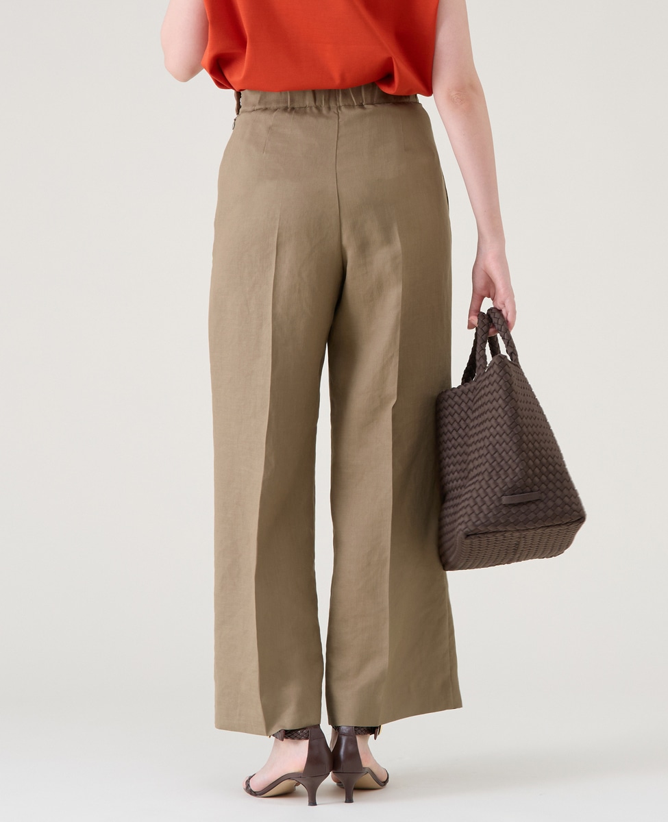センタープレスが入ったキレイめワイドパンツ。サイドファスナーのバックゴム仕様なので着用感もよいのがポイント。ゴム仕様ですがヒップが膨らみすぎないバランス感に。