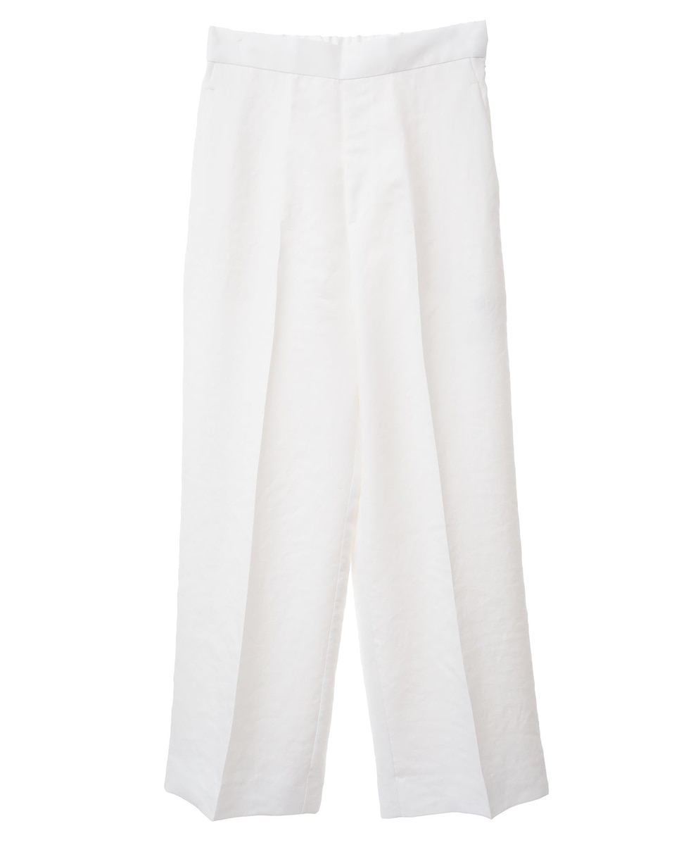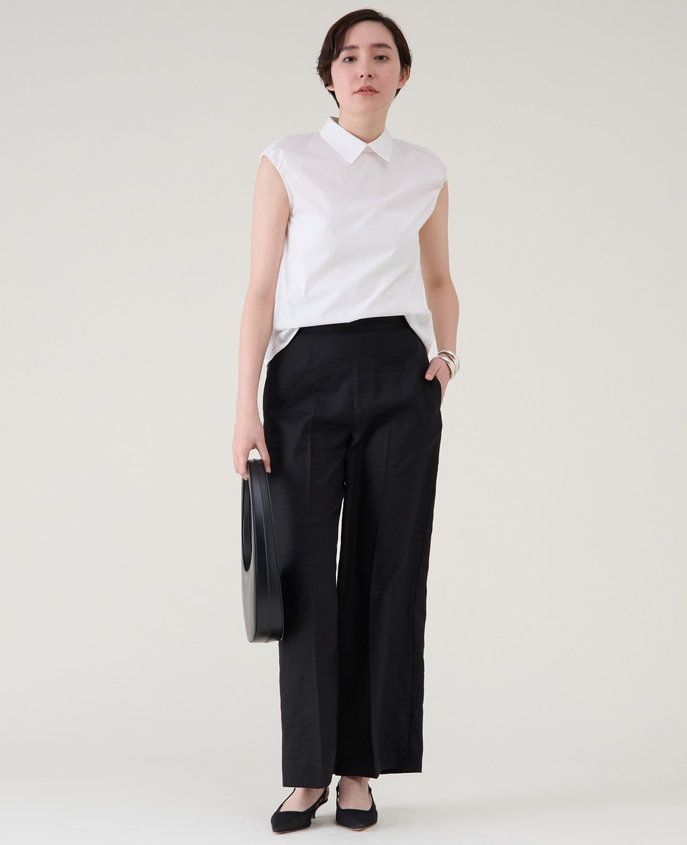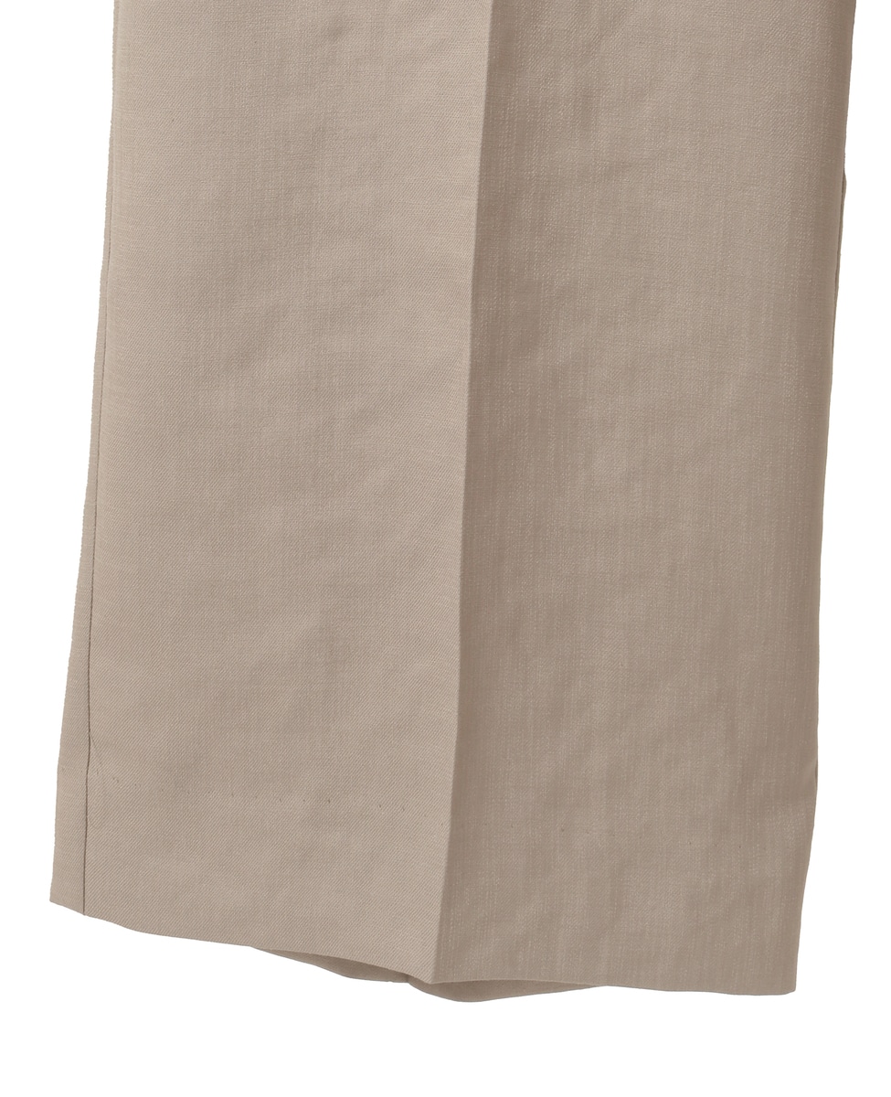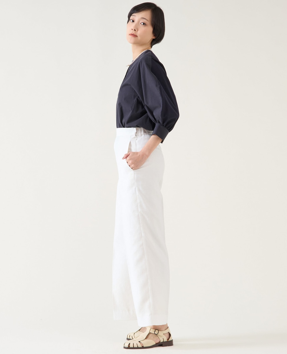 センタープレスが入ったキレイめワイドパンツ。サイドファスナーのバックゴム仕様なので着用感もよいのがポイント。ゴム仕様ですがヒップが膨らみすぎないバランス感に。