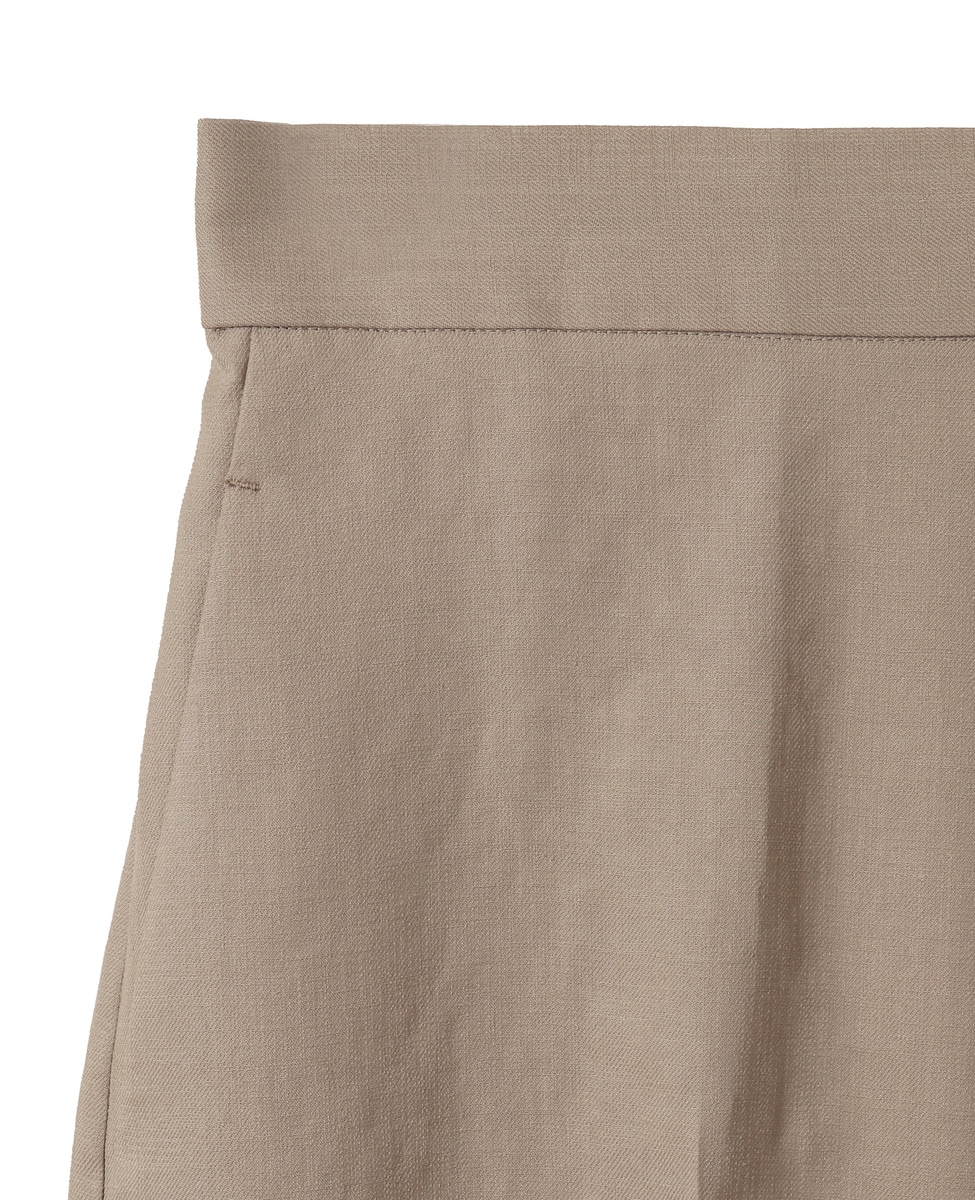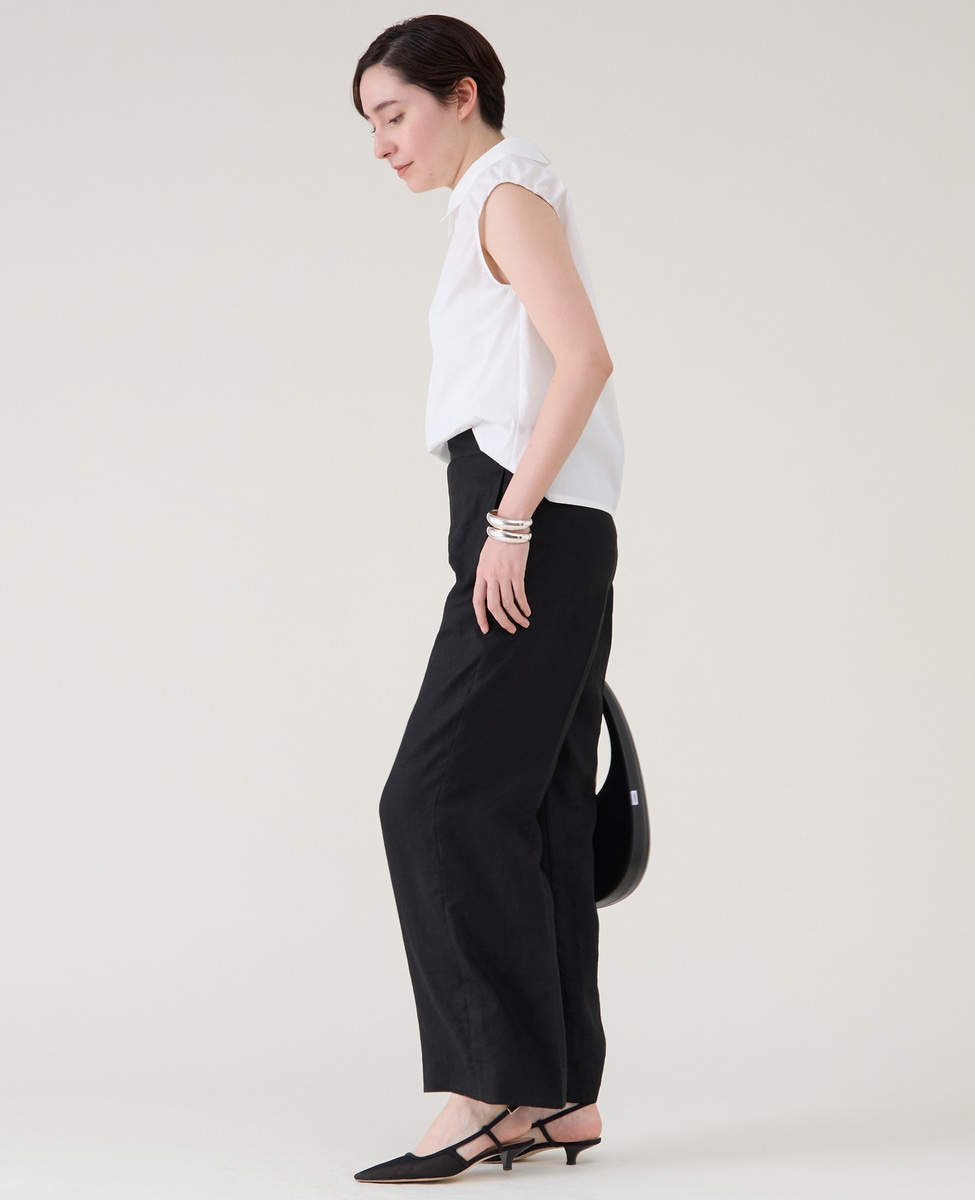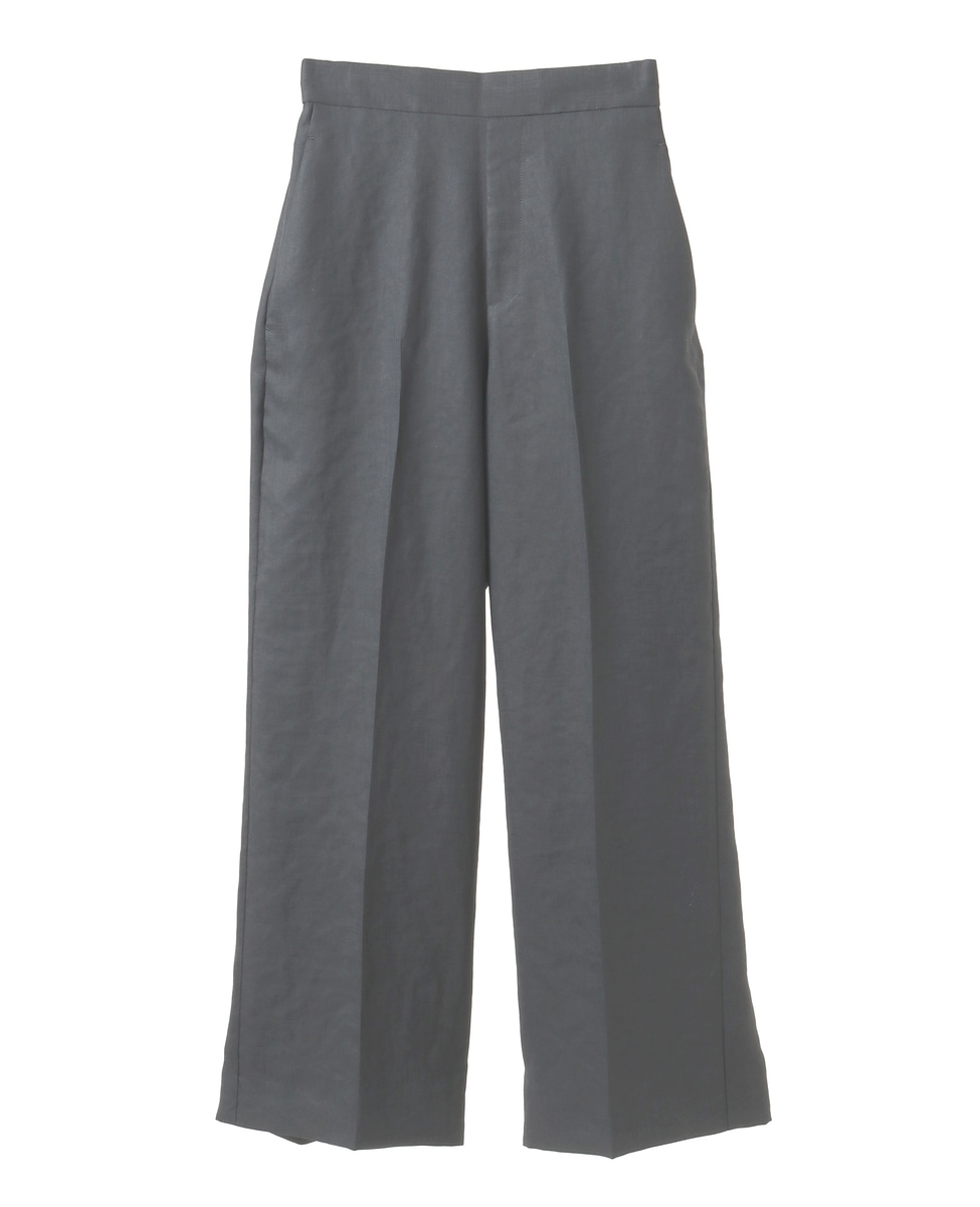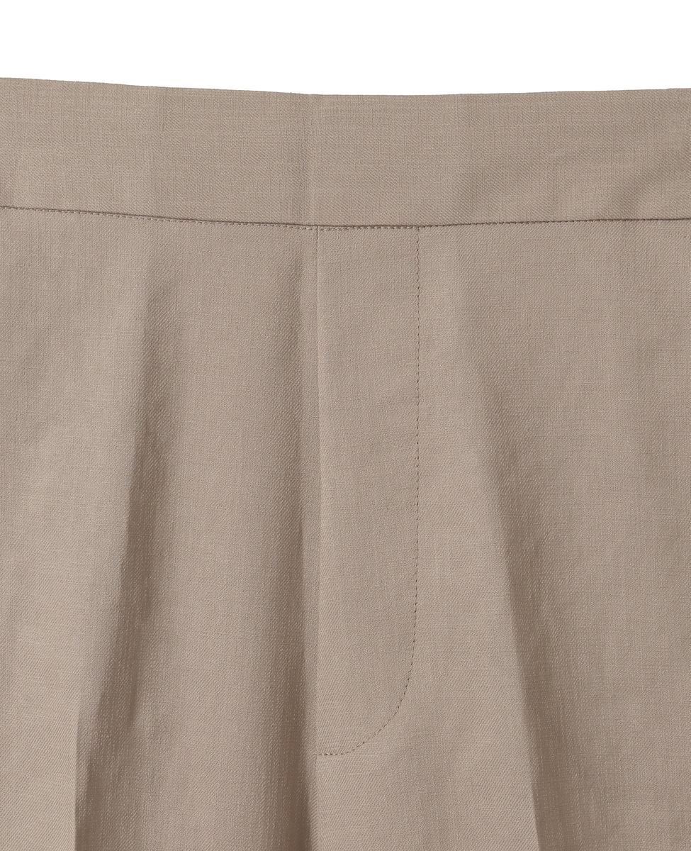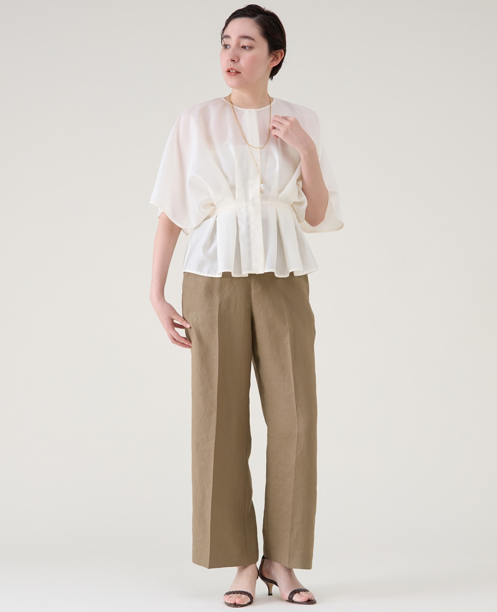 センタープレスが入ったキレイめワイドパンツ。サイドファスナーのバックゴム仕様なので着用感もよいのがポイント。ゴム仕様ですがヒップが膨らみすぎないバランス感に。