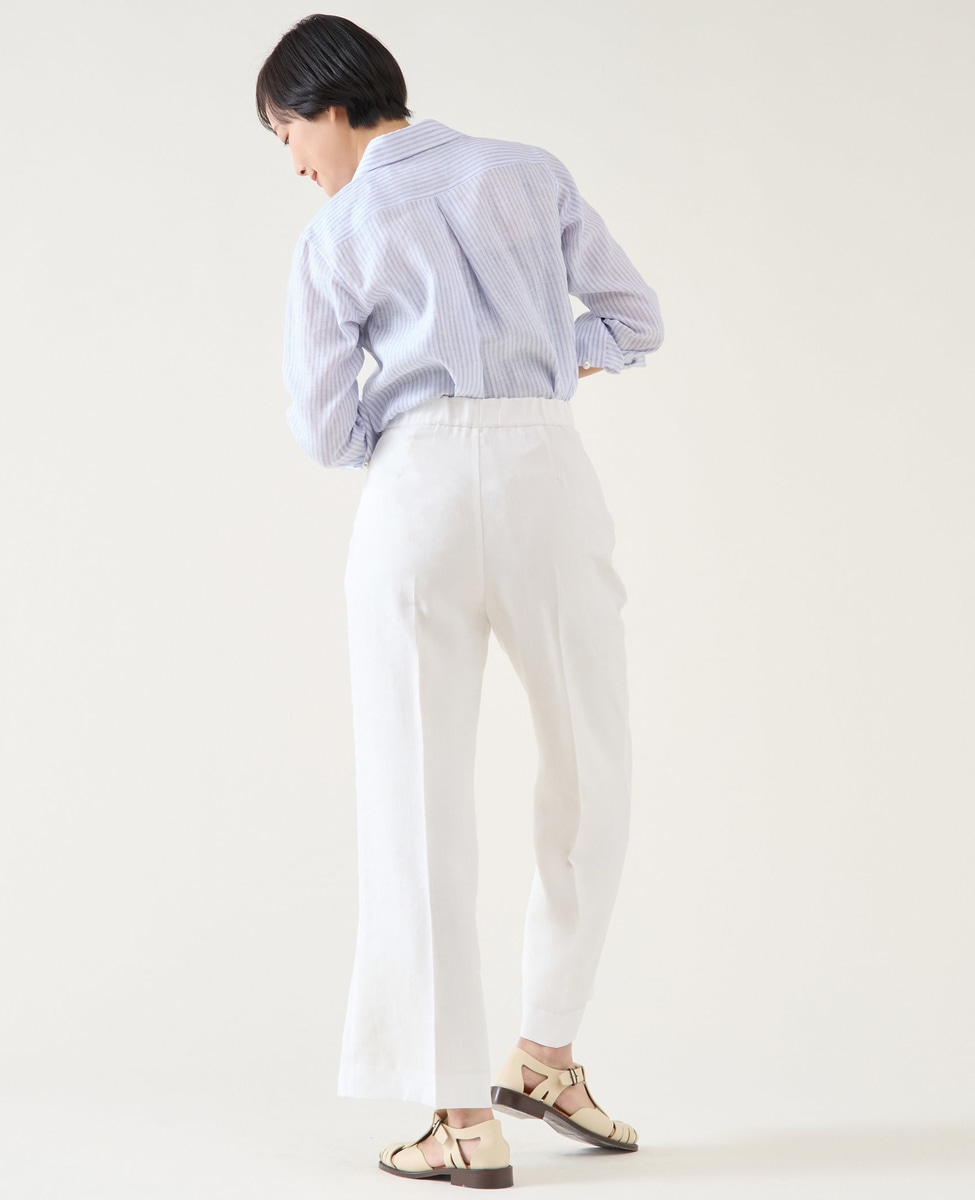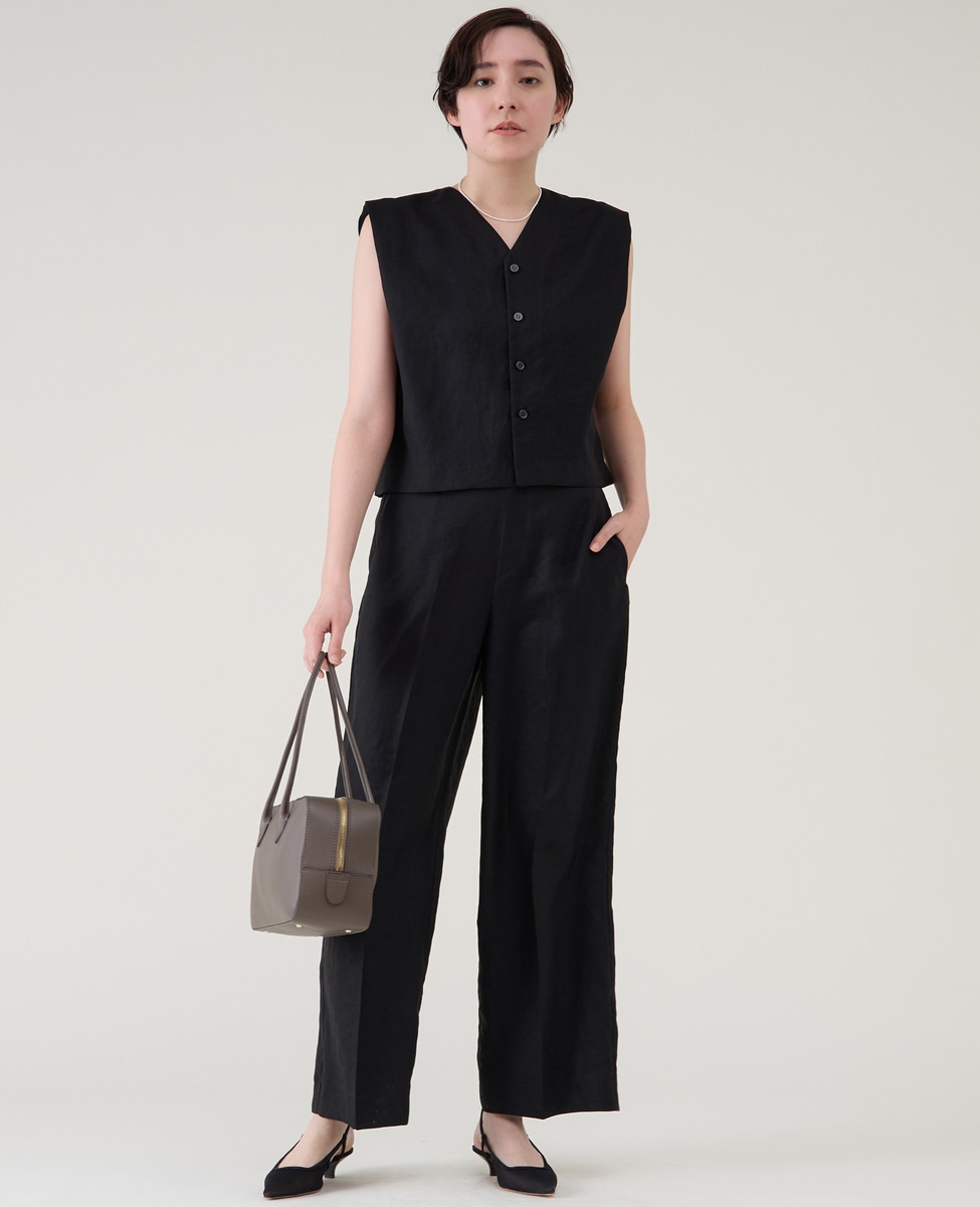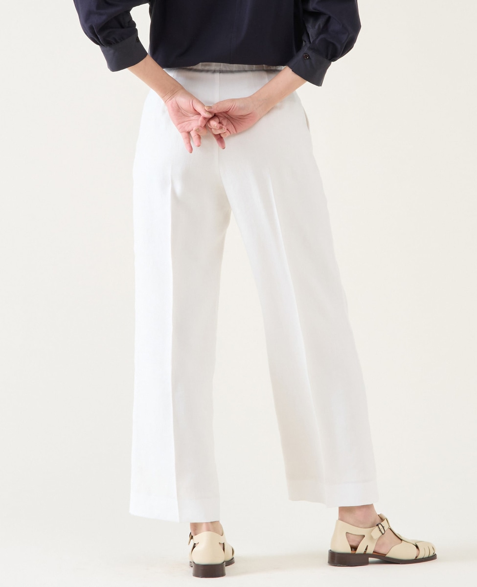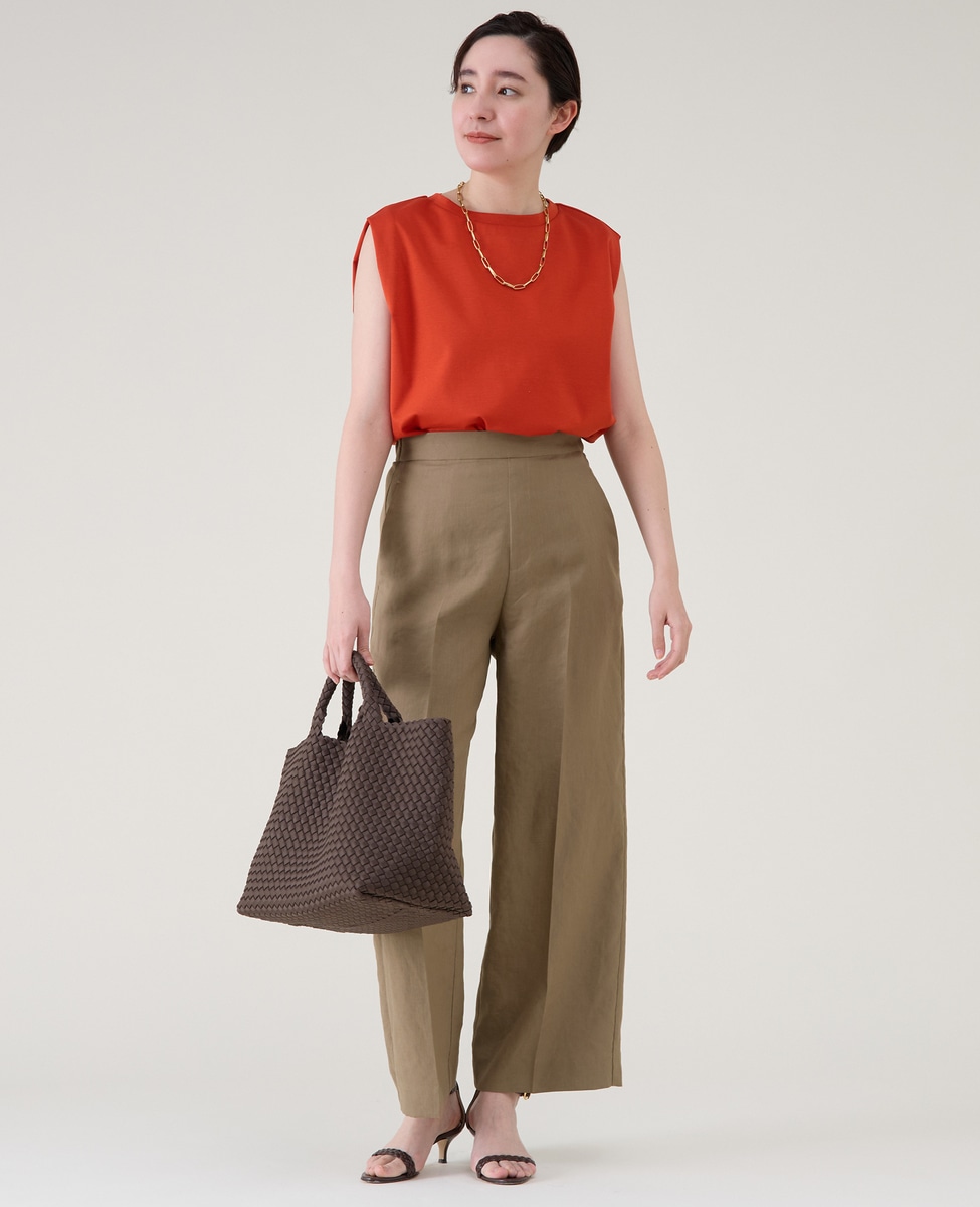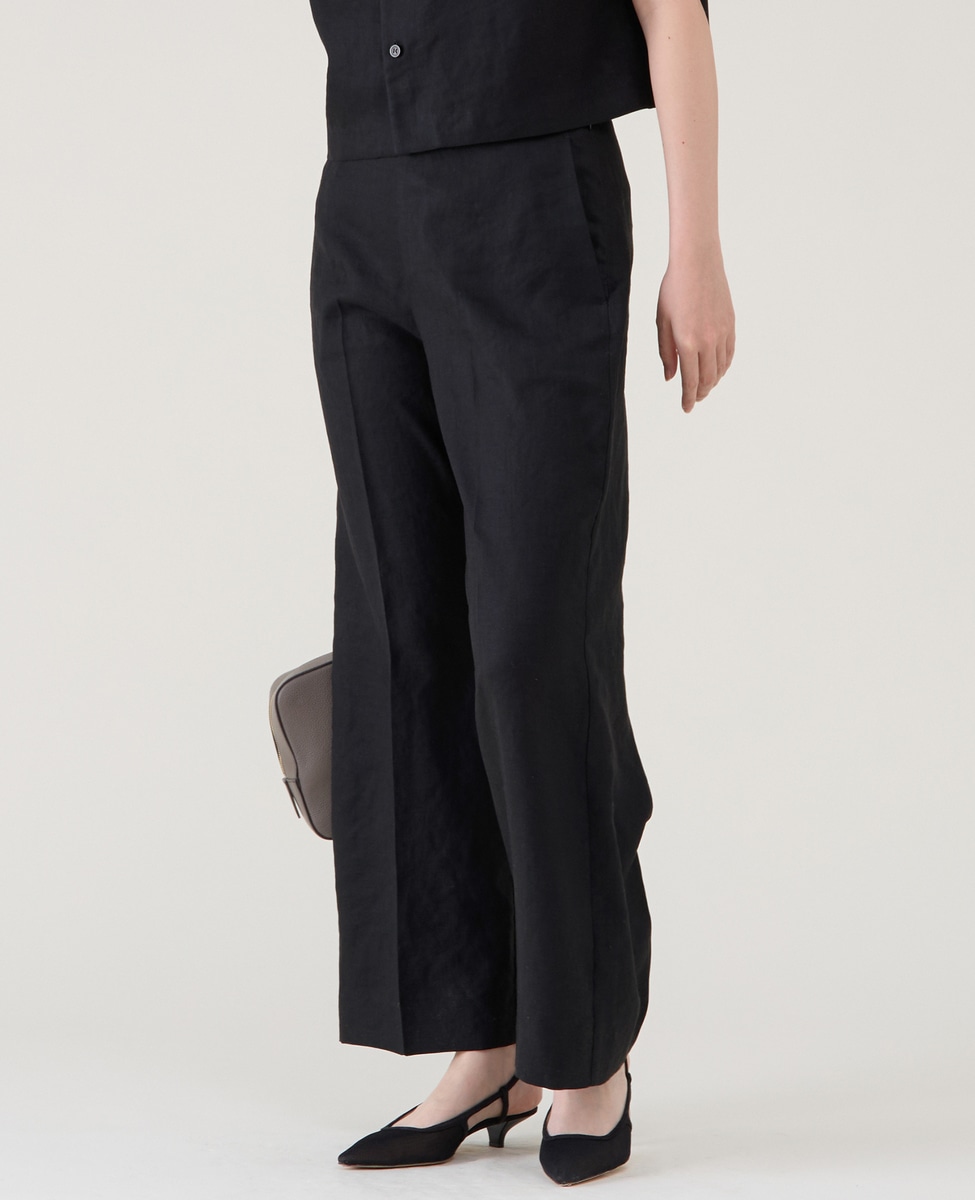 センタープレスが入ったキレイめワイドパンツ。サイドファスナーのバックゴム仕様なので着用感もよいのがポイント。ゴム仕様ですがヒップが膨らみすぎないバランス感に。