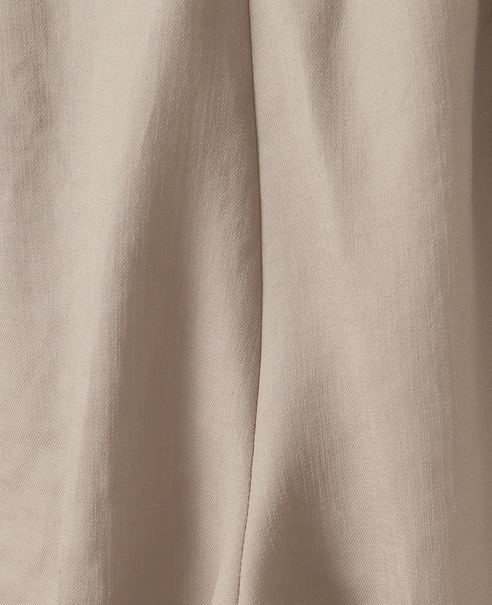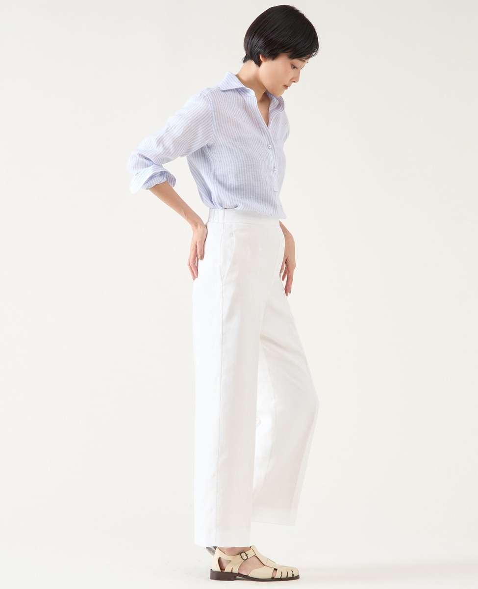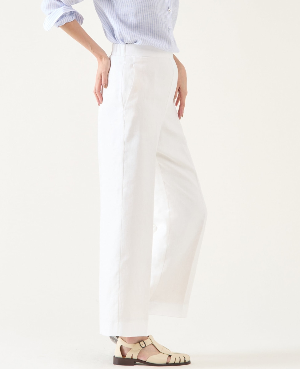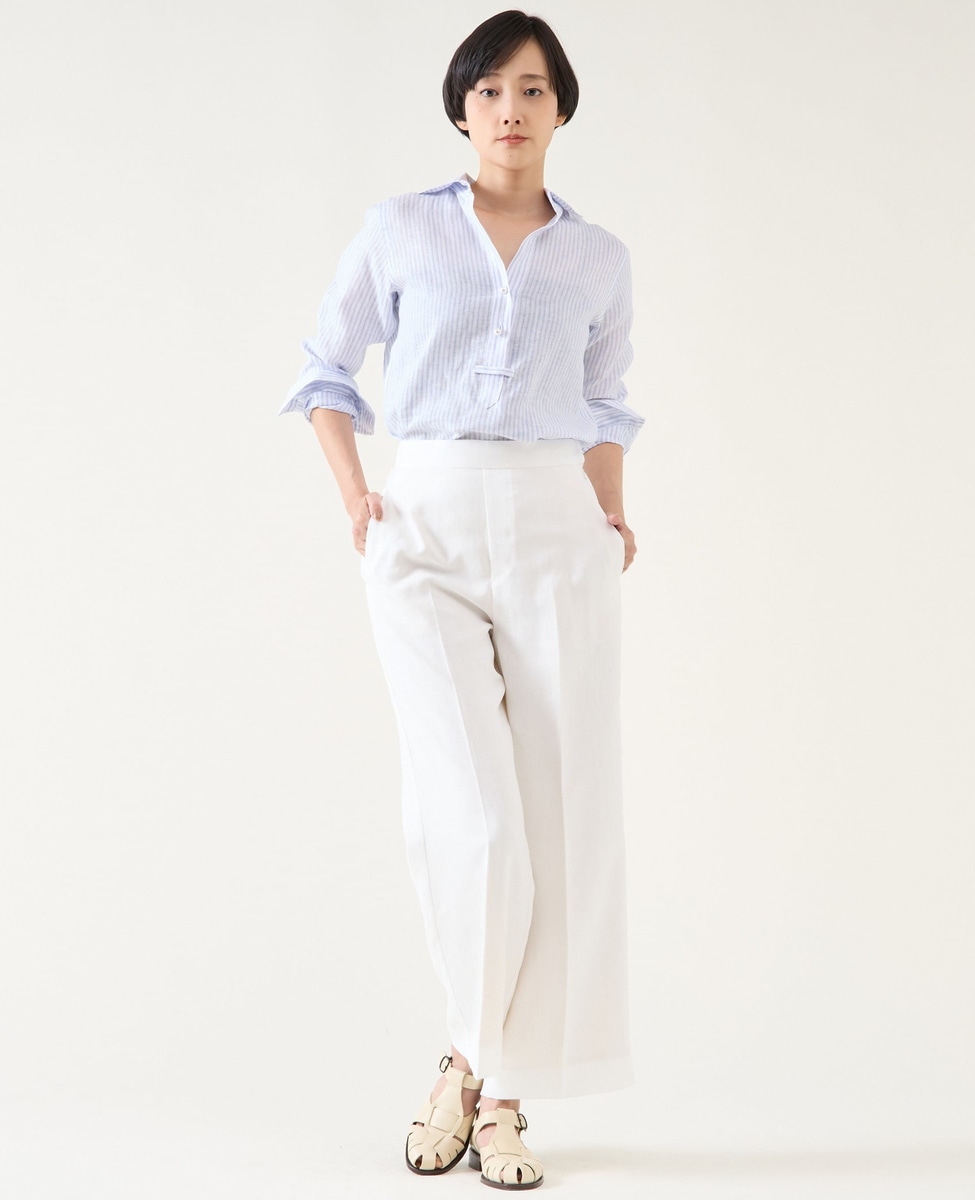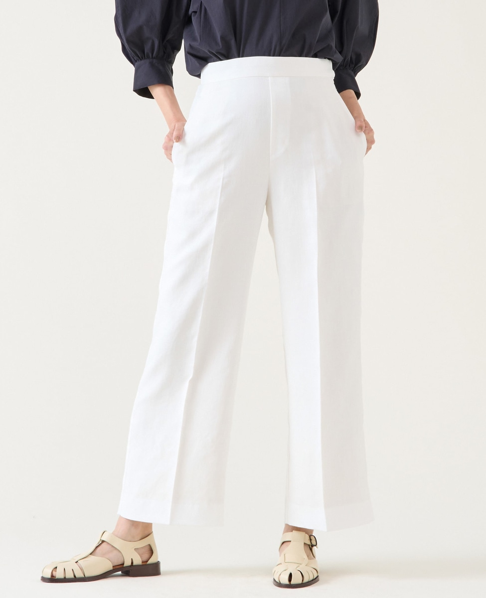 センタープレスが入ったキレイめワイドパンツ。サイドファスナーのバックゴム仕様なので着用感もよいのがポイント。ゴム仕様ですがヒップが膨らみすぎないバランス感に。