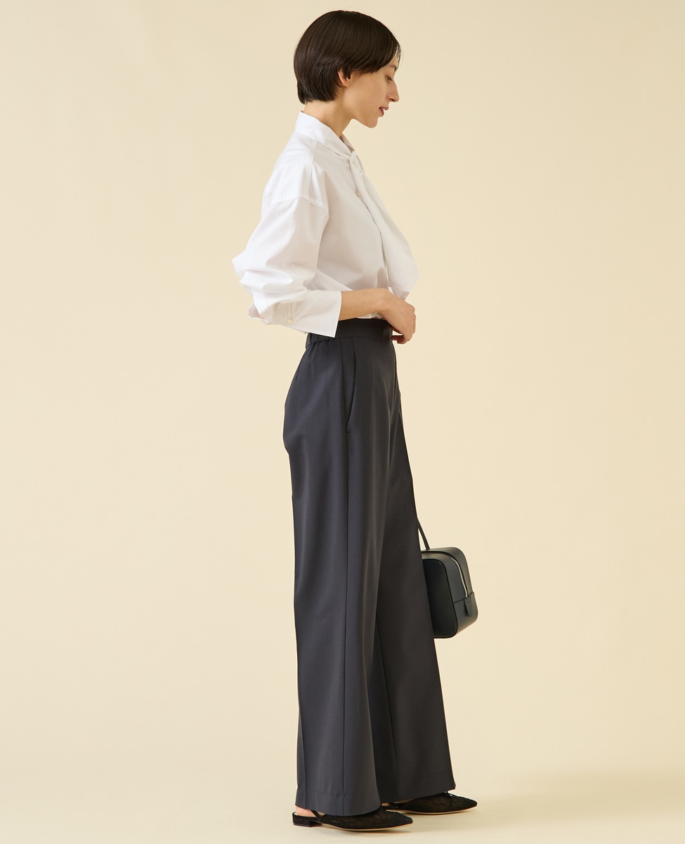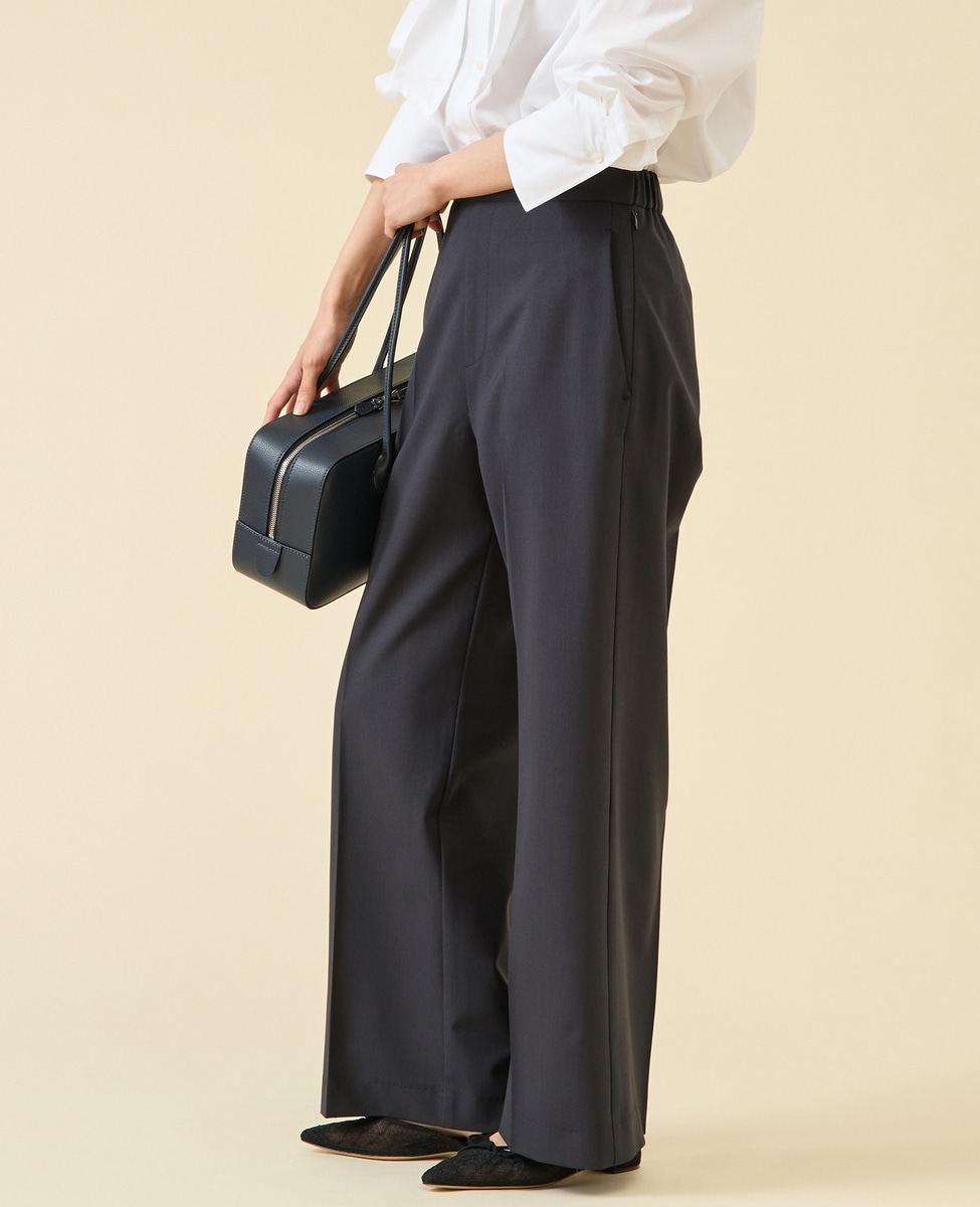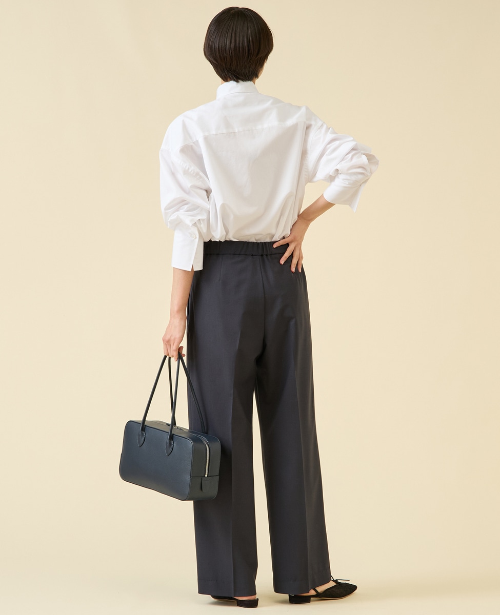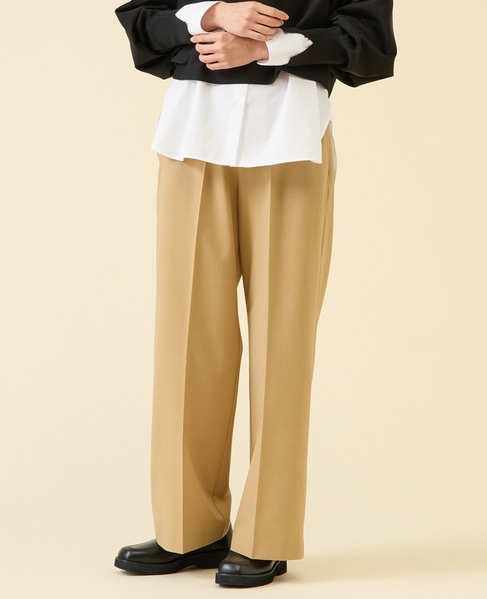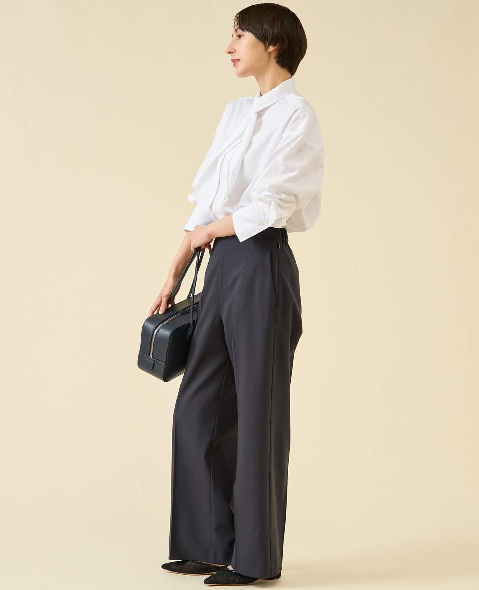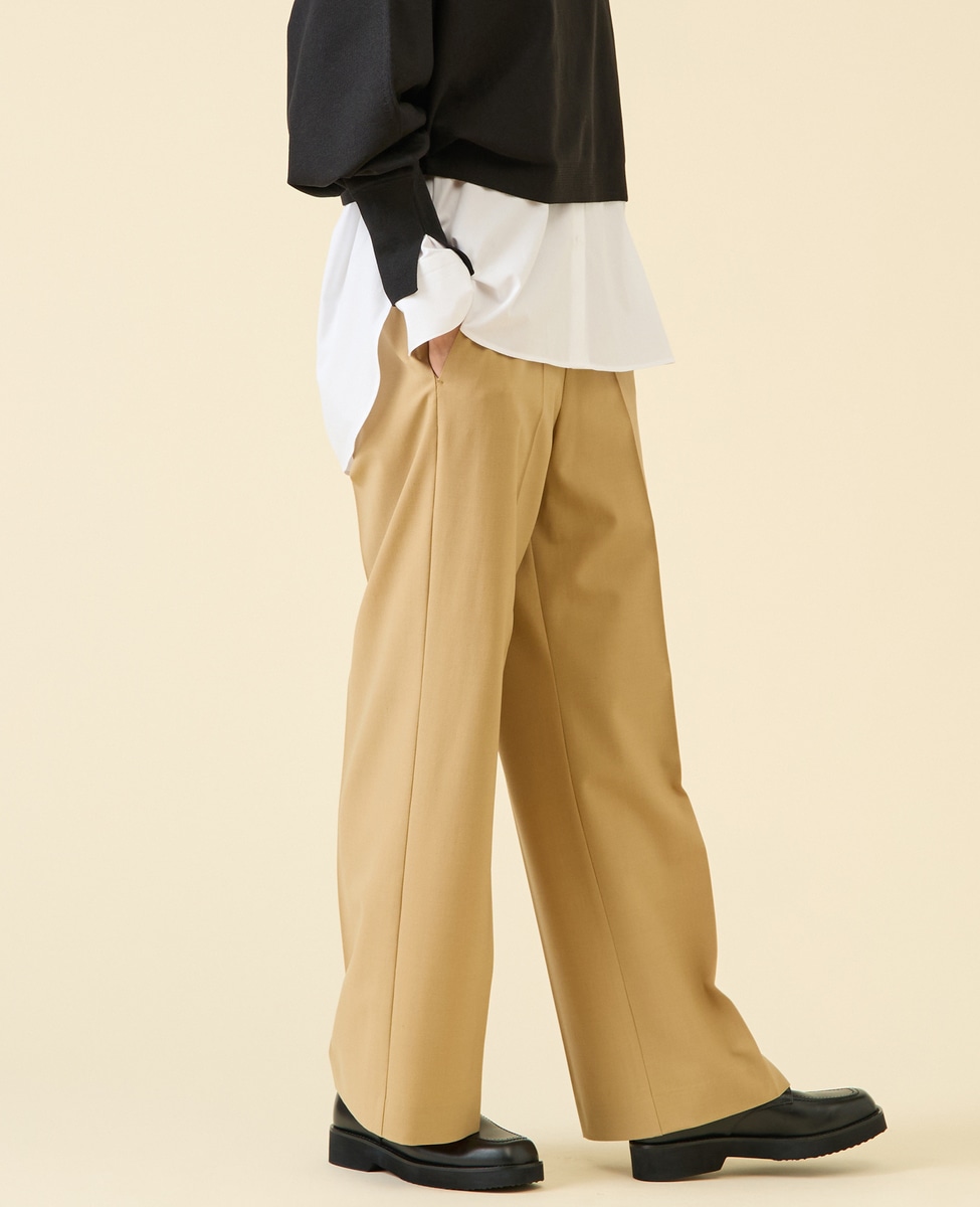 定番ダルスラブのパンツ型。センタープレスが入ったキレイめワイドパンツ。サイドファスナーのバックゴム仕様なので着用感もよいのがポイント。ゴム仕様ですがヒップが膨らみすぎないバランス感に。
