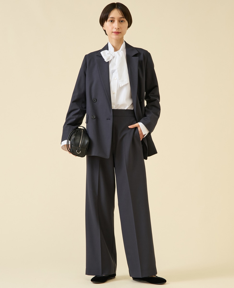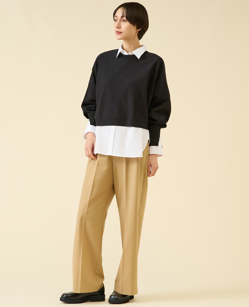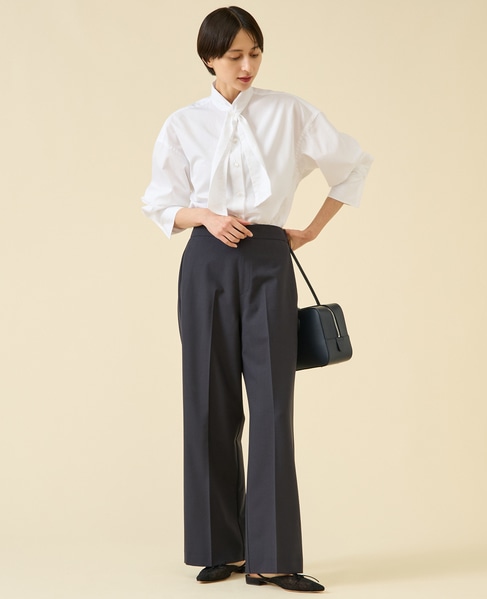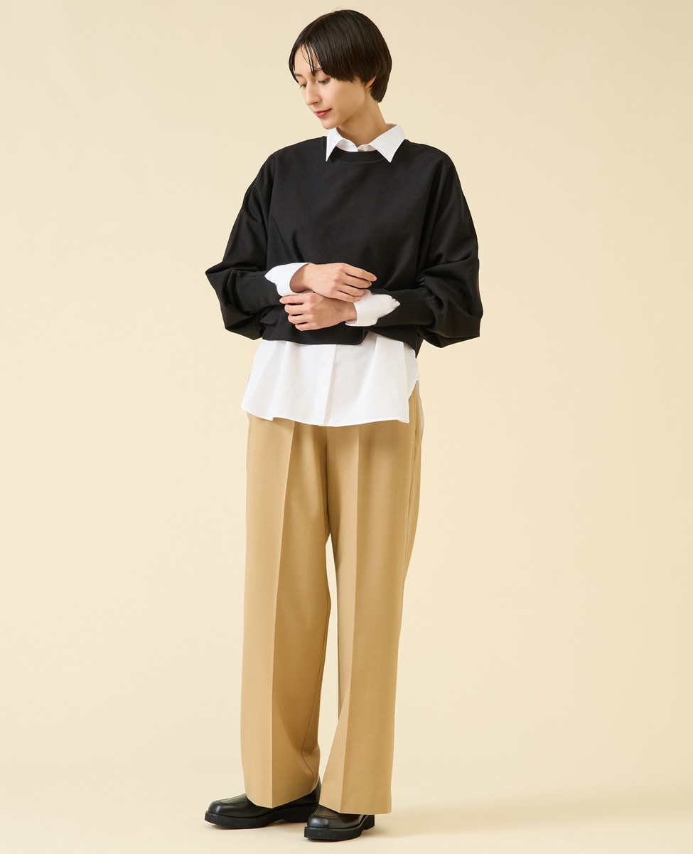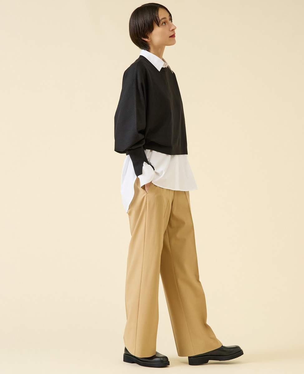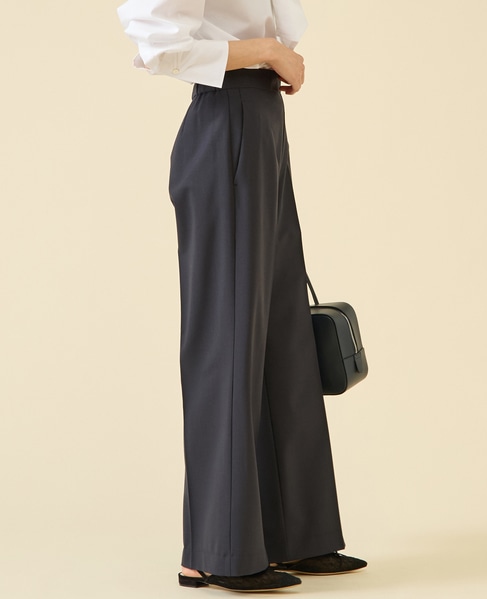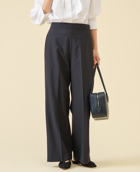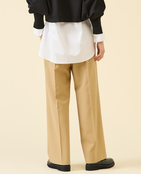 定番ダルスラブのパンツ型。センタープレスが入ったキレイめワイドパンツ。サイドファスナーのバックゴム仕様なので着用感もよいのがポイント。ゴム仕様ですがヒップが膨らみすぎないバランス感に。