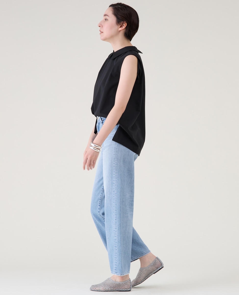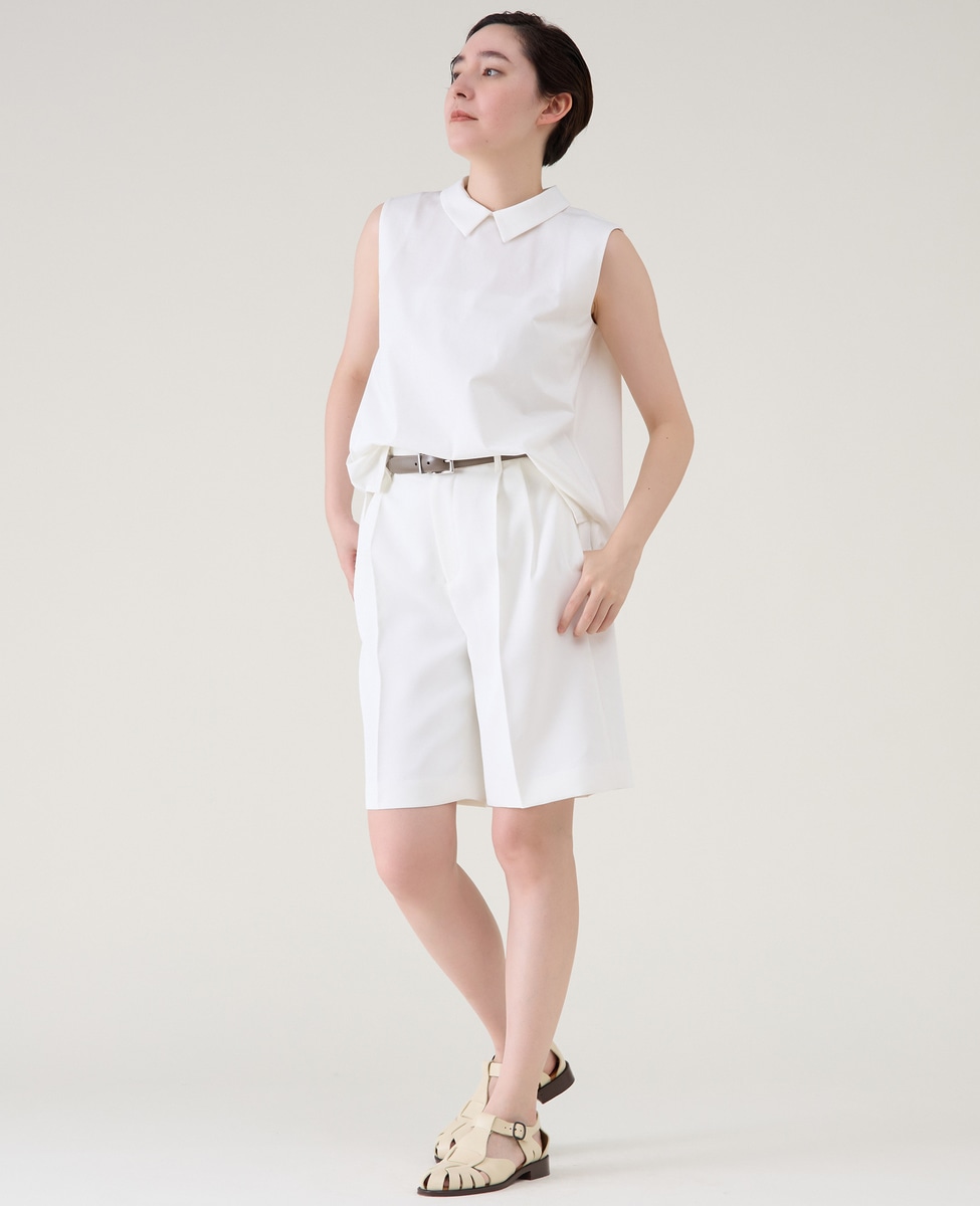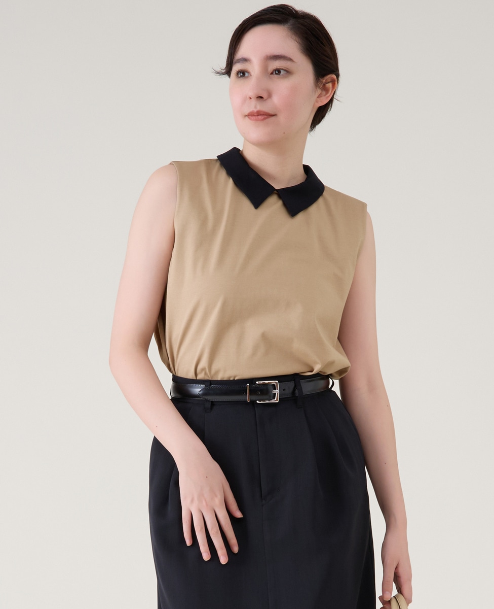 衿付きなのでカジュアルになりがちな夏の装いにきちんと感が加わります。フレンチスリーブなので脇周りの気になる部分は隠しつつ、涼し気な印象です。