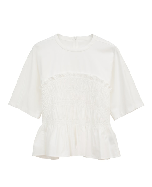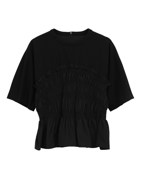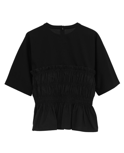 トレンドのシャーリングテクニックのコンビネーションTシャツ。Tシャツ見えするので、甘くなり過ぎない大人のデザインTOPです。
