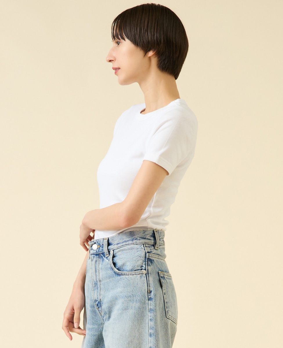 コアコレクションより、フィッティドショートスリーブTsh、Car Tee。ラウンドネックのバインダーと背中のカットオフシームが特徴です。ミディアムウェイトで程よく肉厚があるため透けにくく、伸縮性もあり、快適な着用感です。新色のMushroomベージュ。