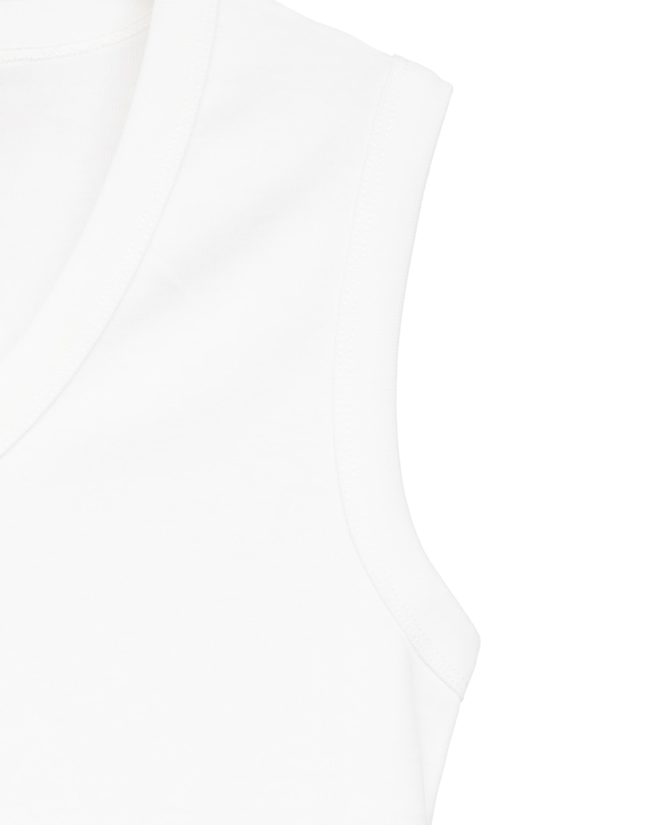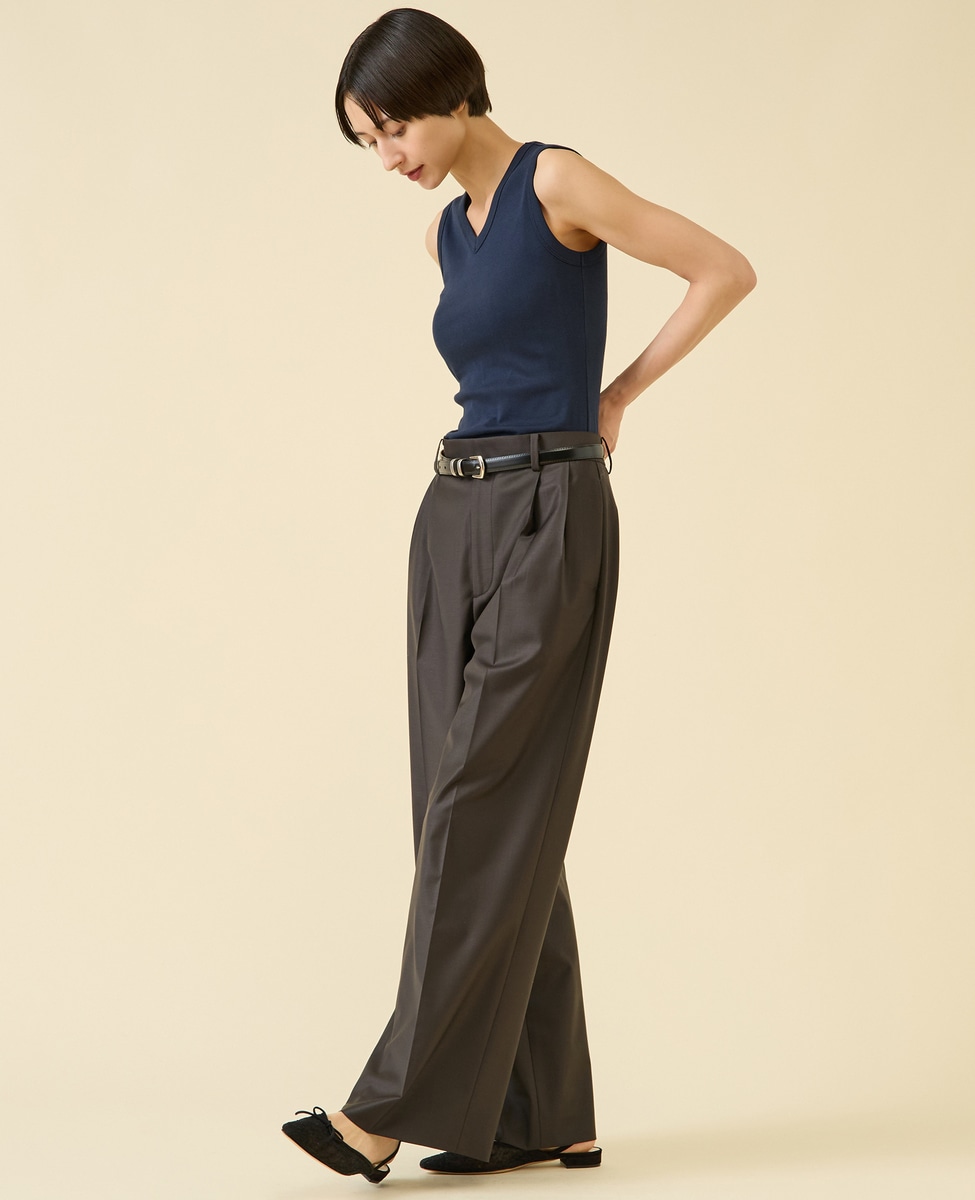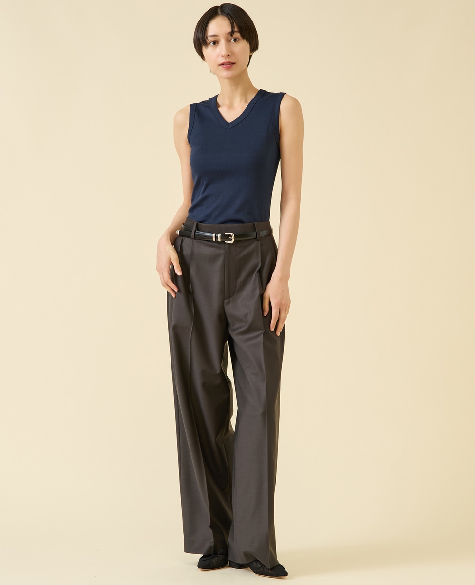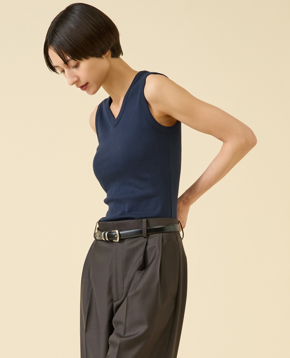 V/Nタンクトップ、JILL TANK。アクセサリーも映えそうな、程よい開きのVネックと背中のカットオフシームが特徴です。ミディアムウェイトで程よく肉厚があるため透けにくく、伸縮性もあり、快適な着用感です。