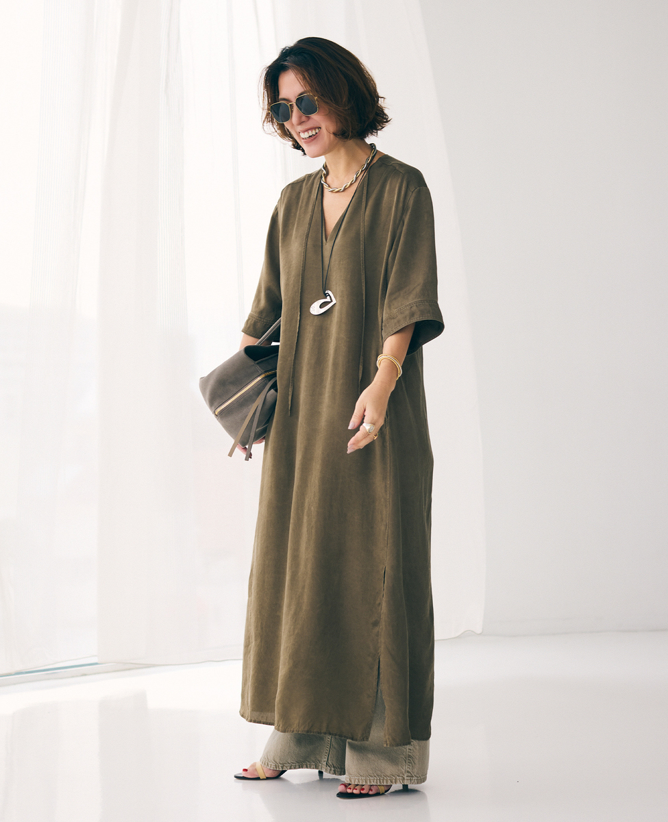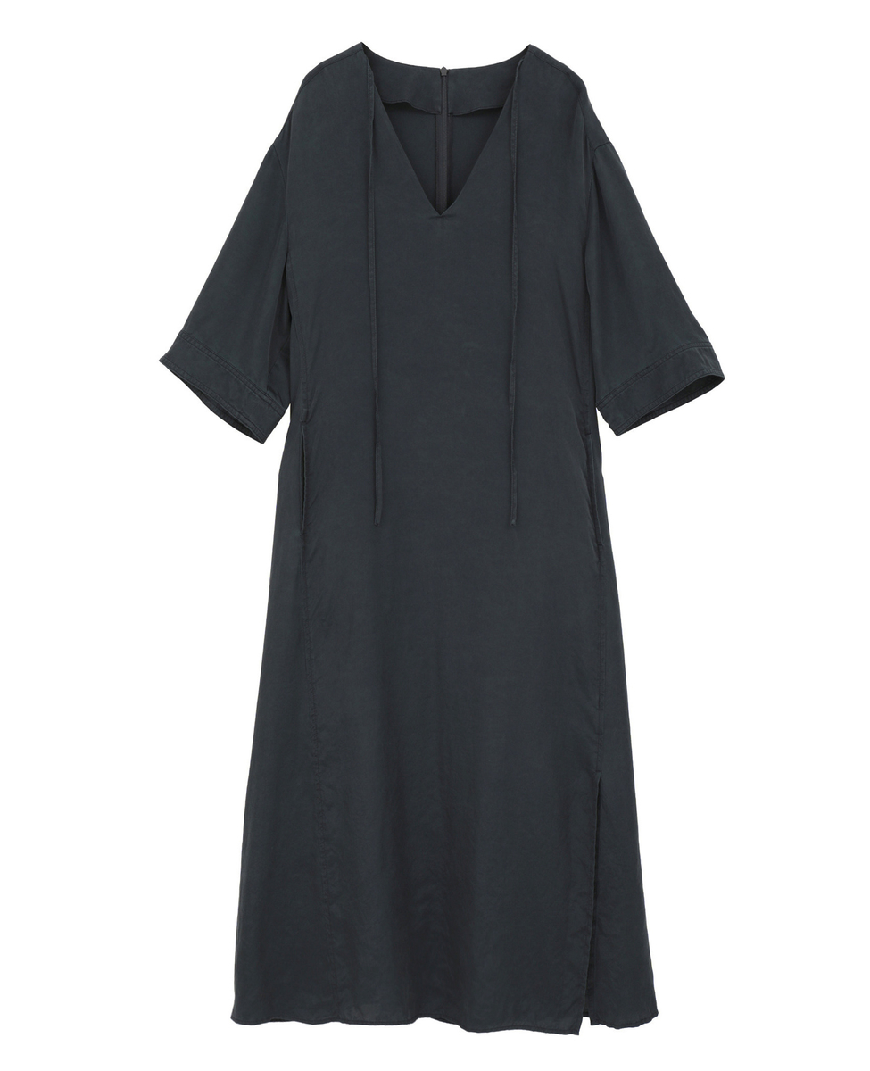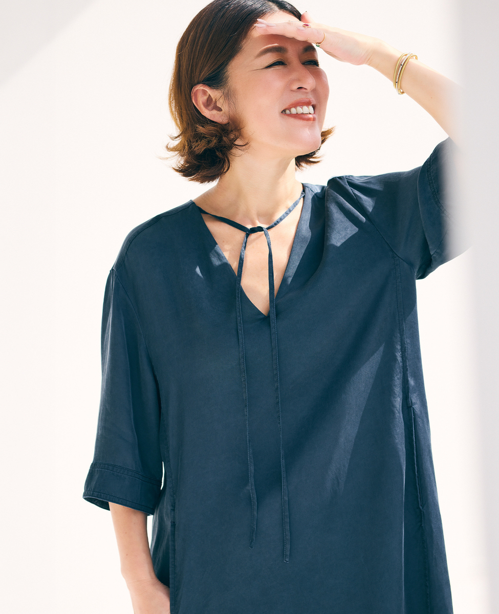 すっきりとした印象のVネック開きと、体のラインを拾いすぎないストレートシルエットが大人のバランス。ウエストの切り替えからは共布のリボンをあしらい、結び方次第でシルエットのアレンジが楽しめるデザインに仕上げました。肩はやや落としたリラックス感のあるラインに設定し、袖丈は肘にかかる長さで上品な印象に。袖には片側のみスリットを入れ、さりげない抜け感をプラスしています。
