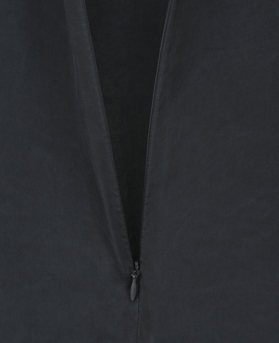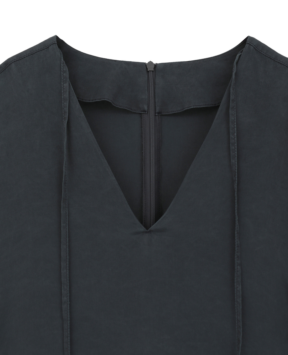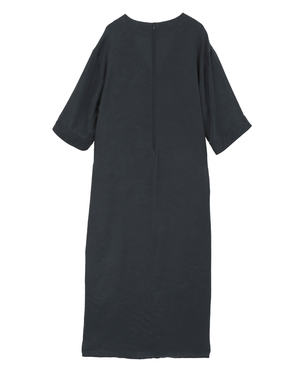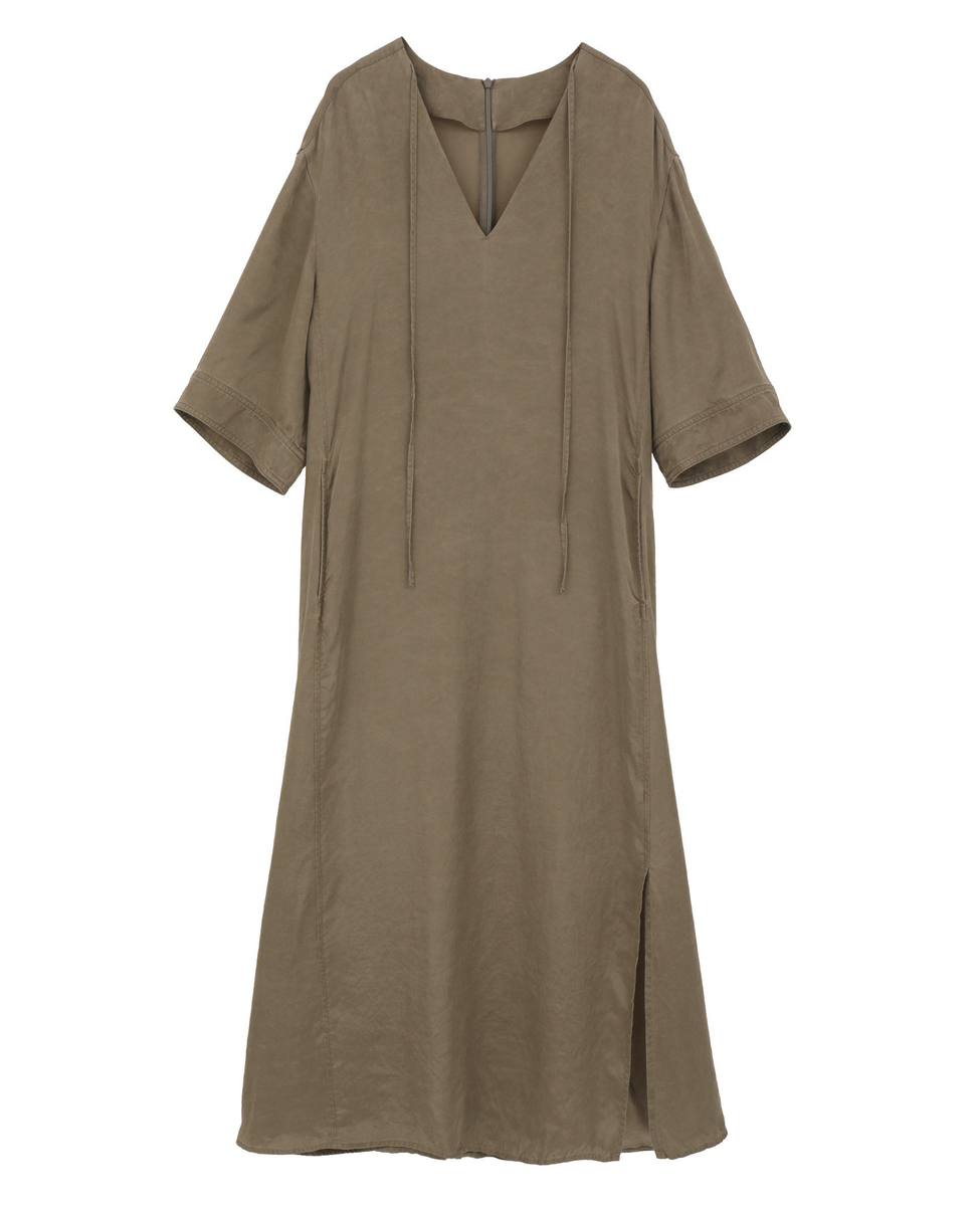すっきりとした印象のVネック開きと、体のラインを拾いすぎないストレートシルエットが大人のバランス。ウエストの切り替えからは共布のリボンをあしらい、結び方次第でシルエットのアレンジが楽しめるデザインに仕上げました。肩はやや落としたリラックス感のあるラインに設定し、袖丈は肘にかかる長さで上品な印象に。袖には片側のみスリットを入れ、さりげない抜け感をプラスしています。