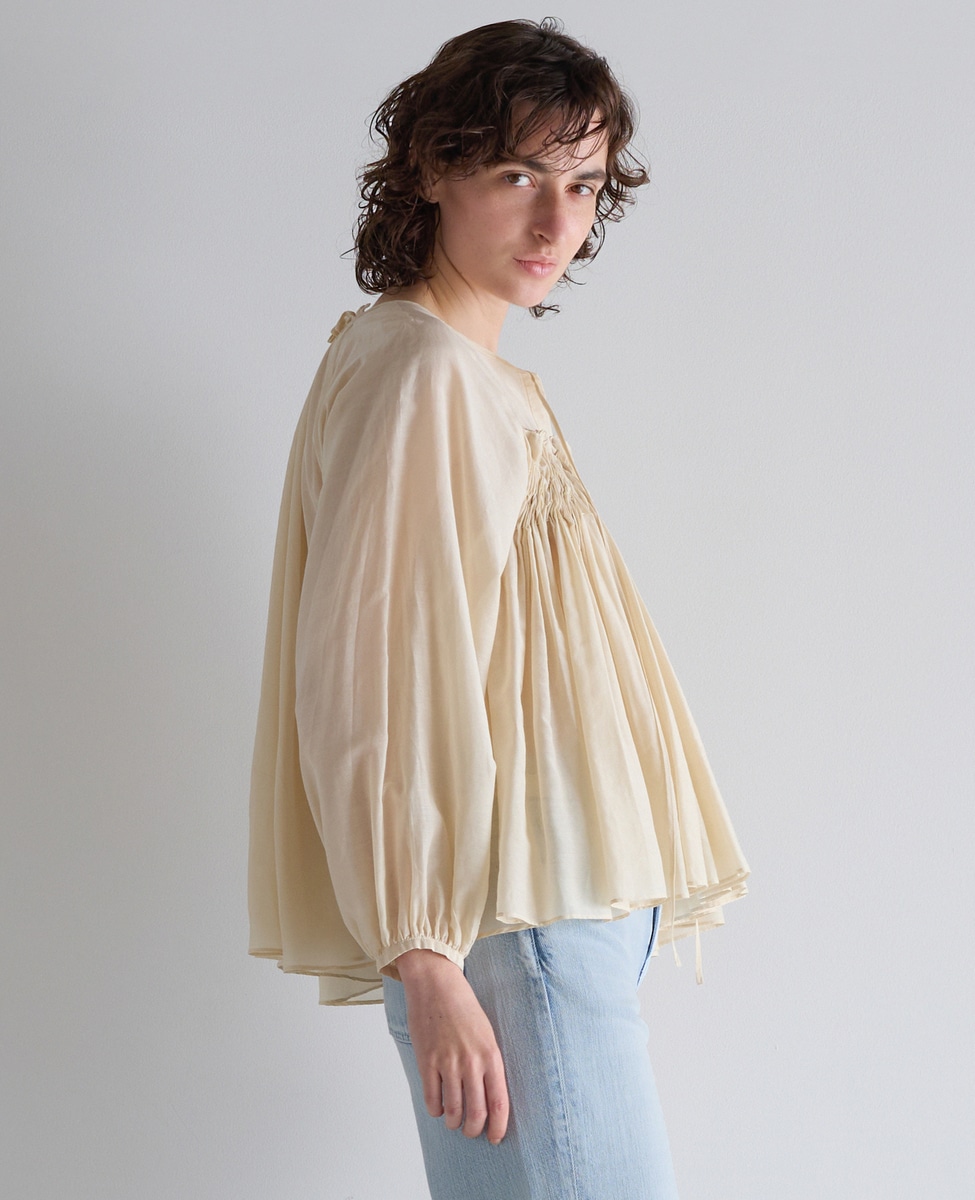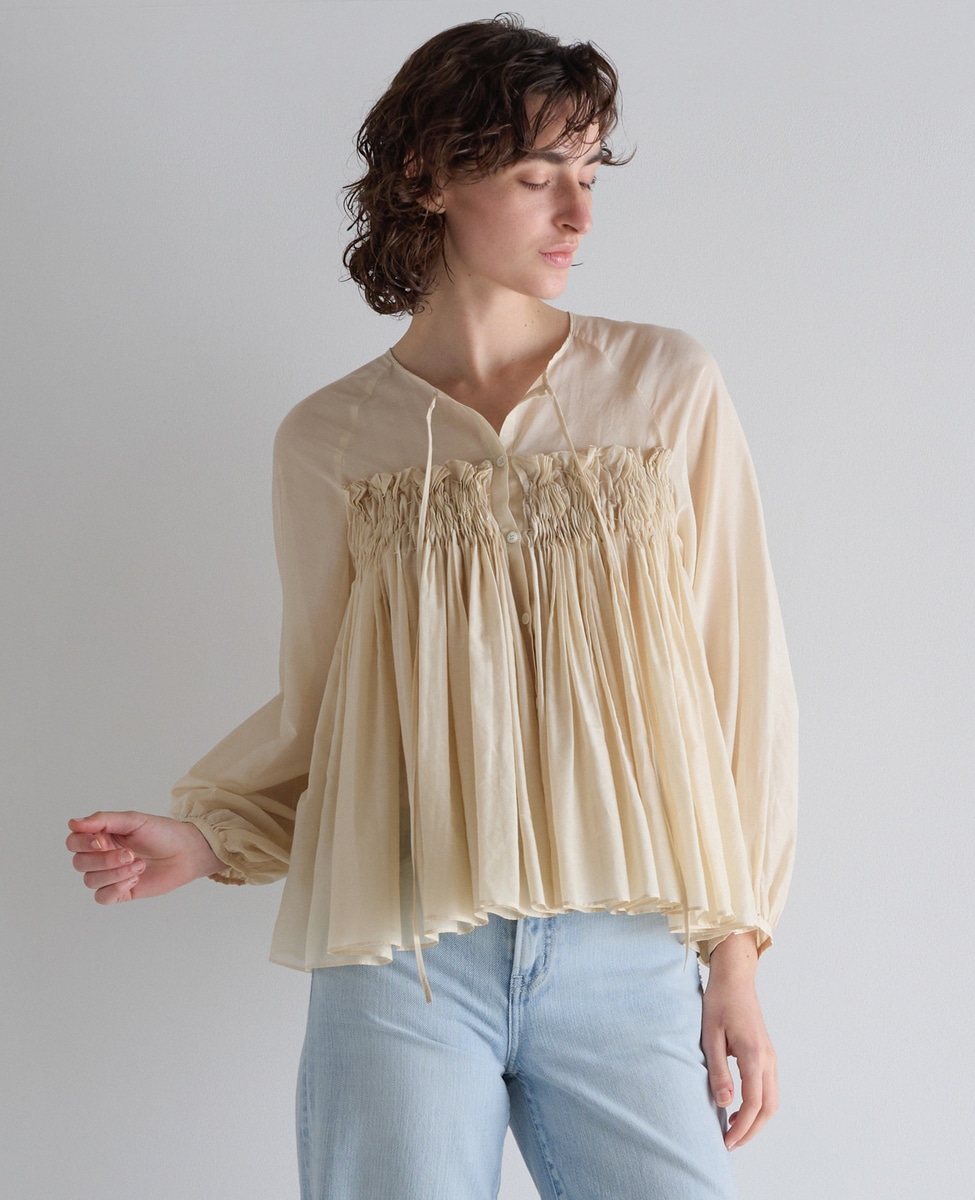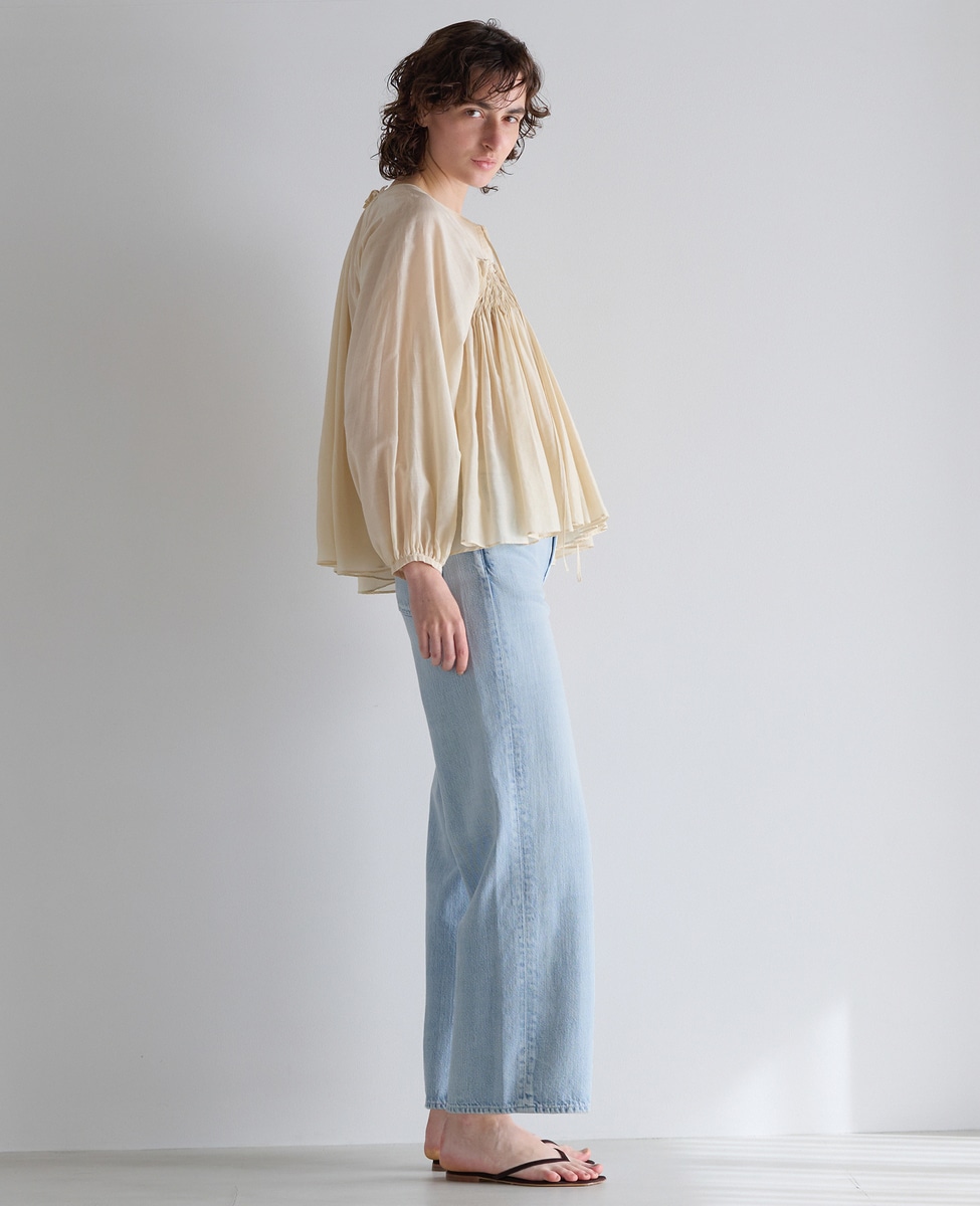 繊細なぐし縫いプリーツが表情を添える、存在感のあるデザインブラウス。フロントに施したぐし縫いプリーツが、立体感とやわらかな動きを演出。シンプルながらも印象に残るデザインに仕上げました。後ろ身頃にはゴムギャザーを入れ、たっぷりと分量を取ることで、身体のラインを拾いにくいリラックスした着心地を実現。動くたびに空気を含むようなふんわりとしたシルエットが魅力です。一枚で着映えし、パンツにもスカートにも合わせやすい、大人のデイリースタイルに活躍するブラウスです。