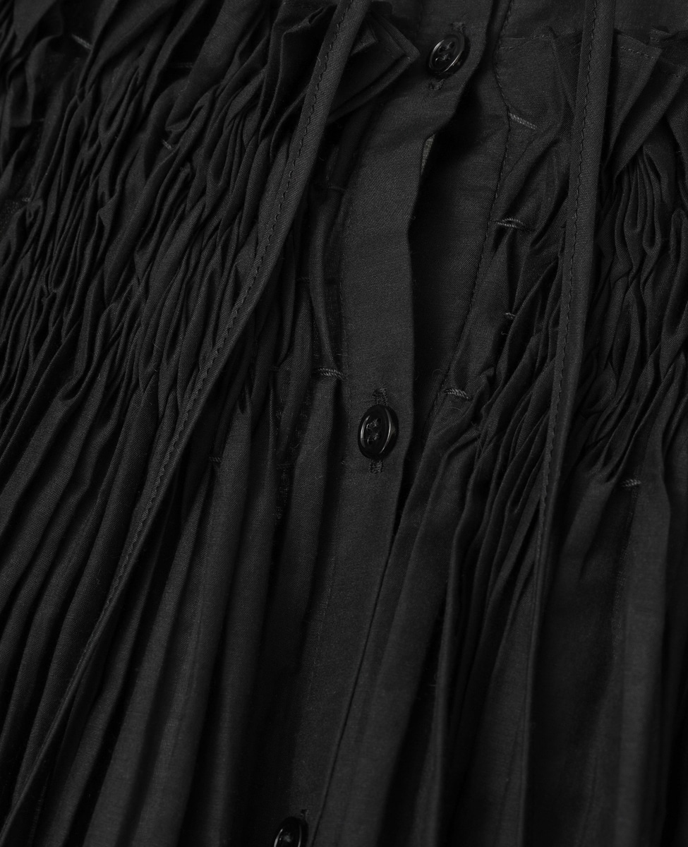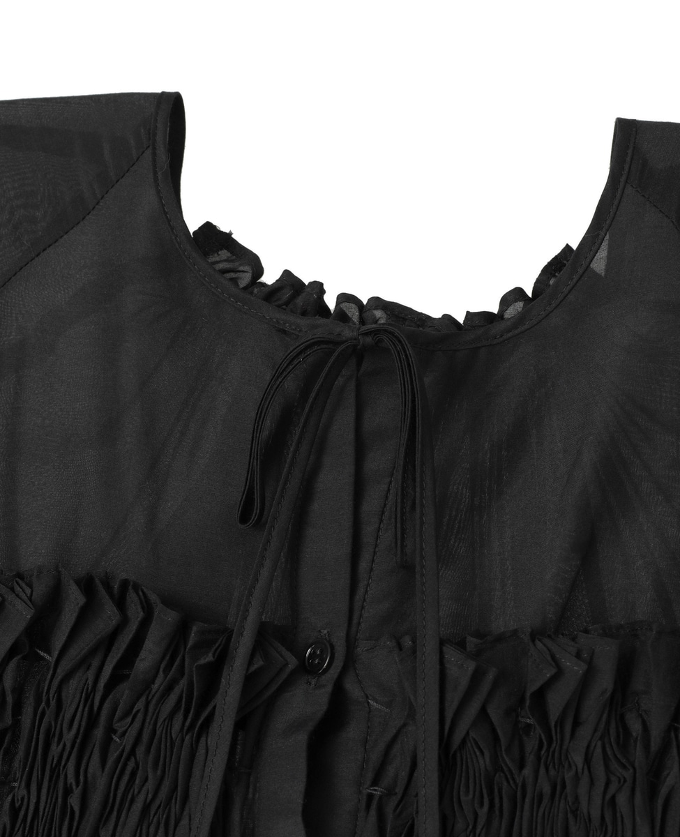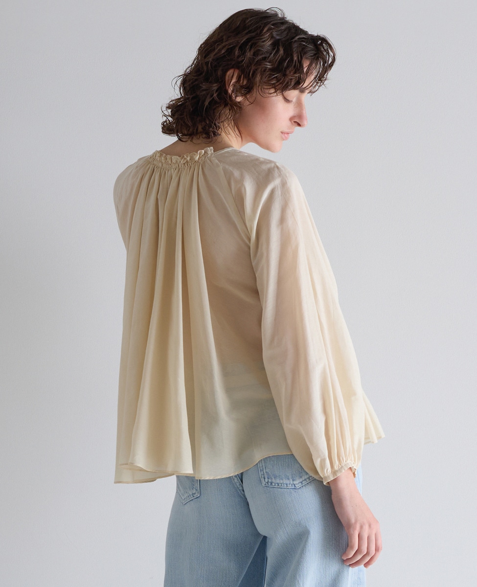繊細なぐし縫いプリーツが表情を添える、存在感のあるデザインブラウス。フロントに施したぐし縫いプリーツが、立体感とやわらかな動きを演出。シンプルながらも印象に残るデザインに仕上げました。後ろ身頃にはゴムギャザーを入れ、たっぷりと分量を取ることで、身体のラインを拾いにくいリラックスした着心地を実現。動くたびに空気を含むようなふんわりとしたシルエットが魅力です。一枚で着映えし、パンツにもスカートにも合わせやすい、大人のデイリースタイルに活躍するブラウスです。