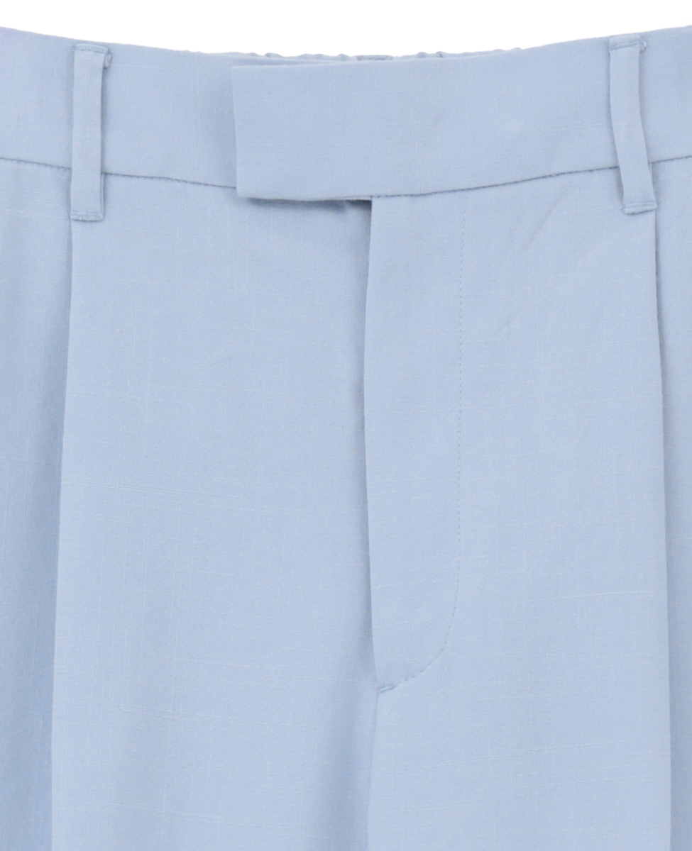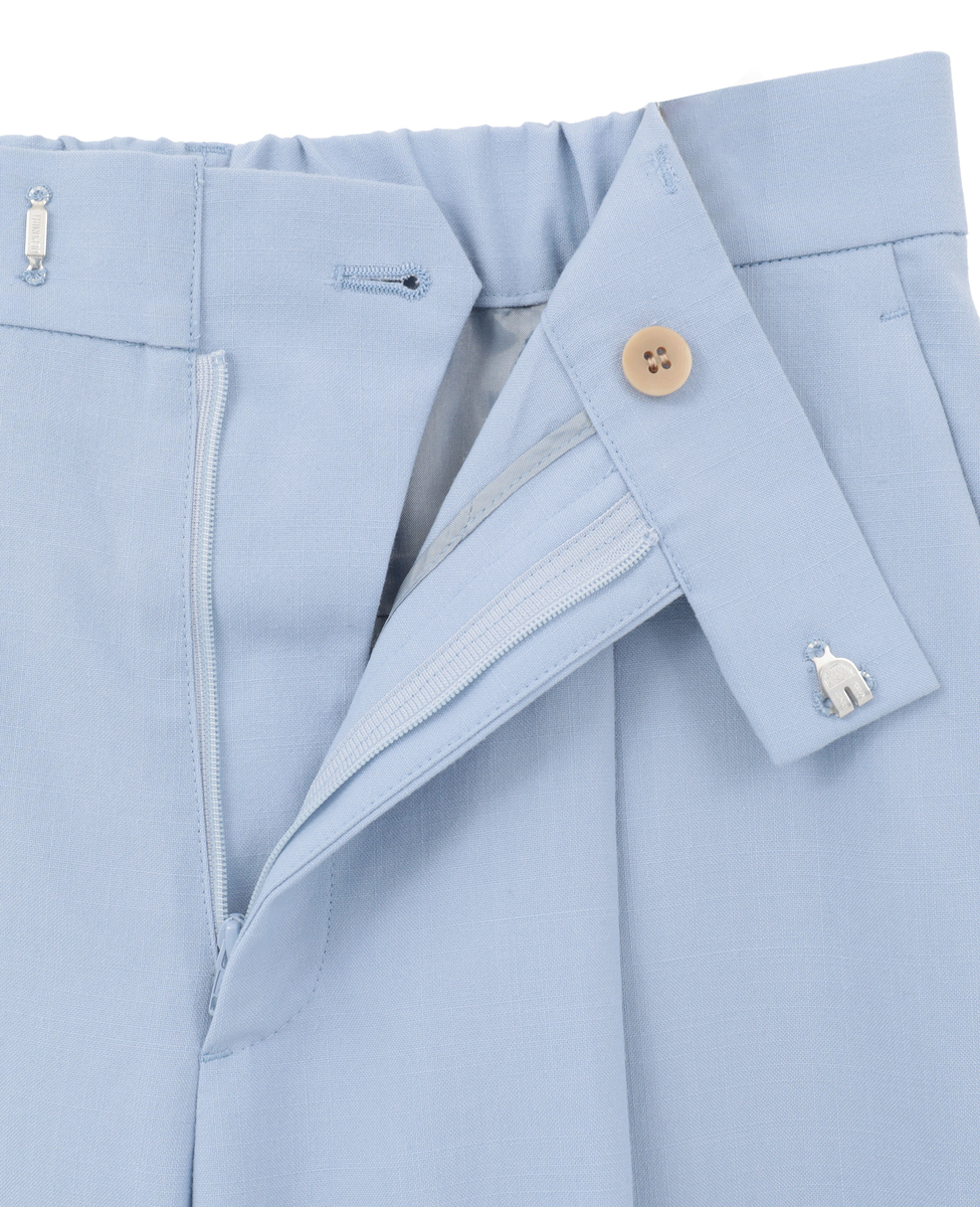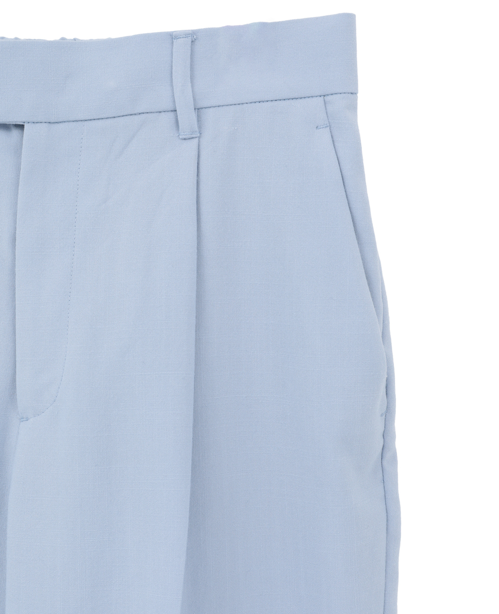 同素材のジャケットと合わせられる セットアップ仕様で、ワンタックを入れたた上品さと快適さを両立したストレートシルエットが特徴です。フロントはすっきりとした印象を保ちながら、 ウエスト後ろ部分のみゴム仕様(バックゴム)にすることで、見た目のきちんと感を損なわずに快適な履き心地を実現しています。脚のラインをまっすぐ美しく見せる センタープレスが施されており、縦のラインが強調されることで、脚長効果と全体のシャープな印象を演出。オフィスシーンからフォーマル・セミフォーマル、またはきれいめのデイリースタイルまで、幅広い場面で活躍するデザインです。