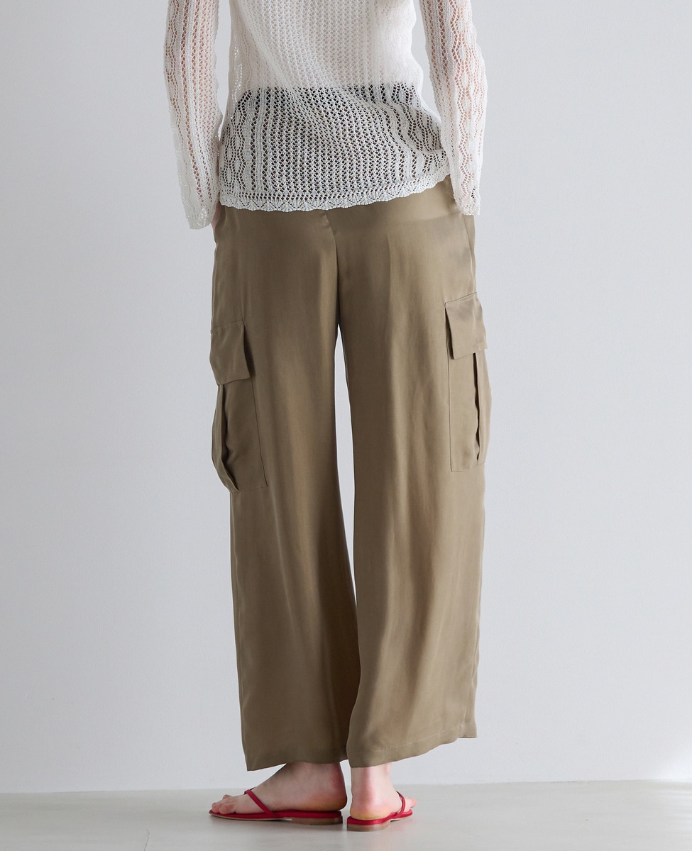 今季注目のカーゴパンツをとろみと落ち感のある素材で大人っぽく仕上げました。ウエストの後ろはゴムでイージー仕様になっています。