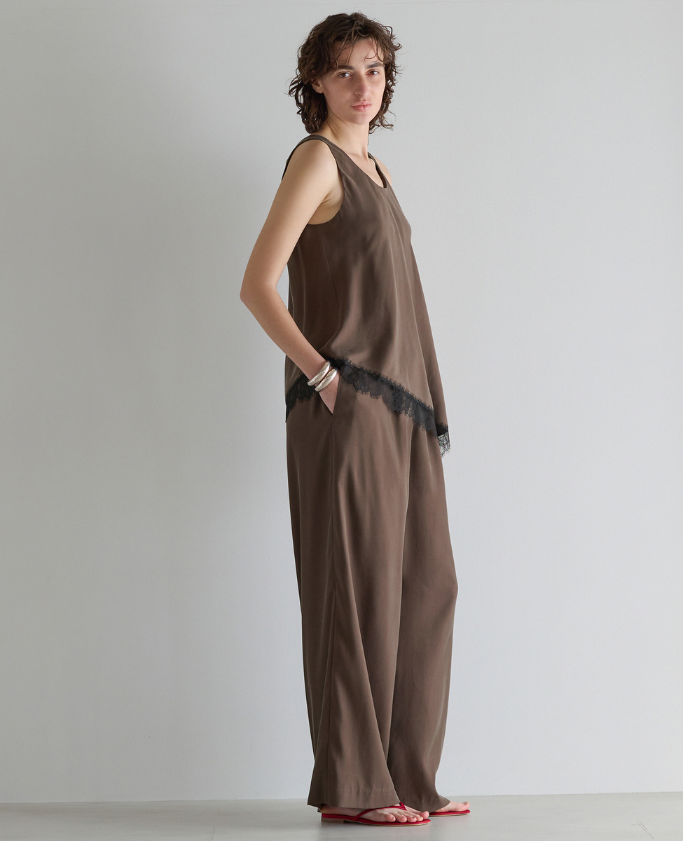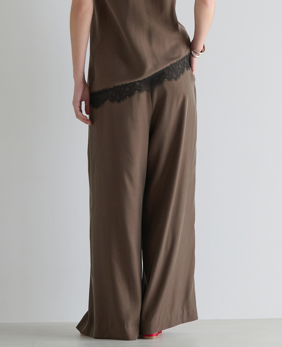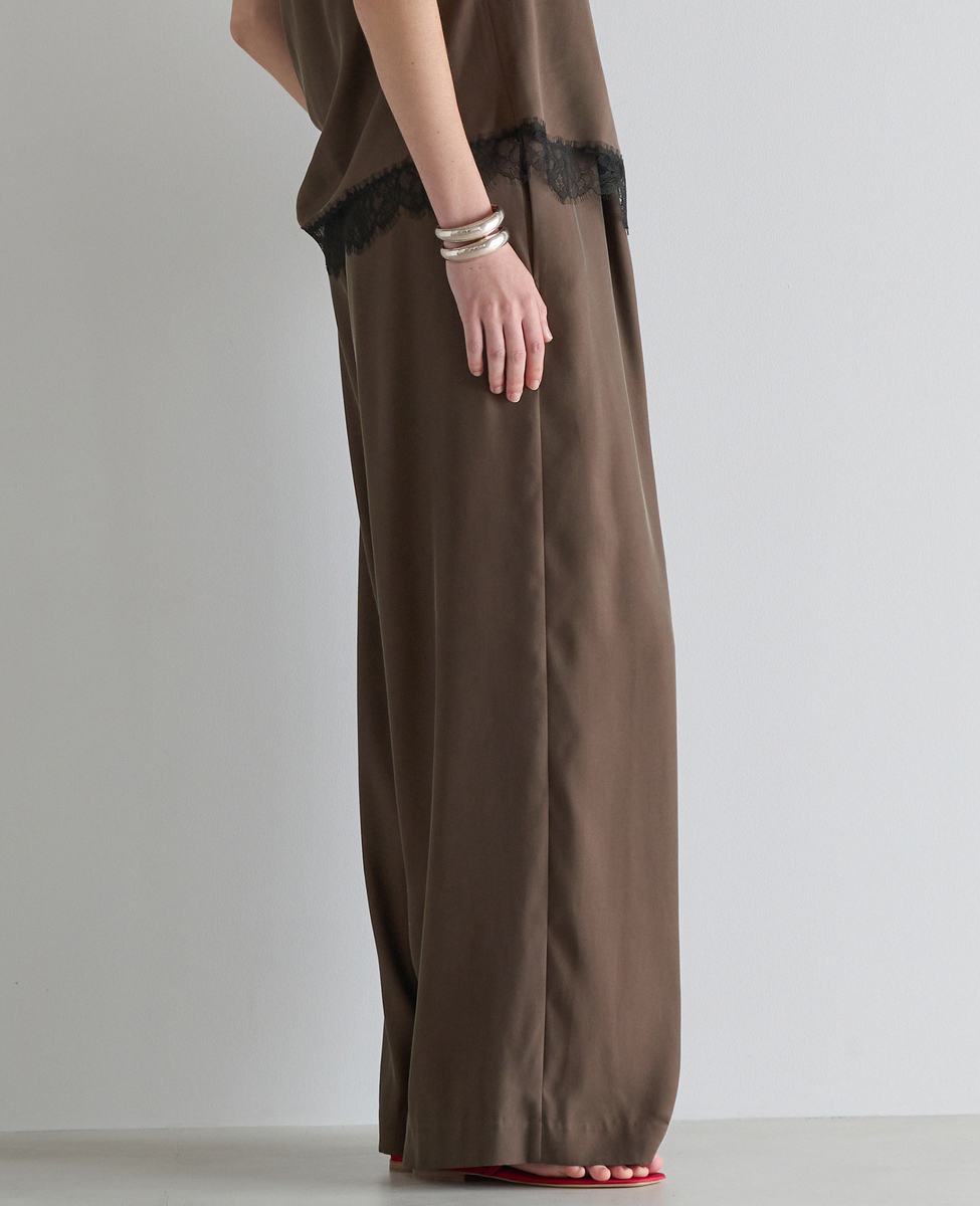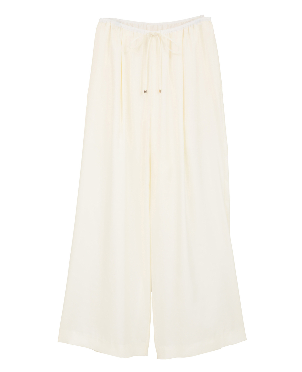 緩めのセミワイドシルエットパンツです。ウエストには華奢な共紐があしらわれているのがポイントです。